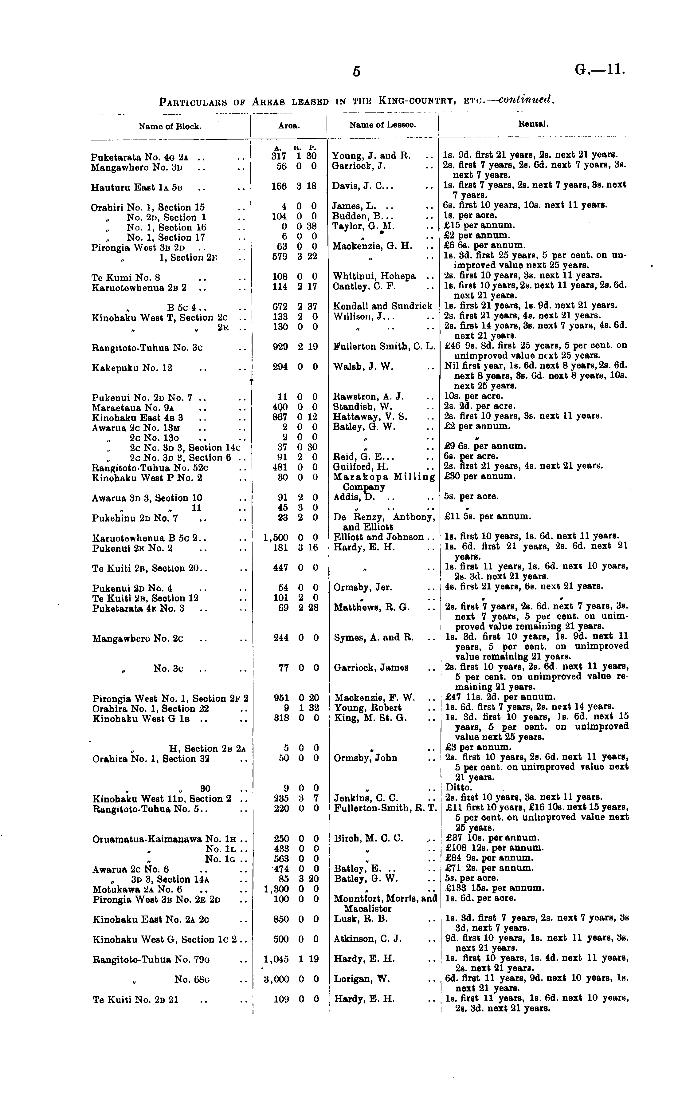 Name of Block. Area. Name 01 MM <enta] LI. Puketarata No. 4o 2a .. Mangawhero No. 3d A. K. P. 317 1 30 5G 0 0 Young, J. and 11. Garriock, J. Is. 9d. first 21 years, 2s. uext 21 years. 2s. first 7 years, 2s. 6d. next 7 years, 3s. next 7 years. Is. first 7 years, 2s. next 7 years, 3s. next 7 years. 6s. first 10 years, 10e. next 11 years. Is. per acre. £15 per annum. £2 per annum. £0 Gs. per annum. Is. 3d. first 25 years, 5 per cent, on unimproved value next 25 years. 2s. first 10 years, 3s. next 11 years. Is. first 10 years, 2s. next 11 years, 2s. 6d. next 21 years. Iβ. first 21 years, Is. 9d. next 21 years. 2s. first 21 years, 4s. next 21 years. 2s. first 14 years, 3s. next 7 years, 4s. 6d. next 21 years. £4G Us. 8d. first 25 years, 5 per cent, on unimproved value next 25 yoars. Nil first year, Is. 6d. next 8 years, 2s. 6d. next 8 years, 3s. Gd. next 8 years, 10s. next 25 years. 10s. per acre. 2s. 2d. per acre. 3», lirst 10 years, 3s. next 11 years. £2 per annum. Hauturu East Iα 5b 166 3 18 Davis, J. C... Orahiri No. 1, Section 15 No. 2i), Section 1 No. 1, Section 16 No. 1, Section 17 Pirongia West 3b 2d 1, Section 2e 4 0 0 104 0 0 0 0 38 6 0 0 63 0 0 579 3 22 James, L. .. Budden, B. .. Taylor, G. M. Mackenzie, G. H. Tc Kumi No. 8 Karuotcwhenuii 2b 2 108 0 0 114 2 17 Whitinui, Hohepa .. Cantley, C. P. B 5c 4 .. Kinohaku West T, Section 2c .. 2e .. 672 2 37 133 2 0 130 0 0 Kendall and Sundrick Willison, J... Rangitoto-Tuhua No. 3c 929 2 19 Fullerton Smith, C. L. Kakepuku No. 12 294 0 0 Walsh, J. W. Pukonui No. 2u No. 7 .. Maraetaua No. 'Jα Kinohaku East 4b 3 Awarua 2c No. 13m 2c No. 13o 2c No. 3d 3, Section Me 2c No. 3d 3, Section 6 .. liangitoto-Tuhua No. 52c Kinohaku West P No. 2 11 0 0 400 0 0 867 0 12 2 0 0 2 0 0 37 0 30 91 2 0 481 0 0 30 0 0 Kawstron, A. J. Standish, W. Hattaway, V. S. Batley, G. W. H ■ • Reid, G. E... '.'. Guilford, H. Marakopa Milling Company Addis, D. .. £9 Gs. per annum. 6s. per acre. 2s. first 21 years, 4s. next 21 years. £30 per annum. Awarua 3d 3, Section 10 11 Pukehinu 2d No. 7 91 2 0 45 3 0 23 2 0 5s. per acre. De Renzy, Anthony, and Elliott Elliott and Johnson .. Hardy, E. H. £11 5s. per annum. Karuotewhenua B 5c 2.. Pukenui 2k No. 2 1,500 0 0 181 3 16 Iβ. first 10 years, Is. Gd. next 11 years. Is. 6d. first 21 years, 2s. 6d. next 21 Te Kuiti 2b, Section 20.. 447 0 0 years. Is. first 11 years, Is. 6d. next 10 yoars, 2s. 3d. next 21 years. 4s. first 21 years, 6s. next 21 years. Pukenui 2d No. 4 Te Kuiti 2b, Section 12 Puketarata 4k No. 3 54 0 0 101 2 0 69 2 28 Ormsby, Jer. Mangawhero No. 2c No. 3c Pirongia West No. 1, Section 2f 2 Orahira No. 1, Section 22 Kinohaku West G Iβ .. H, Section 2b 2a Orahira No. 1, Section 32 244 0 0 77 0 0 951 0 20 9 1 32 318 0 0 5 0 0 50 0 0 Matthews, R. G. Symes, A. and B. Garriock, James Maokenzie, F. W. Young, Robert King, M. St. G. Ormsby, John n it 2e. first 7 years, 2s. 6d. noxt 7 years, 3s. next 7 years, 5 per cent, on unimproved value remaining 21 years. Is. 3d. first 10 years, Is. 9d. next 11 years, 5 per oent. on unimproved value remaining 21 years. 2s. first 10 years, 2s. 6d. next 11 years, 5 per cent, on unimproved value remaining 21 years. £47 11s. 2d. per annum. Is. 6d. first 7 years, 2s. next 14 years. Is. 3d. first 10 years, Is. 6d. next 15 years, 5 per cent, on unimproved value next 25 years. £3 per annum. 2s. first 10 years, 2s. 6d. next 11 years, 5 per oent. on unimproved value next 21 years. Ditto. 2b. first 10 years, 3s. next 11 years. £11 first 10 years, £16 10s. next 15 years, 5 per cent, on unimproved value next 25 years. £37 10s. per annum. £108 12s. per annum. £84 9s. per annum. £71 2s. per annum. 5s. per acre. £133 15s. per annum. Is. 6d. per acre. ,,30 Kinohaku West llu, Section 2 .. Rangitoto-Tuhua No. 5.. 9 0 0 235 3 7 220 0 0 Jenkins, C. C. Fullerton-Smith.R. T. Oruamatua-Kaimanawa No. In .. No. 1l .. No. 1g .. Awarua 2c No. 6 3d 3, Section 14a Motukawa 2a No. G Pirongia Wost 3b No. 2e 2d 250 0 0 433 0 0 563 0 0 474 0 0 85 3 20 1,300 0 0 100 0 0 Birch, M. C. 0. Batley, E. .. Batley, G. W. Mountfort, Morris, and Maoalistcr Lusk, R. B. Kinobaku East No. 2a 2c Kinohaku West G, Section lc 2 .. Rangitoto-Tuhua No. 79q 850 0 0 500 0 0 1,045 1 19 Atkinson, C.J. Hardy, E. H. Is. 3d. first 7 years, 2s. next 7 years, 3s 3d. next 7 years. 9d. first 10 years, Is. noxt 11 years, 3s. next 21 years. Is. first 10 years, Is. Id. next 11 years, 2s. next 21 years. 6d. first 11 years, 9d. next 10 years, Is. next 21 years. Iβ. first 11 years, Is. 6d. next 10 years, 2s. 3d. next 21 years. No. 68g 3,000 0 0 Lorigan, W. To Kuiti No. 2b 21 109 0 0 Hardy, E. H.