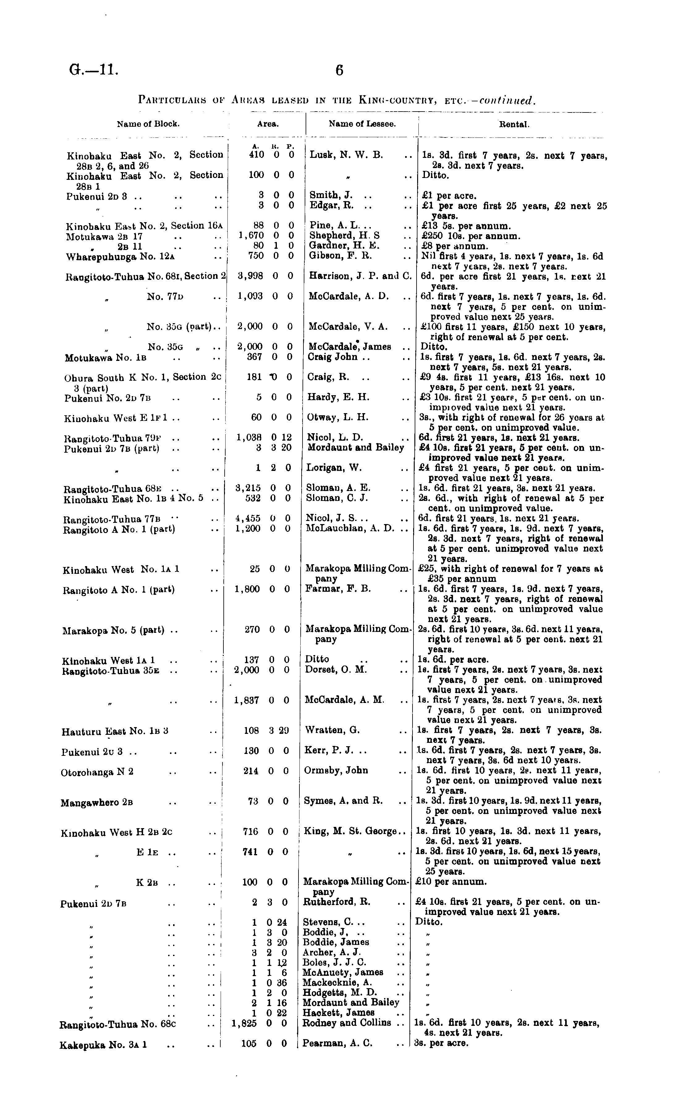 Name of Block. Area. Name of Lessee. Rental. Kinobaku East No. 2, Section 28b 2, 6, and 2G Kinohaku East No. 3, Section 28b 1 Pukenui 2d 3 .. a. it. r. 410 0 0 Lusk, N. W. B. Is. 3d. first 7 years, 2s. next 7 years, 2e. 3d. next 7 years. Ditto. 100 0 0 3 0 0 3 0 0 Smith, J. .. Edgar, R. .. £1 per acre. £1 per acre first 25 years, £2 next 25 years. £13 5s. per annum. £250 10s. per annum. £8 per annum. Nil first 4 years, Is. next 7 years, Is. 6d next 7 years, 2s. next 7 years. 6d. per acre first 21 years, Is. rext 21 years, (id. first 7 years, Is. next 7 years, Is. 6d. next 7 years, 5 per cent, on unimproved valuo next 25 years. £100 first 11 years, £150 next 10 years, right of renewal at 5 per cent. Ditto. Is. first 7 years, Is. Od. next 7 years, 2s. next 7 years, 5s. next 21 years. £9 4s. first 11 years, £13 16s. noxt 10 years, 5 per cent, next 21 years. £3 10s. first 21 yeare, 5 par cent, on unimproved value next 21 years. 3s., with right of renewal for 26 years at 5 per cent, on unimproved value. Cd. first 21 years, Is. next 21 years. £4 10s. first 21 years, 5 per cent, on unimproved value next 21 yearn. £4 first 21 years, 5 per cent, on unimproved value next 21 years. Is. 6d. first 21 years, 3s. next 21 years. 2s. 6d., with right of renewal at 5 per cent, on unimproved value, •id. first 21 years, Is. next 21 years. Is. 6d. first 7 years, Is. 9d. next 7 years, 2s. 3d. next 7 years, right of renewal at 5 per cent, unimproved value next 21 years. £25, with right of renewal for 7 years at £35 per annum Iβ. 6d. first 7 years, Is. 9d. next 7 years, 2s. 3d. next 7 years, right of renewal at 5 per cent, on unimproved value next 21 years. 2s. Gd. first 10 years, 3s. lid. next 11 years, right of renewal at 5 per cent, next 21 years. Is. Gd. per acre. Is. first 7 years, 2s. next 7 years, 3s. next 7 years, 5 per cent, on unimproved value next 21 years. Is. first 7 years, 2s. next 7 yeats, 3s. next 7 years, 5 per cent, on unimproved value next 21 years. Iβ. first 7 years, 2s. next 7 years, 3s. next 7 years. Is. 6d. first 7 years, 2s. next 7 years, 3s. next 7 years, 3s. 6d next 10 years. Is. (id. first 10 years, 2e. next 11 years, 5 per cent, on unimproved value next ■21 years. Is. 3d. first 10 years, Is. 9d. next 11 years, 5 per cent, on unimproved value next 21 years. Iβ. first 10 years, Is. 3d. next 11 years, 2s. 6d. next 21 years. Is. 3d. first 10 years, Is. 6d, next 15 years, 5 per cent, on unimproved value next 25 years. £10 per annum. Kinohaku Ea*t No. 2, Section 16a Motukawa 2b 17 2b 11 WharepuhUDga No. 12a 88 0 0 1,670 0 0 80 1 0 750 0 0 Pine, A. L. .. Shepherd, H. S Gardner, H. K. Gibson, F. R. Kangitoto-Tuhua No. 68i, Section 2 3,998 0 0 Harrison, J. P. anJ C. No. 77u 1,003 0 0 McCardale, A. D. .. No. 35g (part).. 2,000 0 0 McCardale, V. A. No. 35o „ .. Motukawa No. Iβ 2,000 0 0 367 0 0 McCardale* James .. Craig John Ohura South K No. 1, Section 2c 3 (part) Pukenui No. 2d 7is 181 V 0 5 0 0 Craig, R. .. Hardy, E. H. Kinoliaku West ElFl .. 60 0 0 , Otway, L. H. Rangitoto-Tuhua 7'Jf .. Pukenui 2d 7b (part) .. 1,038 0 12 3 3 20 Nicol, L. D. Mordauut and Bailey 12 0 Lorigan, W. Rangitoto-Tuhua 68k Kinohaku East No. Iβ 4 No. 5 8,915 0 0 532 0 0 Sloman, A. E. Sloman, C. J. Rangitoto-Tuhua 77b Rangitoto A No. 1 (part) 4,455 0 0 1,200 0 0 Nicol, J. S... McLaucblan, A. D. .. Kinohaku West No. Iα 1 25 0 0 1,800 0 0 Marakopa Milling Company Farmar, F. B. Rangitoto A No. 1 (part) Marakopa No. 5 (part) 270 0 0 Marakopa Milling Company Kinohaku West Iα 1 .. Rangitoto-Tuhua 3De 137 0 0 2,000 0 0 Ditto Dorset, 0. M. 1,837 0 0 McCardale, A. M. Hauturu East No. Iβ 3 108 3 29 Wratten, G. Pukenui 2u 3 .. 130 0 0 Kerr, P. J. .. Otorolianga N 2 214 0 0 Ormeby, John Mangawhero 2b 73 0 0 Symes, A. and R. Kinohaku West H 2b 2c 716 0 0 King, M. St. George.. ElE .. 741 0 0 K 2b .. 100 0 0 Marakopa Milling Company Rutherford, R. Pukenui 2d 7b 2 3 0 £4 10s. first 21 years, 5 per cent, on unimproved value next 21 years. Ditto. 1 0 24 1 3 0 1 3 20 3 2 0 1 1 12 116 1 0 36 12 0 2 1 16 1 0 22 1,825 0 0 Stevens, C. .. Boddie, J, .. Boddie, James Archer, A. J. Boles, J. J. C. McAnuety, James Mackecknie, A. Hodgetts, M. D. Mordaunt and Bailey Haokett, James Rodney and Collins .. Rangitoto-Tuhua No. 68c Is. Gd. first 10 years, 2s. next 11 years, 4s. next 21 years. 3s. per acre. Kakepuka No. 3a 1 105 0 0 ; Pearman, A. C.