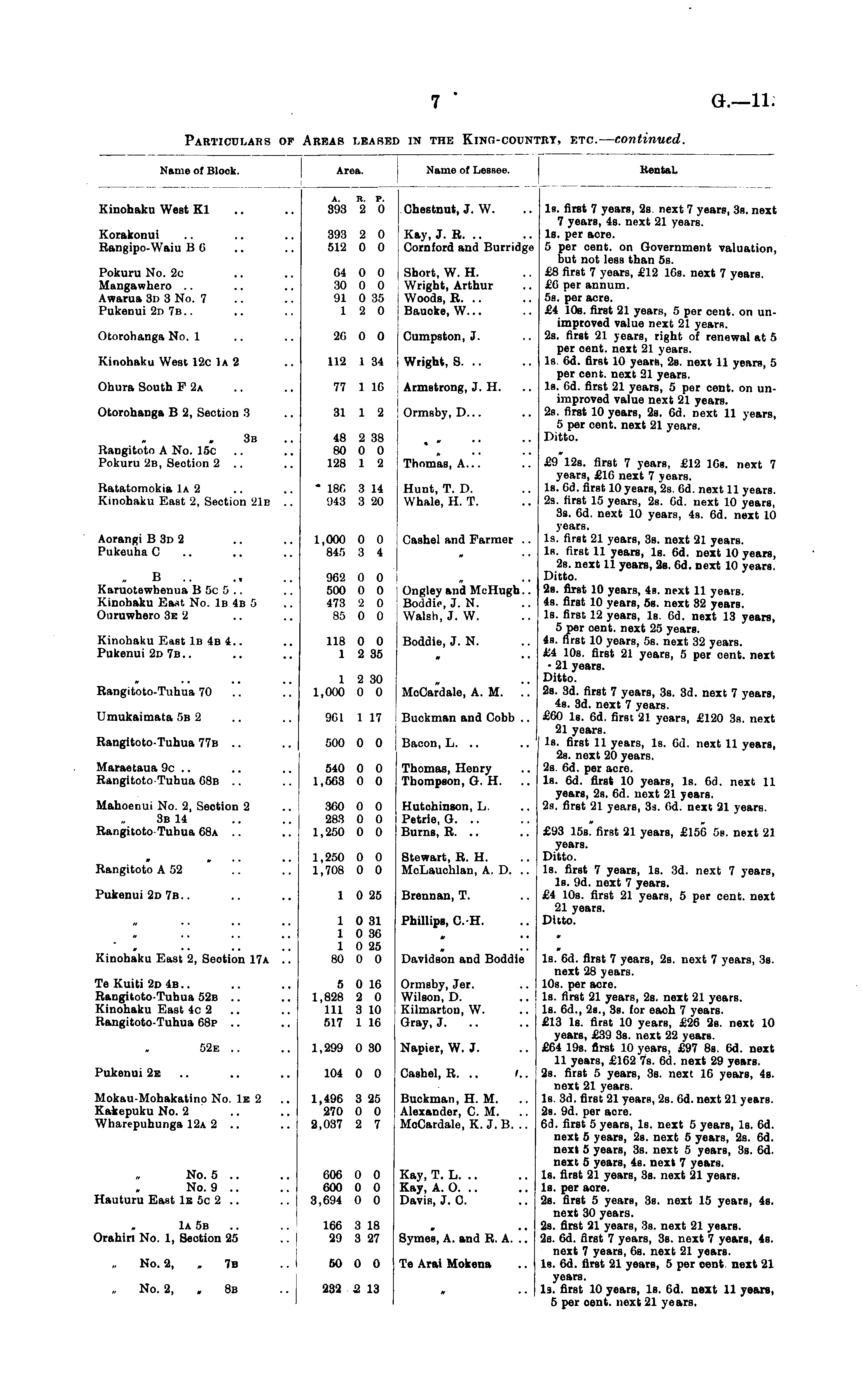 Ntme of Block. loci irea. liuno oi ■euee. lonl Kinohaku West Kl A. R. P. 393 2 0 Chestnut, J. W. Iβ. firet 7 years, 2s next 7 years, 3r. next 7 years, 4s. next 21 years. Is. per acre. ! 5 per cent, on Government valuation, but not less than 5s. £8 first 7 years, £12 lGs. next 7 years. £G per annum. 5s. per acre. £4 10s. first 21 years, 5 per cent, on unimproved value next 21 years. 2s. first 21 years, right of renewal at 5 per cent, next 21 years. Is. 6d. first 10 years, 2s. next 11 years, 5 per cent, next 21 years. Iβ. Gd. first 21 years, 5 per cent, on unimproved value next 21 years. 2s. first 10 years, 2s. Gd. next 11 years, 5 per cent, next 21 years. Ditto. Korakonui Rangipo-Waiu B G 393 2 0 512 0 0 Kay, J. R. .. Cornford and Burridge Pokuru No. 2c Mangawhero Awarua 3d 3 No. 7 Pukenui 2n 7b. . G4 0 0 30 0 0 91 0 35 12 0 Short, W. H. Wright, Arthur Woods, R. .. Baucke, W... Otorohanga No. 1 2(1 0 0 Cumpston, J. Kinohaku West 12c Iα 2 112 1 34 Wright, S. .. Ohura South P 2a 77 1 16 Armstrong, J. H. Otorohanga B 2, Section 3 31 1 2 Ormsby, D... 3n llangitoto A No. 15c Pokuru 2n, Seotion 2 .. 48 2 38 80 0 0 128 1 2 ♦ * * * * * Thomas, A... £9"l2s. first 7 years, £12 IGu. next 7 years, £1G next 7 yoars. Is. Gd. first 10 years, 2s. Gd. next 11 years. 2s. first 15 years, 2s. Gd. next 10 years, 3s. 6d. next 10 years, 4s. Gd. next 10 years. Is. first 21 years, 3s. next 21 years. Is. first 11 years, Iβ. Gd. next 10 years, 2s. next 11 years, 2s. 6d. next 10 years. Ditto. 2s. first 10 years, 4s. next 11 years. 4s. first 10 years, 5s. next 32 years. Is. first 12 years, Is. Gd. next 13 years, 5 per cent, next 25 years. 4s. first 10 years, 5s. next 32 years. £4 10s. first 21 years, 5 per cent, next • 21 years. Ditto. 2s. 3d. first 7 years, 3s. 3d. next 7 years, 4s. 3d. next 7 years. £60 Iβ. Gd. first 21 yoars, £120 3s. next 21 yoars. Is. first 11 years, Is. Gd. next 11 years, 2e. next 20 years. 2s Gd. per acre. Is. Gd. first 10 years, Is. Gd. next 11 years, 2s. Gd. next 21 years. 2s. first 21 years, 3s. Gd. next 21 years. Katatomokia Iα 2 Kinohaku East 2, Section 21b .. * 18R 3 14 943 3 20 Hunt, T. D. Whale, H. T. Aorangi B 3d 2 Pukeuha C 1,000 0 0 845 3 4 Cashel and Farmer .. • B .. Karuotewbenua B 5c 5 .. Kinohaku East No. Iβ 4b 5 Otiruwhero 3e 2 962 0 0 500 0 0 473 2 0 85 0 0 Ongley and McIIugh.. Boddie, J. N. Walsh, J. W. Kinohaku East Iβ 4b 4.. Pukenui 2d 7b.. 118 0 0 1 2 35 Boddie, J. N. # • • Rangitoto-Tuhua 70 1 2 30 1,000 0 0 MoCardale, A. M. Umukaimata 5b 2 961 1 17 Buokman and Cobb .. Rangitoto-Tuhua 77b .. 500 0 0 Bacon, L. .. Maraetaua 9c .. Rangitoto Tuhua 68b .. 540 0 0 1,068 0 0 Thomas, Honry Thompson, G. H. Mahoenui No. 2, Section 2 3b 14 Rangitoto Tuhua 68a .. 360 0 0 283 0 0 1,250 0 0 Hutchinson, L. Petrie, G. .. Burns, R. .. £93 15s. first 21 years, £15G 5s. next 21 years. Ditto. Is. first 7 years, Is. 3d. next 7 years, Is. 9d. next 7 years. £4 10s. first 21 years, 5 per cent, next 21 years. Ditto. liangitoto A 52 1,250 0 0 1,708 0 0 Stewart, R. H. McLauchlan, A. D. Pukenui 2d 7b. . 1 0 25 Brennan, T. 1 0 31 1 0 36 1 0 25 80 0 0 Phillips, C.-H. Kinohaku East 2, Seotion 17a .. Davidson and Boddie Is. 6d. first 7 years, 2s. next 7 years, 3s. next 28 years. 10s. per acre. Is. first 21 years, 2s. next 21 years. Iβ. 6d., 2e., 3s. for each 7 years. £13 Is. first 10 years, £26 2s. next 10 years, £39 3s. next 22 years. £64 19s. first 10 years, £97 8s. 6d. next 11 years, £162 7s. 6d. next 29 years. 2s. first 5 years, 3s. next 16 years, 4s. next 21 years. Is. 3d. first 21 years, 2s. Gd. next 21 years. 2s. yd. per aore. Gd. first 5 years, Is. next 5 years, Is. Gd. next 5 years, 2s. next 5 years, 2s. Gd. next 5 years, 3s. next 5 years, 3s. Gd. next 5 years, 4s. next 7 years. Is. first 21 years, 3s. next 21 years. Iβ. per aore. 2s. first 5 years, 3s. next 15 years, 4e. next 30 years. 2s. first 21 years, 3s. next 21 years. 2s. 6d. first 7 years, 3s. next 7 years, 4s. next 7 years, Gβ. next 21 years. Iβ. 6d. first 21 years, 5 per cent next 21 years. Is. first 10 years, Is. Gd. next 11 years, 5 per oent. next 21 years. Te Kuiti 2d 4b.. Rangitoto-Tuhua 52b Kinohaku East 4c 2 Rangitoto-Tuhua 68p .. 5 0 16 1,828 2 0 111 3 10 517 1 16 Ormsby, Jer. Wilson, D. Kilmarton, W. Gray, J. 52e .. 1,299 0 30 Napier, W. J. Pukenui 2k 104 0 0 Caahel, R. .. /.. Mokau-Mohakatino No. IE 2 Kakepuku No. 2 Wliartpuhunga 12a 2 .. 1,496 3 25 270 0 0 2,037 2 7 Buckman, H. M. Alexander, CM. MoCardale, K. J. B. .. No. 5 .. No. 9 .. Hauturu East Iβ 5c 2 .. 606 0 0 GOO 0 0 3,694 0 0 Kay, T. L. .. Kay, A. O. .. Davis, J. 0. Iα 5b Orahin No. 1, Section 25 166 3 18 29 3 27 Symea, A. and R. A. .. No. 2, „ 7b 50 0 0 Te Arai Mokena No. 2, . 8b 232 2 13
