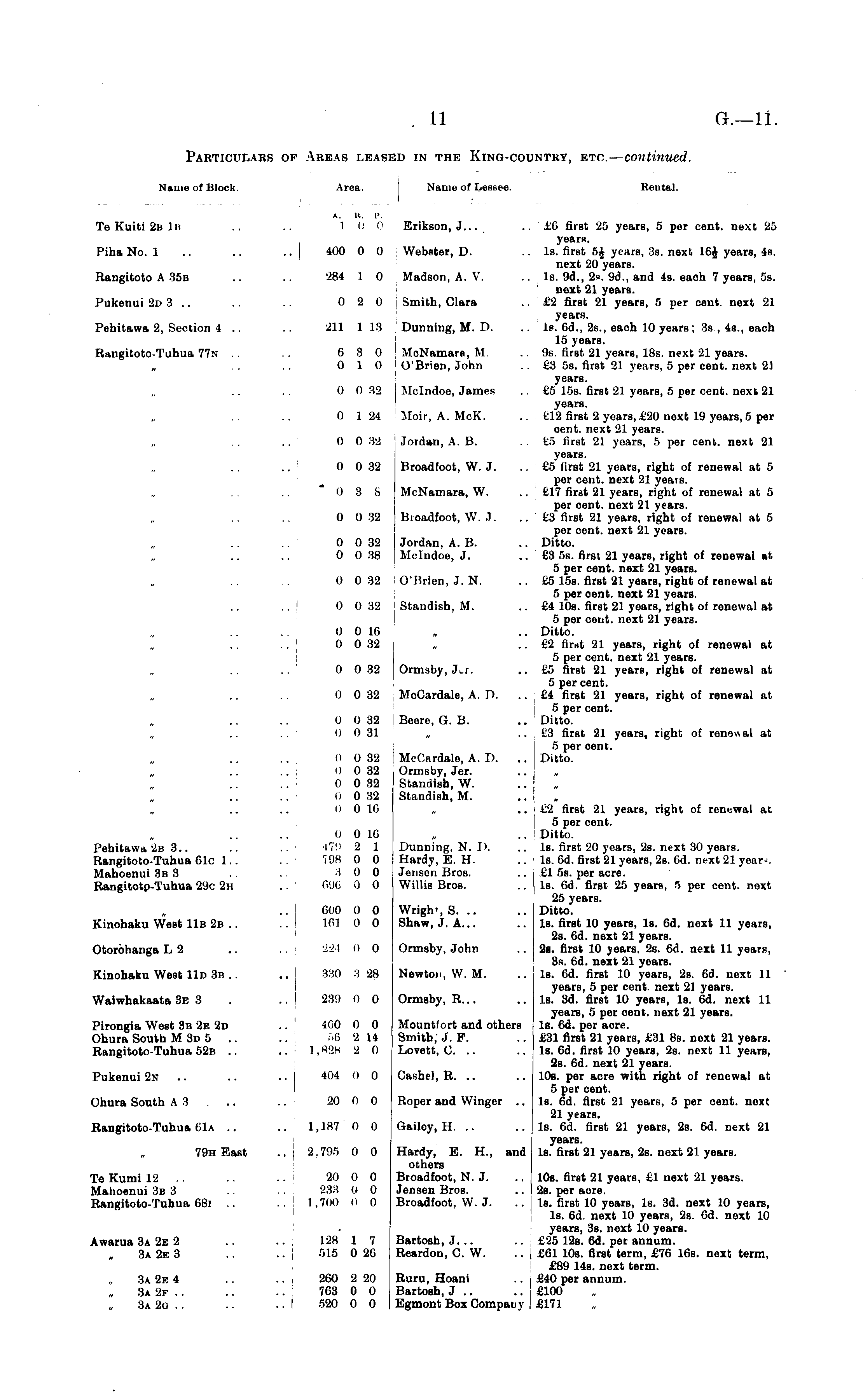 Name of Block. Area. Nuuiv of Lessee. Rental. Te Kuiti 2b Iβ Piha No. 1 Hangitoto A 35b Pukenui 2d 3 .. Pehitawa 2, Section 4 .. Riuigitoto-Tuhua 77n .. A. It. P. II 400 0 0 284 1 0 0 2 0 ■ill 1 18 6 3 0 0 10 Erikson.J... .. Sj< < first 20 years, 5 per cent, next 25 yearn. WebRter, D. . . Is. first 5£ years, 3s. next 16J years, 4s. next 20 years. Madson, A. V. .. Is. 9d., 2». 9d., and 4s. each 7 years, 5s. next 21 years. Smith, Clara . t2 first 21 years, 5 per cent, next 21 years. Dunning, M. D. .. If. 6d., 2s., each 10 years ; 3s , 4s., each 16 years. McNamarn, M .. 9s. first 21 years, 18s. next 21 years. O'Brien, John . . 68 5s. first 21 years. 6 per cent, next 21 0 0 32 0 1 24 n 0 83 years. Mclndoe, James .. t5 15s. first 21 years, 5 per cent, next 21 years. Moir, A. MoK, . tl2 first 2 years, t2() noxt 19 years,5 per oent. next 21 years. Jordan, A. P>. .. fcn first 21 years, 5 per cent, next 21 Pehitawa 2b 3.. Kangitoto-Tuhua 61c 1.. Mahoenni 3b 3 Rangitotp-Tuhua 29c 2h Kinohaku West 11b 2b .. Otorohanga L 2 Kinohaku West 11d 3b .. Waiwhakaata 3e 8 Pirongia West 3b 2e 2d Ohura South M 3d 5 Rangitoto-Tuhua 52b .. Pukenui 2n .. Ohura South A 3 . .. R&ngitoto-Tuhua 61a .. 79h East Te Kumi 12 .. Mahoenui 3b 3 Rangitoto-Tuhua 68i .. Awarua 3a 2e 2 3a 2e 3 3a 2e 4 3a 2f .. 3a 2o .. 0 0 32 "088 0 0 32 0 0 32 0 0 38 0 0 32 0 0 32 0 0 16 (i 0 32 0 0 32 n 0 32 0 0 32 0 0 31 I) 0 32 0 0 32 0 0 32 ii 0 32 0 0 16 0 0 Iβ 479 2 1 798 0 0 10 0 0 0 600 0 0 161 0 0 ii 0 3 2K 389 0 0 0 0 2 14 1,828 2 0 404 0 0 i>0 1,187' 0 0 2,798 0 0 20 0 0 288 0 0 1,700 ii 0 138 1 7 r>15 0 26 I 260 2 20 763 0 0 ..I 520 0 0 years. Broadfoot, W. J. . Bβ lirst 21 years, right of renewal at 5 per cent, next 21 yeais. Mi'N'amara, W. .. tl7 first 21 years, right of renewal at 6 per cent, next 21 years. P.ioadfoot, \V. J. .. BS first 21 years, right of renewal Ett 5 per cent, next 21 years. Jordan, A. B. .. Ditto. Indoe, J. ..63 5s. first 21 years, right of renewal at 5 per cent, next 21 years. O'Brien, J.N. .. 86 15s. first 21 years, right of renewal at 5 per cent, next 21 years. Standisb, M. .. £4 10s. first 21 years, right of renewal at 5 per cent, next 21 years. .. Ditto. W first 21 years, right of renewal at 5 per cent, next 21 years. Onnsby, J«.r, .. to first 21 years, right of renewal at 5 per cent. McCardale, A. D. .. fc4 first 21 years, right of renewal at 5 per cent. Beere, G. B. .. Ditto. 88 first 21 years, right of renewal at 6 per oent. MeCurdale, A. D. ., Ditto. Ornisby, Jer. .. Standish, W. Standish, M. .. L2 first 21 years, right of renewal at 5 per cent. .. Ditto. Dunning, N. D. .. Is. first 20 years, 2s. next 30 years. Hardy, E. H. .. Is 0d. first 21 years, 2s. 6d. next 21 your-. I'TisenBros. .. tl 5s. per acre. Willis Bros. .. Is. 6d. first 25 yeara, 5 per cent, noxt 25 years. Wrighi, S. .. .. Ditto. Shaw, J. A... ..Is. first 10 years, Is. 6d. next 11 years, 2s. 6d. next 21 years. Ormsby, John . . 2s. first 10 years, 2s. 6d. next 11 years, 3s. (id. next 21 years. Newtoii, W. M. .. Is. 6d. first 10 years, 2s. 6d. next 11 years, 5 per cent, next 21 years. Ormsby, R... ..Is. 3d. first 10 years, Is. 6d. next 11 years, 5 per cent, next 21 years. Mountfort and others Is. 6d. per acre. Smith, J. P. .. t31 first 21 years, £31 8s. next 21 years. Lovett, O. .. ..Iβ. 6d. first 10 years, 2s. next 11 years, 2s. fid. next 21 years. Cashel, R. .. .. 10s. per acre with right of renewal at 5 per cent. Roper and Winger .. 1r. 6d. first 21 years, 5 per cent, next 21 years. Gailey, H. .. ..Is. 6d. first 21 years, 2s. 6d. next 21 years. Hardy, E. H., and j Is. first 21 years, 2s. next 21 years. others Broadfoot, N.J. .. 10s. first 21 years, tl next 21 years. Jensen Bros. .. 2s. per aure. Broadfoot, W. J. .. Is. first 10 years, Is. 3d. next 10 years, Is. 6d. next 10 years, 2s. 0d. next 10 years, 3s. next 10 years. ! Bartosh, J. .. .. £25 12s. 6d. per annum. ! Reardon, C. W. .. £61 10s. first term, £76 16s. next term. £89 14e. next term. Ruru, Hoani . . £40 per annum. Bartosh, J .. .. £100 Egmont Box Company j £171