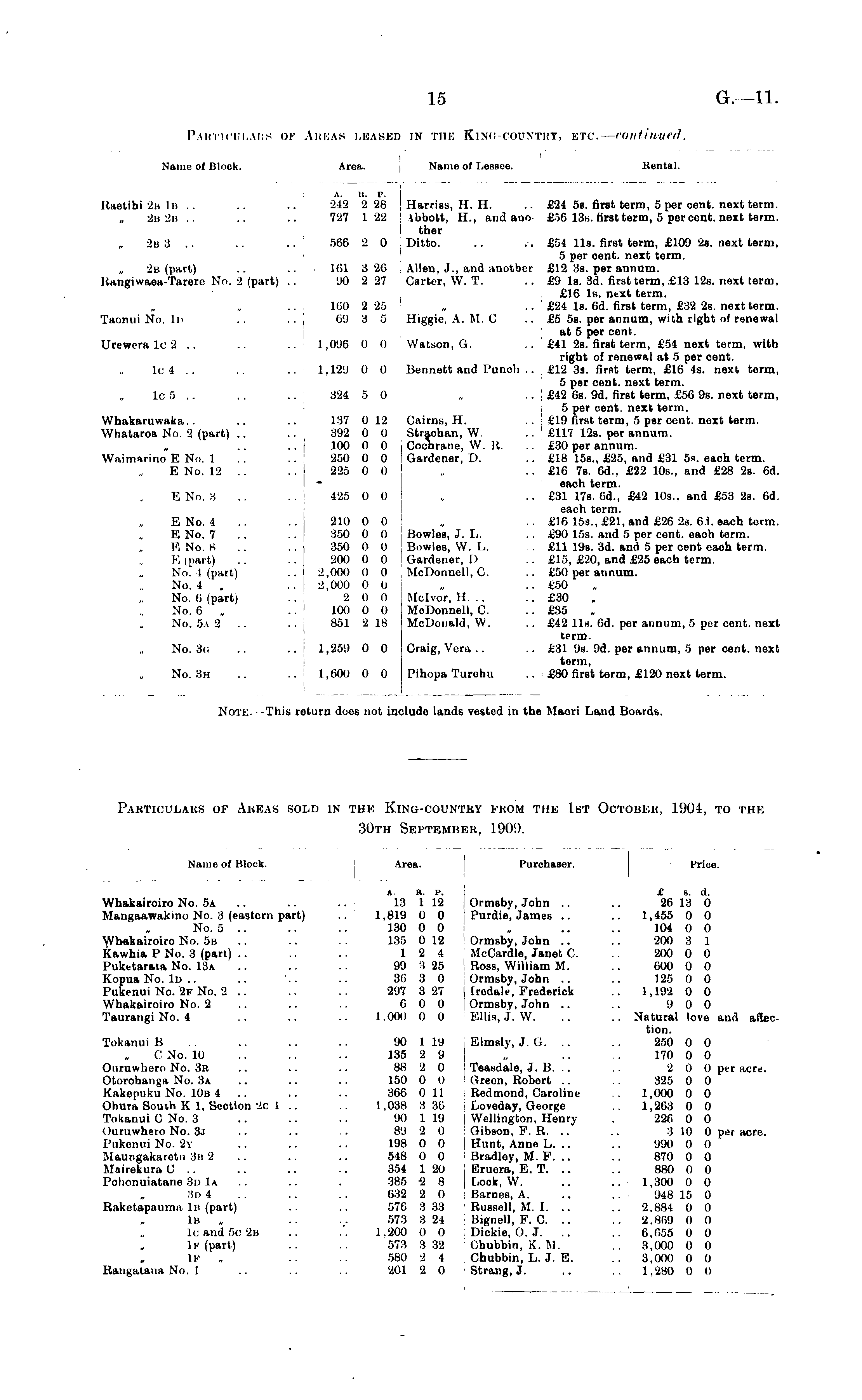 Nil Mir of Block. Area. Name of LesHue. Kental. \. Raetibi 2u hi .. .. .. 212 3 28 Earrise, H. H. .. £24 5e. first term, 5 per oont. next term. 2b 2b .. .. .. 7'27 1-22 \bbott, H., and «no- £56 13s. first term, 5 percent, next term. ther 2u 3 .. .. .. 566 2 0 Ditto. .. .. £51 lla. first term, £109 2s. next term. 5 per cent, next term. 2b (part) .. .. ■ 161 3 20 Allen, J., and another £12 3s. per annum. Kangiwaoa-Tarero No. -2 (part) .. 'JO 2 27 Carter, W. T. .. £9 Iβ. 3d. first term, £13 12s. next term, E16 Is. next term. ... 160 2 25 „ .. £24 Is. 6d. first term, £32 2s. next term. Tiiomii No. lii .. .. IS Higgle, A. M. C .. 65 5s. per annum, with right of renewal at 5 per cent. Urewora lc 2 .. .. . 1,096 o 0 Watson, Q. .. £41 2s. first term, £54 next term, with right of renewal at 5 per cent, lcl .. .. .. 1,129 0 I) Bennett and Punch .. £12 3s. firRt term, £16 4s. next term, 5 per cent, next term, lc 5 .. .. .. 324 E u . .. £42 6s. 9d. first term, £56 9s. next term, 5 per cent, next term. Whakaruwaka.. .. .. 137 0 1'2 Cairns, EC, Ll'.l first term, 5 per cent, next term. Whataroa No. 2 (part) .. .. 392 0 0 Stracuan, W. B117 12s. per annum. 100 0 0 I Cochrane, W. U. .. £30 per annum. Waimtrino E No. ] .. .. 250 <> 0 Gardener, D. .. £18 15s., £-25, and £31 5s. each term. E No. 12 .. .. 225 0 0 ,. .. £16 7s. 0d., £22 10s., mid £28 2s. 6d. each term. E No. 3 .. 425 0 0 „ .. £31 17s. 6d., £42 10s., and £53 2s. 6d. each term. E No. 4 .. 210 0 0 i ., tl6 15s., £21, and £26 2s. 6i. each term. E No. 7 .. .. 3« Bowles, J. L. .. £90 15s. and 5 per cent, each term. B No. 8 .. .. 10 0 Bowles, W. L. .. £11 19s. 3d. and 5 per cent each term. E(part) .. .. 200 0 0 Gardener, I > .. £15, £20, and £25 each term. No. I (part) .. 2,(KM) (I (I McDonnell, C. .. £50 per annum. No. 4 . .. 2,000 0 0 „ .. 650 No. 6 (part) .. 2 0 0 Mclvor, H. .. .. £30 No. 6 . .. 100 0 0 McDonnell, C. .. £35 No. 5\ 2 .. .. 851 2 18 McDonald, W. .. £42 11s. 6d. per annum, 5 per cent, next term. No. 3c; .. .. 1,259 0 0 Craig, Vera .. .. £31 9s. 9d. per annum, 5 per cent, next term, No. 3h .. .. 1,600 0 0 Pihopa Turehu .. £80 first term, £120 noxt term. Notk. -This return does not include lands vested in the Maori Land Boards. I'aktk ri.AKs of Abbas hold in the King-country fkom the 1st Octobeh, 1901, to the 30th September, 1909. Name of Block. Area. Purchaser. Price. A. H. p. A' 8. d. Whakairoiro No. 5a .. .. .. 18 1 19 Oimsby, John .. .. 26 13 0 Mangaawakino No. 3 (eastern part) .. 1,819 0 0 Purdie, James .. .. 1,455 0 0 No. 5 .. .. .. 130 0 0 ., .. .. 104 0 0 Whakairoiro No. 5b .. .. .. 135 0 12 Ormsby, John .. .. 200 8 1 Kawhia P No. 3 (part) .. .. .. 12 4 McCardle, Janet C 200 0 0 Puketarata No. 13a .. .. .. 99 8 38 Ross, William M. .. 600 0 0 KopuaNo.lD.. .. .. .. B6 8 0 Ormsby,John .. .. 125 0 0 Pukenui No. 2f No. 2 .. .. .. 297 3 27 I redale, Frederick .. 1,192 0 0 Whakairoiro No. 2 .. .. .. 6 0 0 Ormsby, John .. .. !l 0 0 Taurangi No. 4 .. .. .. L.OOO 0 (I Ellis, J. W, .. .. Natural love aud affection. Tokanui B .. .. .. .. 90 1 l'J Elmsly, J. G. .. .. 250 0 0 C No. 10 .. .. .. 135 2 9 , .. .. 170 0 0 Ouruwhero No. 3R .. .. .. 88 2 0 Teasdale, J. B. .. .. 2 0 0 per acre. Otorohanga No. 3a .. .. .. 150 0 0 Green, Robert .. .. 325 0 0 Kakepuku No. 10b 4 .. .. .. 366 Oil Redmond, Caroline .. 1,000 0 0 Ohura South K 1, Section-2c 1 .. .. 1,038 3 36 Loveday, George .. 1,263 0 0 Tokanui 0 No. 3 .. .. .. 90 1 1!) Wellington. Henry . 226 0 0 Ouruwhero No. 3j .. .. . 89 2 0 (iibson, P. R. .. .. 8 10 0 per acre. Pukonui No. 2v .. .. .. 198 0 0 i Hunt, Anne L. .. .. 990 0 0 Maungakaretu 3n 2 .. .. .. 548 0 0 Bradley, M. P. .. .. 870 0 0 MairekuraC .. .. .. .. 354 1 20 Eruera, K. T. .. .. 880 0 0 Pohonuiatane 3d Iα .. .. . 385 '2 8 Lock, W. .. .. 1,300 0 0 :;i> 1 .. .. .. 632 2 0 Barnes, A. .. .. • 948 15 0 Raketapauma In (part) .. .. 576 8 88 Russell, M. I. .. .. 2.884 0 0 Iβ „ .. .. 578 121 I'.igncll, F. C. .. .. 3,868 0 0 Lc and 6c 2b .. .'. 1.200 o o Dickie, O. J. .. .. 6,656 o 0 Ik (part) .. .. 57:1 3 32 Cbubbin, K. M. .. 8,000 0 0 IP . .. .. 580 2 4 Chubbin, L. J E. .. 8,000 0 0 Rangataua No. 1 .. .. .. 201 2 0 Strang, J. .. .. 1.280 0 (i Kaiij