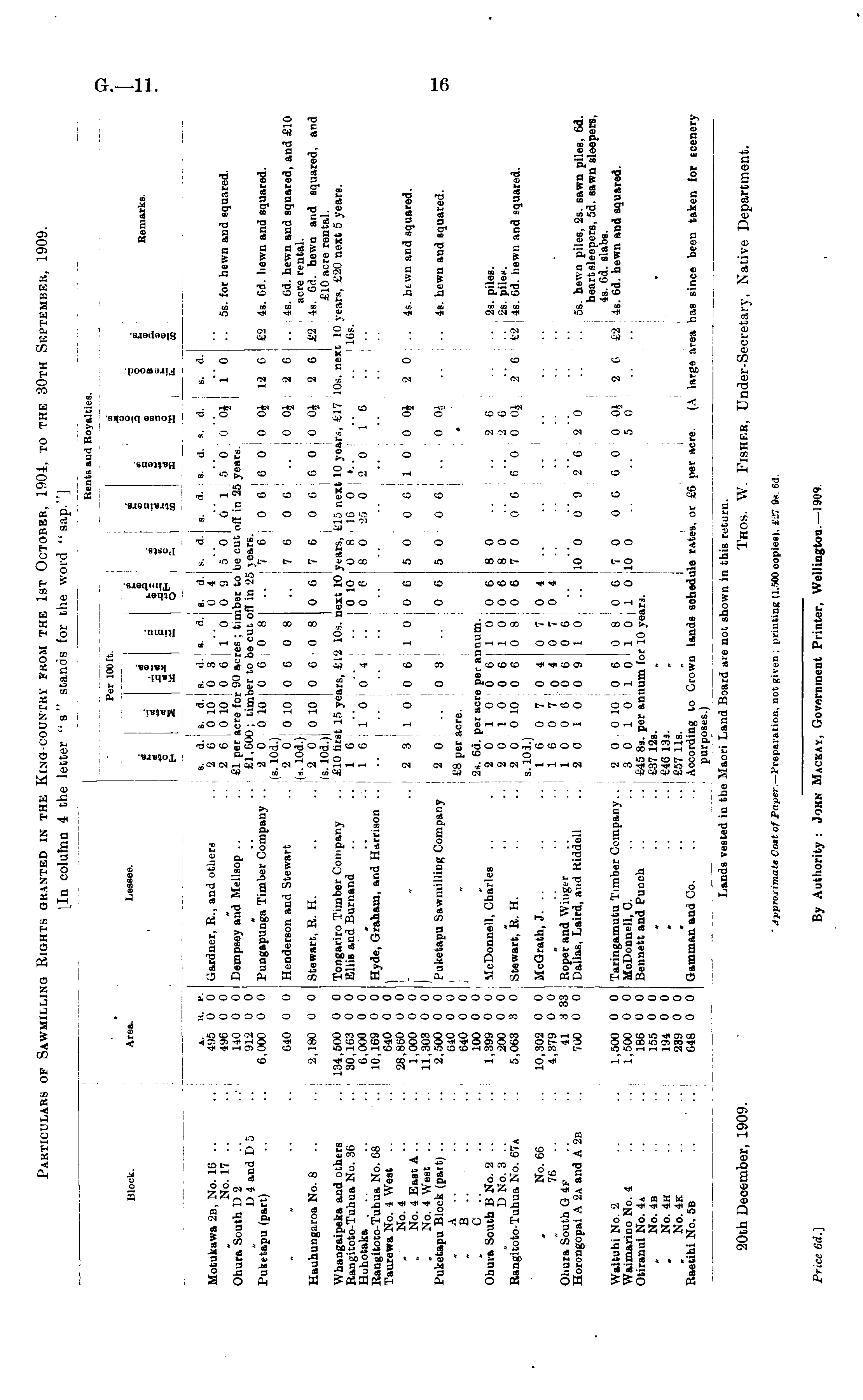 Particulars of Sawmilling Rights granted in the King-country from the 1st October, 1904, to the 30th September, 1909. [In column 4 the letter "s" stands for the word "sap."]