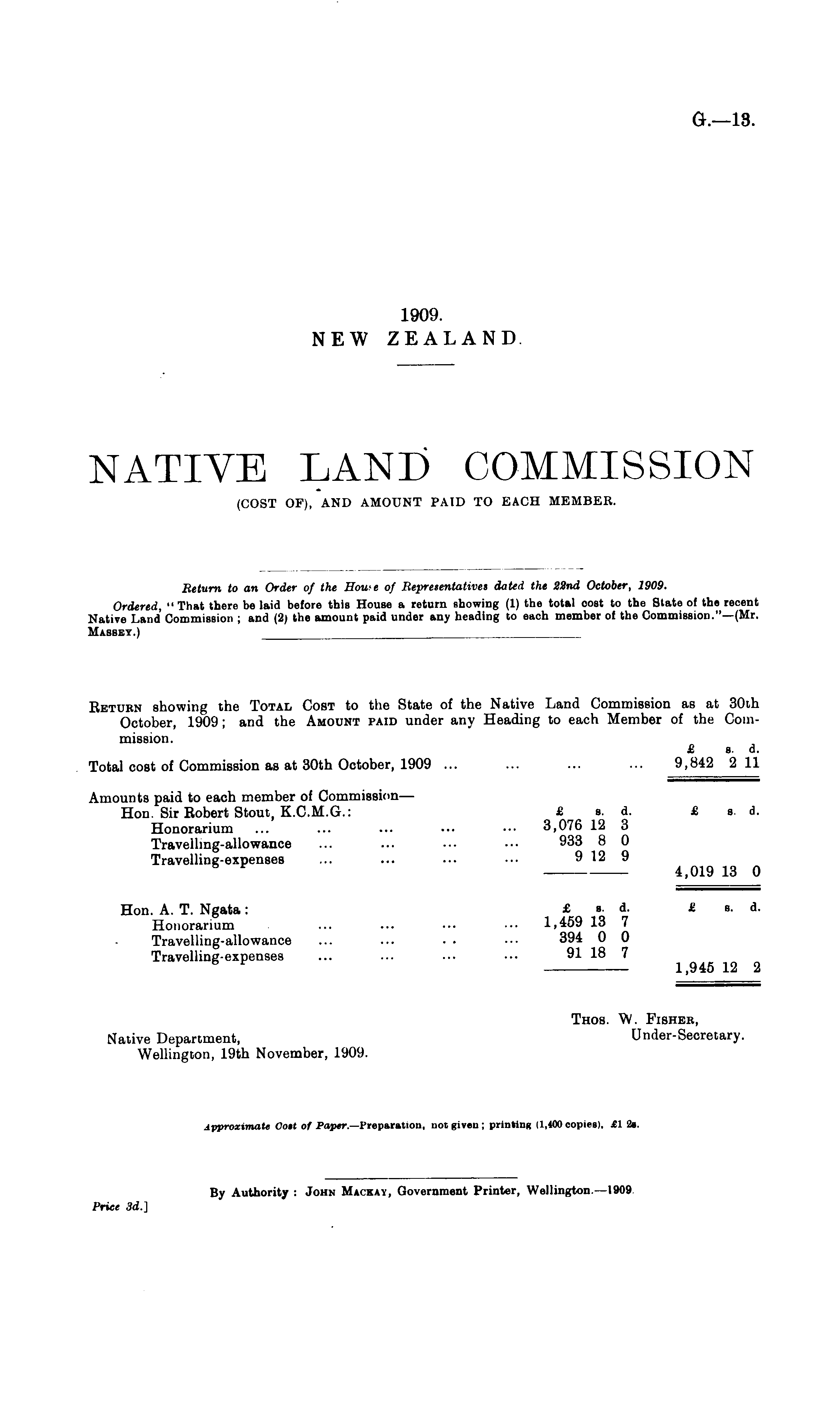 Return to an Order of the Houte of Representatives dated the 22nd October, 1909. Ordered, " That there be laid before this House a return showing (1) the total ooet to the State of the recent Native Land Commission ; and (2) the amount paid under any heading to each member of the Commission."—(Mr. Massey.)