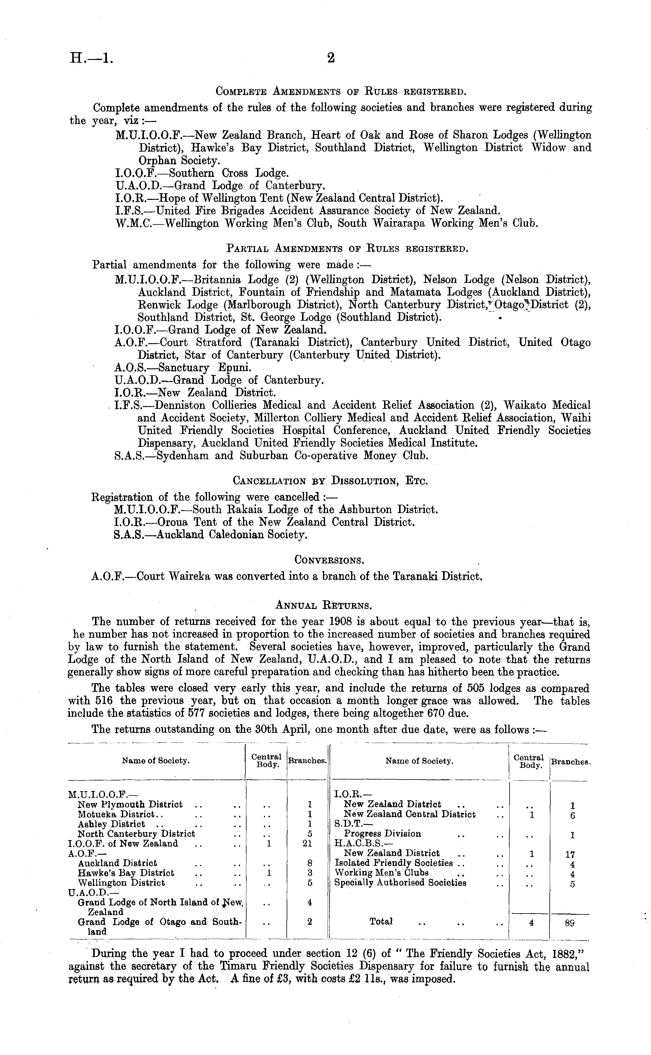 Complete Amendments of Rules registered. Complete amendments of the rules of the following societies and branches were registered during the year, viz :— M.U.1.0.0.F. —New Zealand Branch, Heart of Oak and Rose of Sharon Lodges (Wellington District), Hawke's Bay District, Southland District, Wellington District Widow and Orphan Society. I.O.O.F.—Southern Cross Lodge. U.A.O.D.—Grand Lodge of Canterbury. 1.0.R.—-Hope of Wellington Tent (New Zealand Central District). I.F.S.—United Fire Brigades Accident Assurance Society of New Zealand. W.M.C. —Wellington Working Men's Club, South Wairarapa Working Men's Club. Partial Amendments of Rules registered. Partial amendments for the following were made : — M.U.l.O.O.F.—Britannia Lodge (2) (Wellington District), Nelson Lodge (Nelson District), Auckland District, Fountain of Friendship and Matamata Lodges (Auckland District), Renwick Lodge (Marlborough District), North Canterbury District,'" Otago*District (2), Southland District, St. George Lodge (Southland District). I.O.O.F.—Grand Lodge of New Zealand. A.O.F.—Court Stratford (Taranaki District), Canterbury United District, United Otago District, Star of Canterbury (Canterbury United District). A.O.S.—Sanctuary Epuni. U.A.O.D.—Grand Lodge of Canterbury. I.O.R.—New Zealand District. I.F.S. —Denniston Collieries Medical and Accident Relief Association (2), Waikato Medical and Accident Society, Millerton Colliery Medical and Accident Relief Association, Waihi United Friendly Societies Hospital Conference, Auckland United Friendly Societies Dispensary, Auckland United Friendly Societies Medical Institute. S.A.S.— Sydenham and Suburban Co-operative Money Club. Cancellation by Dissolution, Etc. Registration of the following were cancelled :— M.U.I.O.O.F.—South Rakaia Lodge of the Ashburton District. I.O.R.—Oroua Tent of the New Zealand Central District. S.A.S.—Auckland Caledonian Society. Conversions. A.O.F.—Court Waireka was converted into a branch of the Taranaki District. Annual Returns. The number of returns received for the year 1908 is about equal to the previous year—that is, he number has not increased in proportion to the increased number of societies and branches required by law to furnish the statement. Several societies have, however, improved, particularly the Grand Lodge of the North Island of New Zealand, U.A.0.D., and I am pleased to note that the returns generally show signs of more careful preparation and checking than has hitherto been the practice. The tables were closed very early this year, and include the returns of 505 lodges as compared with 516 the previous year, but on that occasion a month longer grace was allowed. The tables include the statistics of 577 societies and lodges, there being altogether 670 due. The returns outstanding on the 30th April, one month after due date, were as follows :—