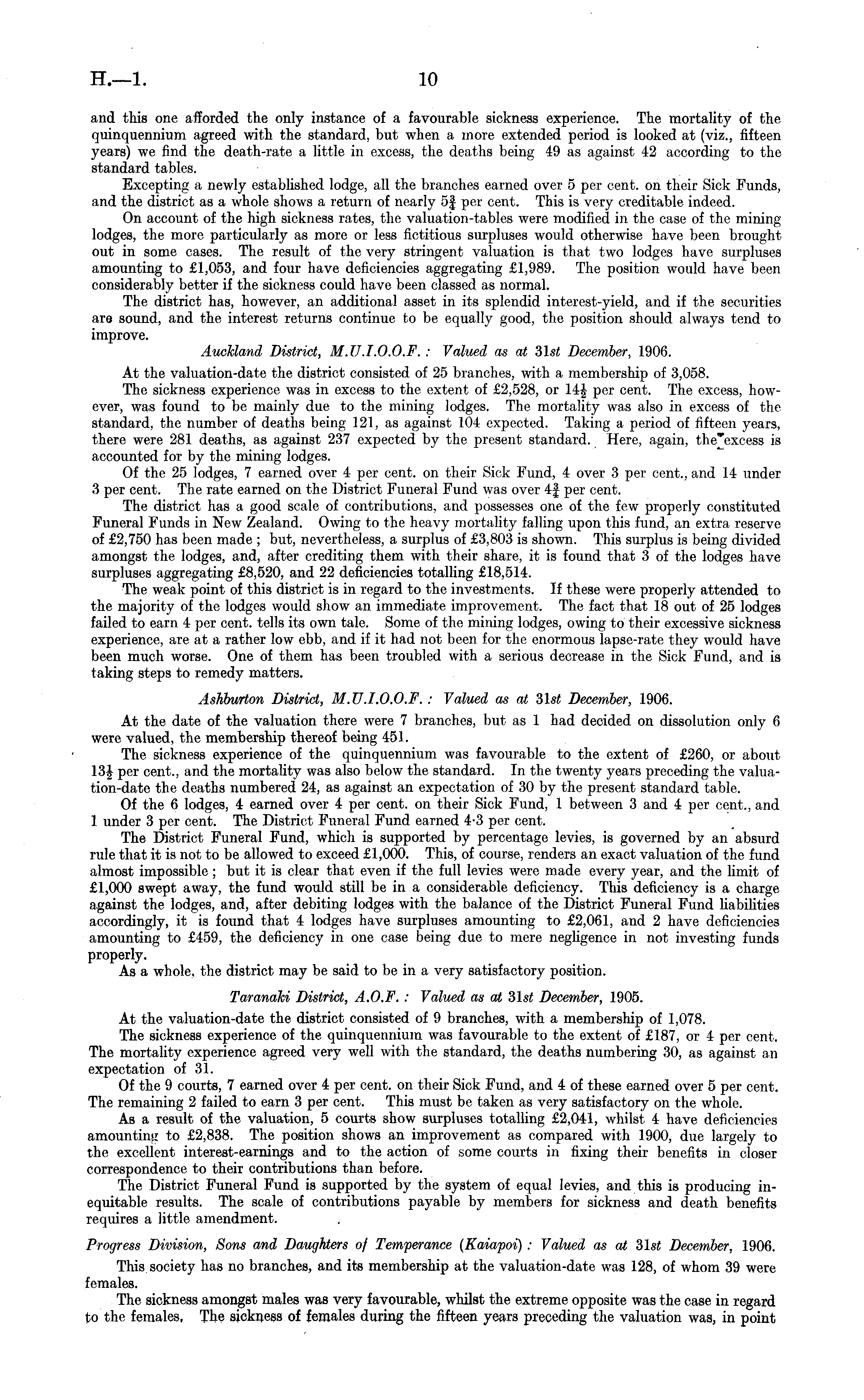 and this one afforded the only instance of a favourable sickness experience. The mortality of the quinquennium agreed with the standard, but when a more extended period is looked at (viz., fifteen years) we find the death-rate a little in excess, the deaths being 49 as against 42 according to the standard tables. Excepting a newly established lodge, all the branches earned over 5 per cent, on their Sick Funds, and the district as a whole shows a return of nearly 5| per cent. This is very creditable indeed. On account of the high sickness rates, the valuation-tables were modified in the case of the mining lodges, the more particularly as more or less fictitious surpluses would otherwise have been brought out in some cases. The result of the very stringent valuation is that two lodges have surpluses amounting to £1,053, and four have deficiencies aggregating £1,989. The position would have been considerably better if the sickness could have been classed as normal. The district has, however, an additional asset in its splendid interest-yield, and if the securities are sound, and the interest returns continue to be equally good, the position should always tend to improve. Auckland District, M.ZJ.1.0.0.F. : Valued as at 31st December, 1906. At the valuation-date the district consisted of 25 branches, with a membership of 3,058. The sickness experience was in excess to the extent of £2,528, or 14| per cent. The excess, however, was found to be mainly due to the mining lodges. The mortality was also in excess of the standard, the number of deaths being 121, as against 104 expected. Taking a period of fifteen years, there were 281 deaths, as against 237 expected by the present standard. Here, again, the'excess is accounted for by the mining lodges. Of the 25 lodges, 7 earned over 4 per cent, on their Sick Fund, 4 over 3 per cent., and 14 under 3 per cent. The rate earned on the District Funeral Fund was over 4f per cent. The district has a good scale of contributions, and possesses one of the few properly constituted Funeral Funds in New Zealand. Owing to the heavy mortality falling upon this fund, an extra reserve of £2,750 has been made ; but, nevertheless, a surplus of £3,803 is shown. This surplus is being divided amongst the lodges, and, after crediting them with their share, it is found that 3 of the lodges have surpluses aggregating £8,520, and 22 deficiencies totalling £18,514. The weak point of this district is in regard to the investments. If these were properly attended to the majority of the lodges would show an immediate improvement. The fact that 18 out of 25 lodges failed to earn 4 per cent, tells its own tale. Some of the mining lodges, owing to their excessive sickness experience, are at a rather low ebb, and if it had not been for the enormous lapse-rate they would have been much worse. One of them has been troubled with a serious decrease in the Sick Fund, and is taking steps to remedy matters. Ashburton District, M.U.1.0.0.F. : Valued as at 31st December, 1906. At the date of the valuation there were 7 branches, but as 1 had decided on dissolution only 0 were valued, the membership thereof being 451. The sickness experience of the quinquennium was favourable to the extent of £260, or about 13J per cent., and the mortality was also below the standard. In the twenty years preceding the valua-tion-date the deaths numbered 24, as against an expectation of 30 by the present standard table. Of the 6 lodges, 4 earned over 4 per cent, on their Sick Fund, 1 between 3 and 4 per cent., and 1 under 3 per cent. The District Funeral Fund earned 4-3 per cent. The District Funeral Fund, which is supported by percentage levies, is governed by an absurd rule that it is not to be allowed to exceed £1,000. This, of course, renders an exact valuation of the fund almost impossible ; but it is clear that even if the full levies were made every year, and the limit of £1,000 swept away, the fund would still be in a considerable deficiency. This deficiency is a charge against the lodges, and, after debiting lodges with the balance of the District Funeral Fund liabilities accordingly, it is found that 4 lodges have surpluses amounting to £2,061, and 2 have deficiencies amounting to £459, the deficiency in one case being due to mere negligence in not investing funds properly. As a whole, the district may be said to be in a very satisfactory position. Taranaki District, A.O.F. : Valued as at 31st December, 1905. At the valuation-date the district consisted of 9 branches, with a membership of 1,078. The sickness experience of the quinquennium was favourable to the extent of £187, or 4 per cent. The mortality experience agreed very well with the standard, the deaths numbering 30, as against an expectation of 31. Of the 9 courts, 7 earned over 4 per cent, on their Sick Fund, and 4 of these earned over 5 per cent. The remaining 2 failed to earn 3 per cent. This must be taken as very satisfactory on the whole. As a result of the valuation, 5 courts show surpluses totalling £2,041, whilst 4 have deficiencies amounting to £2,838. The position shows an improvement as compared with 1900, due largely to the excellent interest-earnings and to the action of some courts in fixing their benefits in closer correspondence to their contributions than before. The District Funeral Fund is supported by the system of equal levies, and this is producing inequitable results. The scale of contributions payable by members for sickness and death benefits requires a little amendment. Progress Division, Sons and Daughters of Temperance (Kaiapoi) : Valued as at 31st December, 1906. This society has no branches, and its membership at the valuation-date was 128, of whom 39 were females. The sickness amongst males was very favourable, whilst the extreme opposite was the case in regard to the females, The sickness of females during the fifteen years preceding the valuation was, in point
