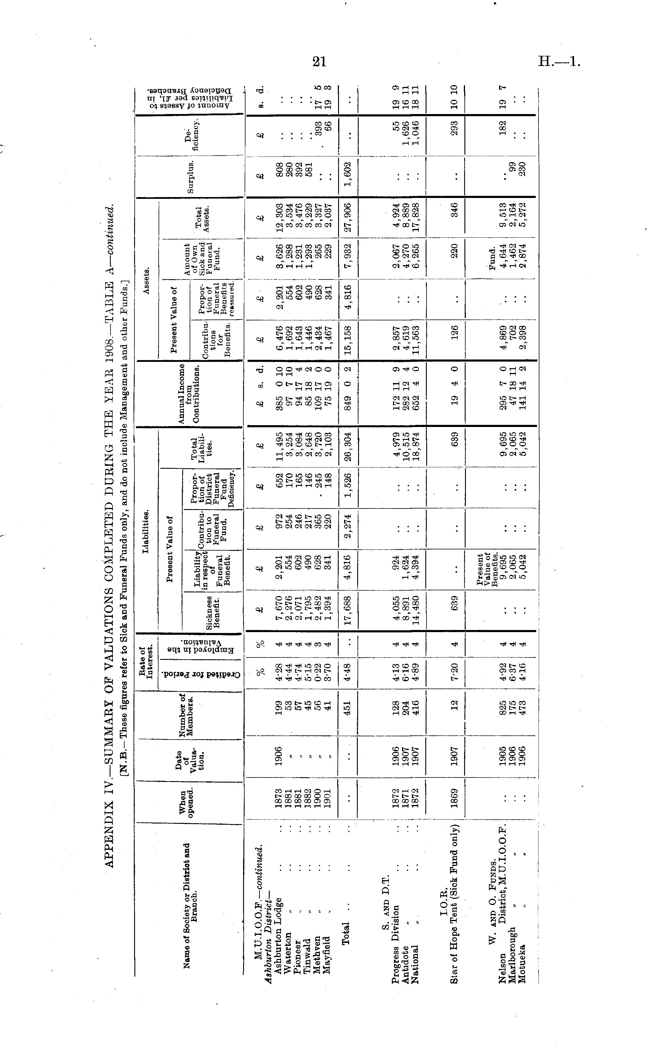 APPENDIX IV.—SUMMARY OF VALUATIONS COMPLETED DURING THE YEAR 1908.—TABLE A—continued. [N.B.— These figures refer to Sick and Funeral Funds only, and do not include Management and other Funds.]