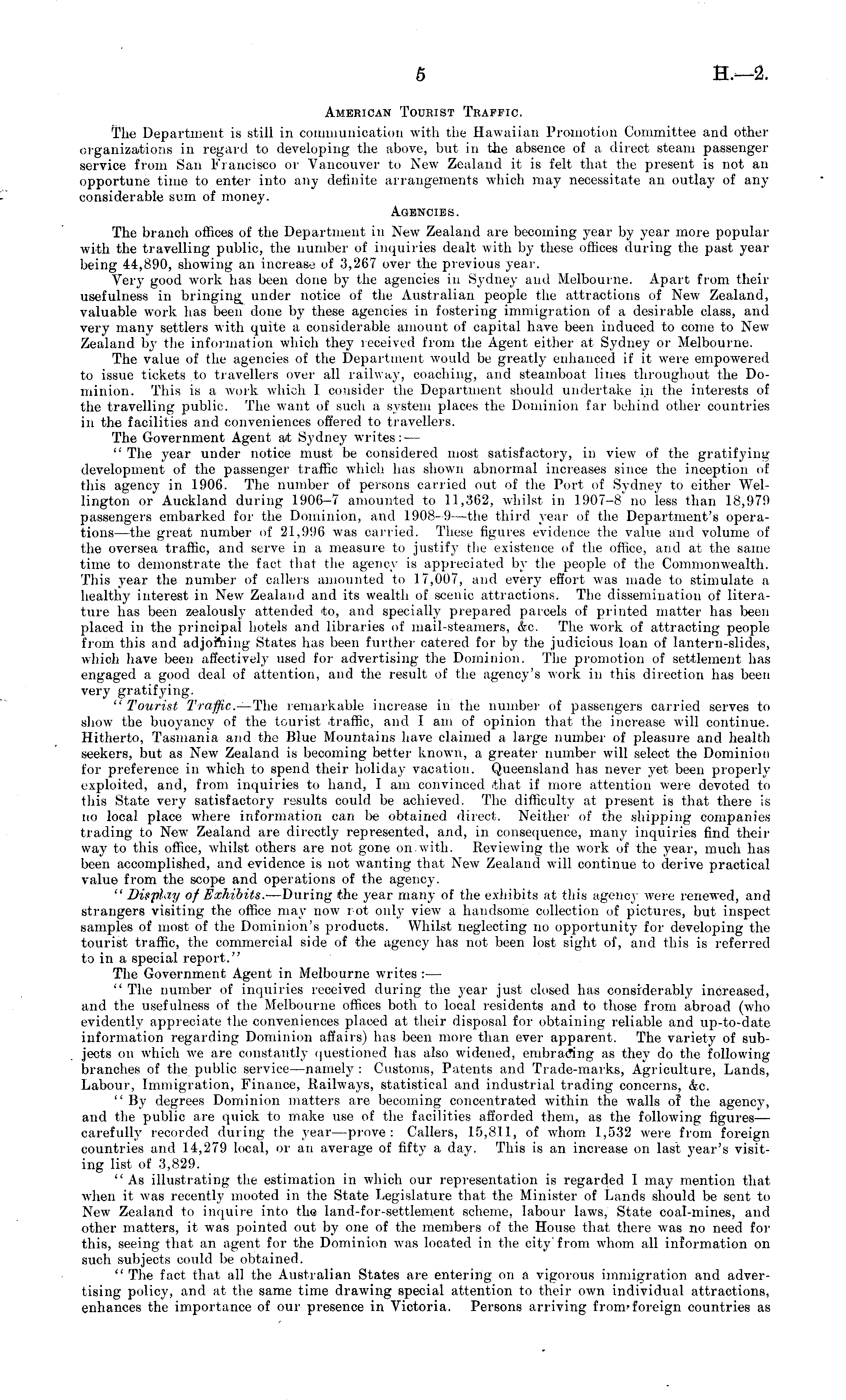 American Tourist Traffic. The Department is still in communication with the Hawaiian Promotion Committee and other organizations in regard to developing the above, but in the absence of a direct steam passenger service from San Francisco or Vancouver to New Zealand it is felt thai the present is not an opportune time to enter into any definite arrangements which may necessitate an outlay of any considerable sum of money. Agencies. The branch offices of the Department in New Zealand are becoming year by year more popular with the travelling public, the number of inquiries dealt with by these offices during the past year being 44,890, showing an increase of 3,267 over the previous year. Very good work has been done by the agencies in Sydney and Melbourne. Apart from their usefulness in bringing under notice of the Australian people the attractions of New Zealand, valuable work has been done by these agencies in fostering immigration of a desirable class, and very many settlers with quite a considerable amount of capital have been induced to come to New Zealand by the information which they received from the Agent either at Sydney or Melbourne. The value of the agencies of the Department would be greatly enhanced if it were empowered to issue tickets to travellers over all railway, coaching, and steamboat lines throughout the Dominion. This is a work which 1 consider the Department should undertake in the interests of the travelling public. The want of such a system places the Dominion far behind other countries in the facilities and conveniences offered to travellers. The Government Agent at Sydney writes: — " The year under notice must be considered most satisfactory, in view of the gratifying development of the passenger traffic which has shown abnormal increases since the inception of this agency in 1906. The number of persons carried out of the Port of Sydney to either Wellington or Auckland during 1906-7 amounted to 11,362, whilst in 1907-8 no less than 18,979 passengers embarked for the Dominion, and 1908-9—the third year of the Department's operations—the great number of 2f,996 was carried. These figures evidence the value and volume of the oversea traffic, and serve in a measure to justify the existence of the office, and at the same time to demonstrate the fact that the agency is appreciated by the people of the Commonwealth. This year the number of callers amounted to 17,007, and every effort was made to stimulate a healthy interest in New Zealand and its wealth of scenic attractions. The dissemination of literature has been zealously attended to, and specially prepared parcels of printed matter has been placed in the principal hotels and libraries of mail-steamers, &c. The work of attracting people from this and adjoining States has been further catered for by the judicious loan of lantern-slides, which have been affectively used for advertising the Dominion. The promotion of settlement has engaged a good deal of attention, and the result of the agency's work in this direction has been very gratifying. " Tourist Traffic. —The remarkable increase in the number of passengers carried serves to show the buoyancy of the tourist traffic, and I am of opinion that the increase will continue. Hitherto, Tasmania and the Blue Mountains have claimed a large number of pleasure and health seekers, but as New Zealand is becoming better known, a greater number will select the Dominion for preference in which to spend their holiday vacation. Queensland has never yet been properly exploited, and, from inquiries to hand, T am convinced that if more attention were devoted to this State very satisfactory results could be achieved. The difficulty at present is that there is no local place where information can be obtained direct. Neither of the shipping companies trading to New Zealand are directly represented, and, in oonsequence, many inquiries find their way to this office, whilst others are not gone on.with. Reviewing the work of the year, much has been accomplished, and evidence is not wanting that New Zealand will continue to derive practical value from the scope and operations of the agency. " Display of Exhibits. —During the year many of the exhibits at this agency were renewed, and strangers visiting the office may now rot only view a handsome collection of pictures, but inspect samples of most of the Dominion's products. Whilst neglecting no opportunity for developing the tourist traffic, the commercial side of the agency has not been lost sight of, and this is referred to in a special report." The Government Agent in Melbourne writes : — " The number of inquiries received during the year just closed has considerably increased, and the usefulness of the Melbourne offices both to local residents and to those from abroad (who evidently appreciate the conveniences placed at their disposal for obtaining reliable and up-to-date information regarding Dominion affairs) has been more than ever apparent. The variety of subjects on which we are constantly questioned has also widened, embracing as they do the following branches of the public service—namely: Customs, Patents and Trade-marks, Agriculture, Lands, Labour, Immigration, Finance, Railways, statistical and industrial trading concerns, &c. " By degrees Dominion matters are becoming concentrated within the walls of the agency, and the public are quick to make use of the facilities afforded them, as the following figures— carefully recorded during the year —prove: Callers, 15,811, of whom 1,532 were from foreign countries and 14,279 local, or an average of fifty a day. This is an increase on last year's visiting list of 3,829. "As illustrating the estimation in which our representation is regarded I may mention that when it was recently mooted in the State Legislature that the Minister of Lands should be sent to New Zealand to inquire into the land-for-settlemcnt scheme, labour laws, State coal-mines, and other matters, it was 