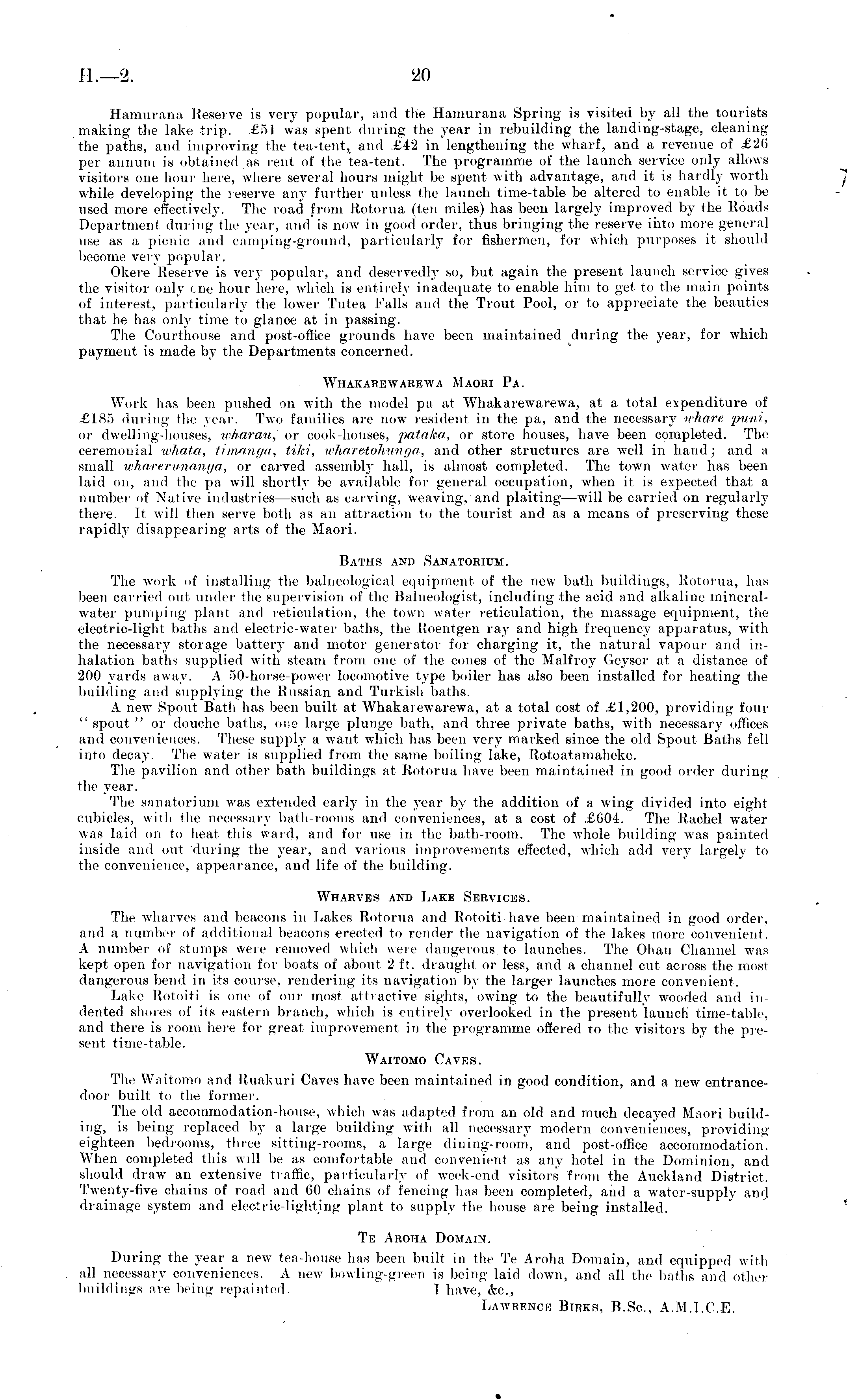 Hamurana Reserve is very popular, and the Hamurana Spring is visited by all the tourists making the lake trip. £51 was spent during the year in rebuilding the landing-stage, cleaning the paths, and improving the tea-tent, and £42 in lengthening the wharf, and a revenue of £26 per annum is obtained as rent of the tea-tent. The programme of the launch service only allows visitors one hour here, where several hours might be spent with advantage, and it is hardly worth while developing the reserve any further unless the launch time-table be altered to enable it to be used more effectively. The road from Rotorua (ten miles) has been largely improved by the Beads Department during the year, and is now- in good order, thus bringing the reserve into more general use as a picnic and camping-ground, particularly for fishermen, for which purposes it should become very popular. Okere Reserve is very popular, and deservedly so, but again the present launch service gives the visitor only i ne hour here, which is entirely inadequate to enable him to get to the main points of interest, particularly the lower Tutea Falls and the Trout Pool, or to appreciate the beauties that he has only time to glance at in passing. The Courthouse and post-office grounds have been maintained during the year, for which payment is made by the Departments concerned. Whakarewarewa Maori Pa. Work has been pushed on with the model pa at Whakarewarewa, at a total expenditure of £185 during the year. Two families are now resident in the pa, and the necessary whare puni, or dwelling-houses, wharau, or cook-houses, pataka, or store houses, have been completed. The ceremonial wha'ta, timanga, tiki, ivharetohvnga, and other structures are well in hand; and a small wharerunanga, or carved assembly hall, is almost completed. The town water has been laid on, and the pa will shortly be available for general occupation, when it is expected that a number of Native industries—such as carving, weaving, and plaiting —will be carried on regularly there. It will then serve both as an attraction to the tourist and as a means of preserving these rapidly disappearing arts of the Maori. Baths and Sanatorium. The work of installing the balneological equipment of the new bath buildings, Rotorua, has been carried out under the supervision of the Balneologist, including the acid and alkaline mineralwater pumping plant and reticulation, the town water reticulation, the massage equipment, the electric-light baths and electric-water baths, the Roentgen ray and high frequency apparatus, with the necessary storage battery and motor generator for charging it, the natural vapour and inhalation baths supplied with steam from one of the cones of the Malfroy Geyser at a distance of 200 yards away. A 50-horse-power locomotive type boiler has also been installed for heating the building and supplying the Russian and Turkish baths. A new Spout Bath has been built at Whakarewarewa, at a total cost of £1,200, providing four " spout " or douche baths, one large plunge bath, and three private baths, with necessary offices and conveniences. These supply a want which has been very marked since the old Spout Baths fell into decay. The water is supplied from the same boiling lake, Rotoatamaheke. The pavilion and other bath buildings at Rotorua have been maintained in good order during the year. The sanatorium was extended early in the year by the addition of a wing divided into eight cubicles, with the necessary bath-rooms and conveniences, at a cost of £604. The Rachel water was laid on to heat this ward, and for use in the bath-room. The whole building was painted inside and out during the year, and various improvements effected, which add very largely to the convenience, appearance, and life of the building. Wharves and Lake Services. The wharves and beacons in Lakes Rotorua and Rotoiti have been maintained in good order, and a number of additional beacons erected to render the navigation of the lakes more convenient. A number of stumps were removed which were dangerous to launches. The Ohau Channel was kept open for navigation for boats of about 2 ft. draught or less, and a channel cut across the most dangerous bend in its course, rendering its navigation by the larger launches more convenient. Lake Rotoiti is one of our most attractive sights, owing to the beautifully wooded and indented shores of its eastern branch, which is entirely overlooked in the present launch time-table, and there is room here for great improvement in the programme offered to the visitors by the present time-table. Waitomo Caves. The Waitomo and Ruakuri Caves have been maintained in good condition, and a new entrancedoor built to the former. The old accommodation-house, which was adapted from an old and much decayed Maori building, is being replaced by a large building with all necessary modern conveniences, providing eighteen bedrooms, three sitting-rooms, a large dining-room, and post-office accommodation. When completed this will be as comfortable and convenient as any hotel in the Dominion, and should draw an extensive traffic, particularly of week-end visitors from the Auckland District. Twenty-five chains of road and 60 chains of fencing has been completed, and a water-supply and drainage system and electric-lighting plant to supply the house are being installed. Te Aroha Domain. During the year a new tea-house has been built in the Te Aroha Domain, and equipped with all necessary conveniences. A new bowling-green is being laid down, and all the baths and other buildings are being repainted. I have, &c, Lawrence Btrks, B.Sc, A.M.I.C.E.