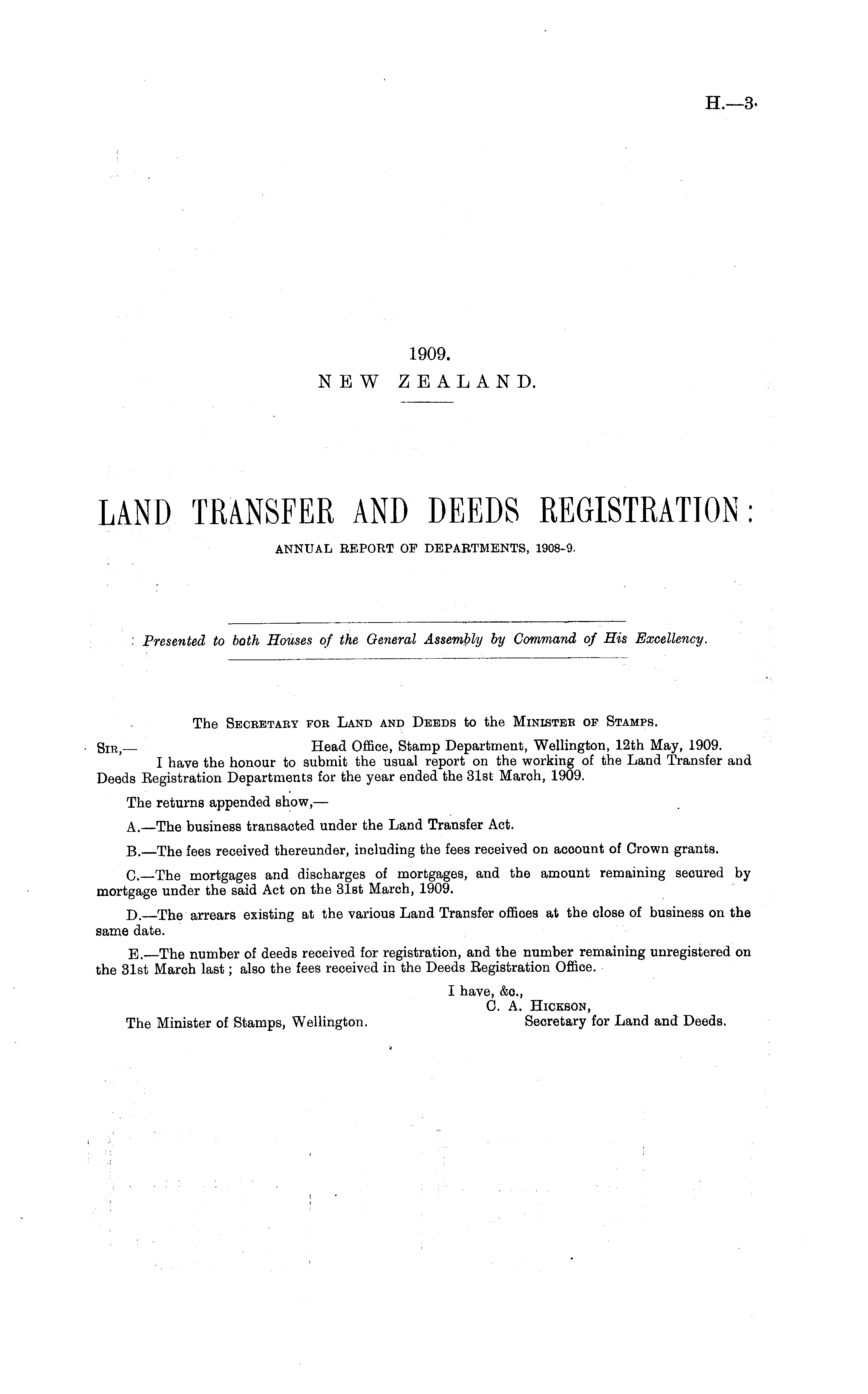 The Secretary for Land and Deeds to the Minister of Stamps. g IR> Head Office, Stamp Department, Wellington, 12th May, 1909. I have the honour to submit the usual report on the working of the Land Transfer and Deeds Registration Departments for the year ended the 31st March, 1909. The returns appended show, — A. —The business transacted under the Land Transfer Act. B.—The fees received thereunder, including the fees received on account of Crown grants. C—The mortgages and discharges of mortgages, and the amount remaining secured by mortgage under the said Act on the 31st March, 1909. D.—The arrears existing at the various Land Transfer offices at the close of business on the same date. E.—The number of deeds received for registration, and the number remaining unregistered on the 31st March last; also the fees received in the Deeds Registration Office. I have, &c, C. A. Hickson, The Minister of Stamps, Wellington. Secretary for Land and Deeds.