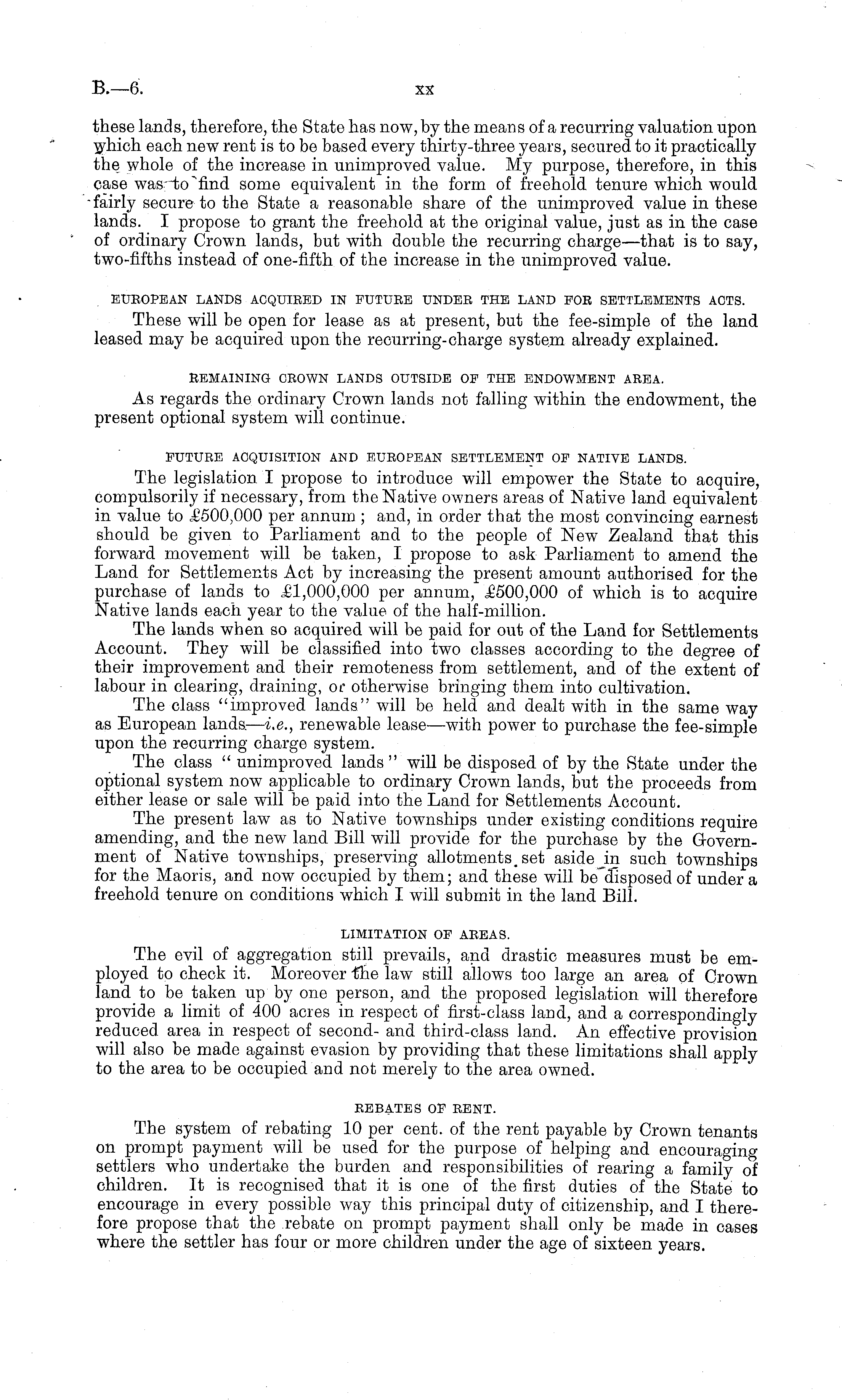 these lands, therefore, the State has now, by the means of a recurring valuation upon which each new rent is to be based every thirty-three years, secured to it practically the whole of the increase in unimproved value. My purpose, therefore, in this case was to find some equivalent in the form of freehold tenure which would fairly secure to the State a reasonable share of the unimproved value in these lands. I propose to grant the freehold at the original value, just as in the case of ordinary Crown lands, but with double the recurring charge—that is to say, two-fifths instead of one-fifth of the increase in the unimproved value. EUROPEAN LANDS ACQUIRED IN FUTURE UNDER THE LAND FOR SETTLEMENTS ACTS. These will be open for lease as at present, but the fee-simple of the land leased may be acquired upon the recurring-charge system already explained. REMAINING CROWN LANDS OUTSIDE OP THE ENDOWMENT AREA. As regards the ordinary Crown lands not falling within the endowment, the present optional system will continue. FUTURE ACQUISITION AND EUROPEAN SETTLEMENT OP NATIVE LANDS. The legislation I propose to introduce will empower the State to acquire, compulsorily if necessary, from the Native owners areas of Native land equivalent in value to £500,000 per annum ; and, in order that the most convincing earnest should be given to Parliament and to the people of New Zealand that this forward movement will be taken, I propose to ask Parliament to amend the Land for Settlements Act by increasing the present amount authorised for the purchase of lands to £1,000,000 per annum, £500,000 of which is to acquire Native lands each year to the value of the half-million. The lands when so acquired will be paid for out of the Land for Settlements Account. They will be classified into two classes according to the degree of their improvement and their remoteness from settlement, and of the extent of labour in clearing, draining, or otherwise bringing them into cultivation. The class "improved lands" will be held and dealt with in the same way as European lands— i.e., renewable lease—with power to purchase the fee-simple upon the recurring charge system. The class " unimproved lands " will be disposed of by the State under the optional system now applicable to ordinary Crown lands, but the proceeds from either lease or sale will be paid into the Land for Settlements Account. The present law as to Native townships under existing conditions require amending, and the new land Bill will provide for the purchase by the Government of Native townships, preserving allotments.set aside in such townships for the Maoris, and now occupied by them; and these will be disposed of under a freehold tenure on conditions which I will submit in the land Bill. LIMITATION OP AREAS. The evil of aggregation still prevails, and drastic measures must be employed to check it. Moreover the law still allows too large an area of Crown land to be taken up by one person, and the proposed legislation will therefore provide a limit of 400 acres in respect of first-class land, and a correspondingly reduced area in respect of second- and third-class land. An effective provision will also be made against evasion by providing that these limitations shall apply to the area to be occupied and not merely to the area owned. REBATES OP RENT. The system of rebating 10 per cent, of the rent payable by Crown tenants on prompt payment will be used for the purpose of helping and encouraging settlers who undertake the burden and responsibilities of rearing a family of children. It is recognised that it is one of the first duties of the State to encourage in every possible way this principal duty of citizenship, and I therefore propose that the rebate on prompt payment shall only be made in cases where the settler has four or more children under the age of sixteen years.