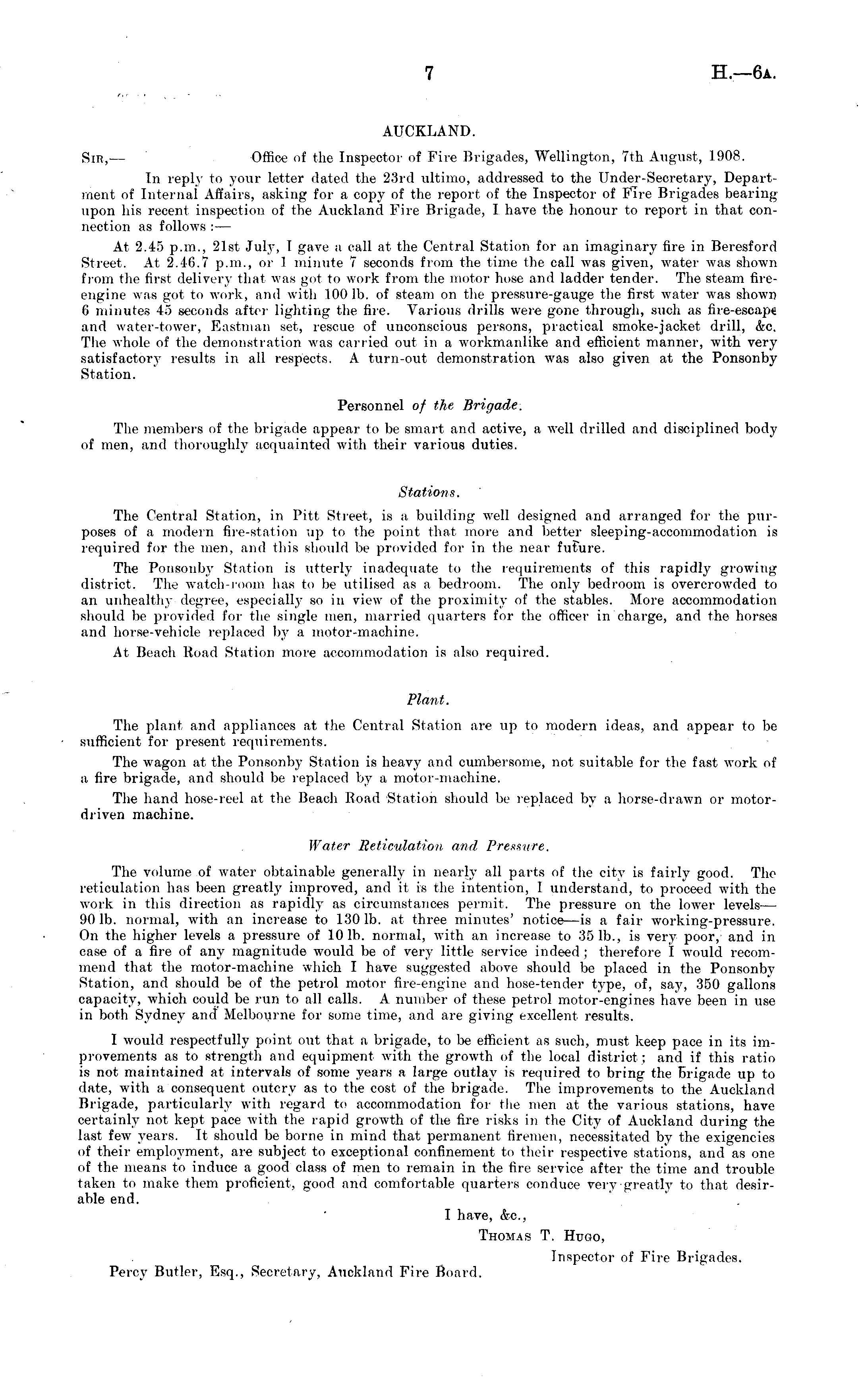 AUCKLAND. Sir, — Office of the Inspector of Fire Brigades, Wellington, 7th August, 1908. In reply to your letter dated the 23rd ultimo, addressed to the Under-Secretary, Department of Internal Affairs, asking for a copy of the report of the Inspector of Fire Brigades bearing upon his recent inspection of the Auckland Fire Brigade, I have the honour to report in that connection as follows :— At 2.4.") p.m., 21st July, I gave a call at the Central Station for an imaginary fire in Beresford Street. At 2.46.7 p.m., or 1 minute 7 seconds from the time the call was given, water was shown from the first delivery that was got to work from the motor hose and ladder tender. The steam fireengine was got to work, and with 100 lb. of steam on the pressure-gauge the first water was shown 6 minutes 45 seconds after lighting the fire. Various drills were gone through, such as fire-escap<; and water-tower, Eastman set, rescue of unconscious persons, practical smoke-jacket drill, &c. The whole of the demonstration was carried out in a workmanlike and efficient manner, with very satisfactory results in all respects. A turn-out demonstration was also given at the Ponsonby Station. Personnel of the Brigade. The members of the brigade appear to be smart and active, a well drilled and disciplined body of men, and thoroughly acquainted with their various duties. Stations. The Central Station, in Pitt Street, is a building well designed and arranged for the purposes of a modern fire-station up to the point that more and better sleeping-accommodation is required for the men, and this should be provided for in the near future. The Ponsonby Station is utterly inadequate to the requirements of tills rapidly growing district. The watch-room lias to be utilised as a bedroom. The only bedroom is overcrowded to an unhealthy degree, especially so in view of the proximity of the stables. More accommodation should be provided for the single men, married quarters for the officer in charge, and the horses and horse-vehicle replaced by a motor-machine. At Beach Road Station more accommodation is also required. Plant. The plant and appliances at the Central Station are up to modern ideas, and appear to be sufficient for present requirements. The wagon at the Ponsonby Station is heavy and cumbersome, not suitable for the fast work of a fire brigade, and should be replaced by a motor-machine. The hand hose-reel at the Beach Road Station should be replaced by a horse-drawn or motordriven machine. Water Reticulation and Pressure. The volume of water obtainable generally in nearly all parts of the city is fairly good. The reticulation has been greatly improved, and it is the intention, 1 understand, to proceed with the work in this direction as rapidly as circumstances permit. The pressure on the lower levels— 90 lb. normal, with an increase to 130 lb. at three minutes' notice—is a fair working-pressure. On the higher levels a pressure of 101b. normal, with an increase to 351b., is very poor, and in case of a fire of any magnitude would be of very little service indeed ; therefore I would recommend that the motor-machine which I have suggested above should be placed in the Ponsonby Station, and should be of the petrol motor fire-engine and hose-tender type, of, say, 350 gallons capacity, which could be run to all calls. A number of these petrol motor-engines have been in use in both Sydney and Melbourne for some time, and are giving excellent results. I would respectfully point out that a brigade, to be efficient as such, must keep pace in its improvements as to strength and equipment with the growth of the local district; and if this ratio is not maintained at intervals of some years a large outlay is required to bring the Brigade up to date, with a consequent outcry as to the cost of the brigade. The improvements to the Auckland Brigade, particularly with regard to accommodation for the men at the various stations, have certainly not kept pace with the rapid growth of the fire risks in the City of Auckland during the last few years. It should be borne in mind that permanent firemen, necessitated by the exigencies of their employment, are subject to exceptional confinement to their respective stations, and as one of the means to induce a good class of men to remain in the fire service after the time and trouble taken to make them proficient, good and comfortable quarters conduce very greatly to that desirable end. I have, &c, Thomas T. Hugo, Inspector of Fire Brigades. Percy Butler, Esq., Secretary, Auckland Fire Board.