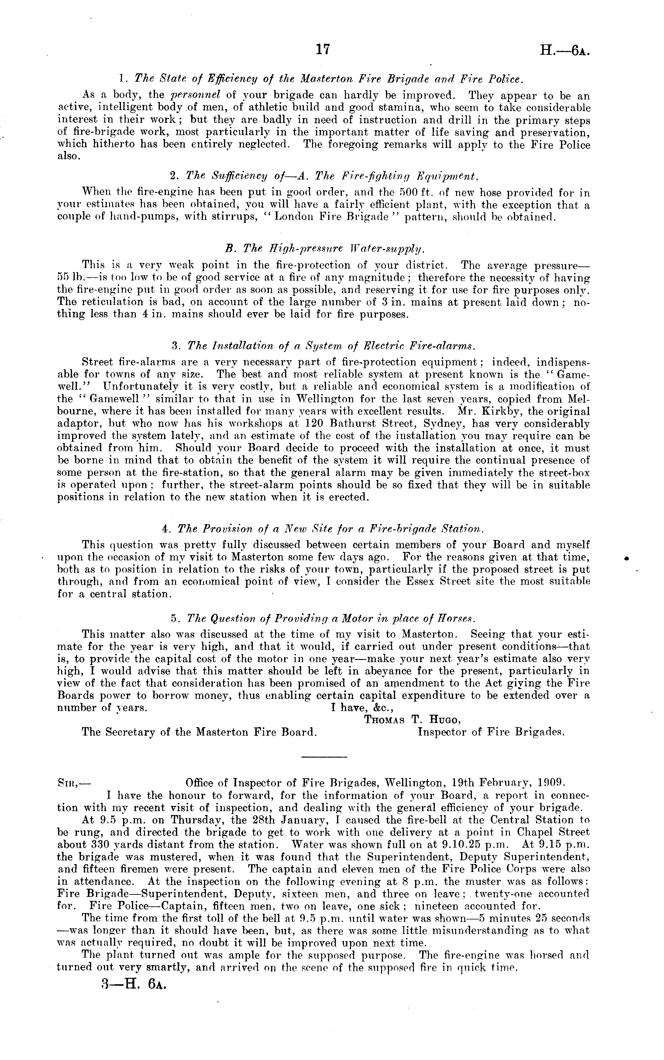 1. The State of Efficiency of the Master , ton Fire Brigade and Fire Police. As a body, the personnel of your brigade can hardly be improved. They appear to be an active, intelligent body of men, of athletic build and good stamina, who seem to take considerable interest in their work; but they are badly in need of instruction and drill in the primary steps of fire-brigade work, most particularly in the important matter of life saving and preservation, which hitherto has been entirely neglected. The foregoing remarks will apply to the Fire Police also. 2. The Sufficiency of — A. The Fire-fighting Equipment. When the fire-engine has been put in good order, and the 500 ft. of new hose provided for in your estimates has been obtained, you will have a fairly efficient plant, with the exception that a couple of hand-pumps, with stirrups, " London Fire Brigade " pattern, should be obtained. B. The High-pressure Water-supply. This is a very weak point in the fire-protection of your district. The average pressure— 55 lb. — is too low to be of good service at a fire of any magnitude; therefore the necessity of having the fire-engine put in good order as soon as possible, and reserving it for use for fire purposes only. The reticulation is bad, on account of the large number of 3 in. mains at present laid down; nothing less than 4 in. mains should ever be laid for fire purposes. 3. The Installation of a System of Electric, Fire-alarms. Street fire-alarms are a very necessary part of fire-protection equipment ; indeed, indispensable for towns of any size. The best and most reliable system at present known is the " Gamewell." Unfortunately it is very costly, but a reliable and economical system is a modification of the " Gamewell " similar to that in use in Wellington for the last seven years, copied from Melbourne, where it has been installed for many years with excellent results. Mr. Kirkby, the original adaptor, but who now lias his workshops at 120 Bathurst Street, Sydney, has very considerably improved the system lately, and an estimate of the cost of the installation you may require can be obtained from him. Should your Board decide to proceed with the installation at once, it must be borne in mind that to obtain the benefit of the system it will require the continual presence of some person at the fire-station, so that the general alarm may be given immediately the street-box is operated upon ; further, the street-alarm points should be so fixed that they will be in suitable positions in relation to the new station when it is erected. 4. The Provision of a New Site for a Fire-brigade Station. This question was pretty fully discussed between certain members of your Board and myself upon the occasion of my visit to Masterton some few days ago. For the reasons given at that time, both as to position in relation to the risks of your town, particularly if the proposed street is put through, and from an economical point of view, I consider the Essex Street site the most suitable for a central station. 5. The Question of Providing a Motor in place of Horses. This matter also was discussed at the time of my visit to Masterton. Seeing that your estimate for the year is very high, and that it would, if carried out under present conditions —that is, to provide the capital cost of the motor in one year—make your next year's estimate also very high, I would advise that this matter should be left in abeyance for the present, particularly in view of the fact that consideration has been promised of an amendment to the Act giving the Fire Boards power to borrow money, thus enabling certain capital expenditure to be extended over a number of years. I have, &c, Thomas T. Hugo, The Secretary of the Masterton Fire Board. Inspector of Fire Brigades. Sir, — Office of Inspector of Fire Brigades, Wellington, 19th February, 1909. I have the honour to forward, for the information of your Board, a report in connection with my recent visit of inspection, and dealing with the general efficiency of your brigade. At 9.5 p.m. on Thursday, the 28th January, I caused the fire-bell at the Central Station to be rung, and directed the brigade to get to work with one delivery at a point in Chapel Street about 330 yards distant from the station. Water was shown full on at 9.10.25 p.m. At 9.15 p.m. the brigade was mustered, when it was found that the Superintendent, Deputy Superintendent, and fifteen firemen v/ere present. The captain and eleven men of the Fire Police Corps were also in attendance. At the inspection on the following evening at 8 p.m. the muster was as follows: Fire Brigade—Superintendent, Deputy, sixteen men, and three on leave ; twenty-one accounted for. Fire Police —Captain, fifteen men, two on leave, one sick ; nineteen accounted for. The time from the first toll of the bell at 9.5 p.m. until water was shown—s minutes 25 seconds —was longer than it should have been, but, as there was some little misunderstanding as to what was actually required, no doubt it will be improved upon next time. The plant turned out was ample for the supposed purpose. The fire-engine was horsed and turned out very smartly, and arrived on the scene of the supposed fire in quick time. 3—H. 6a.