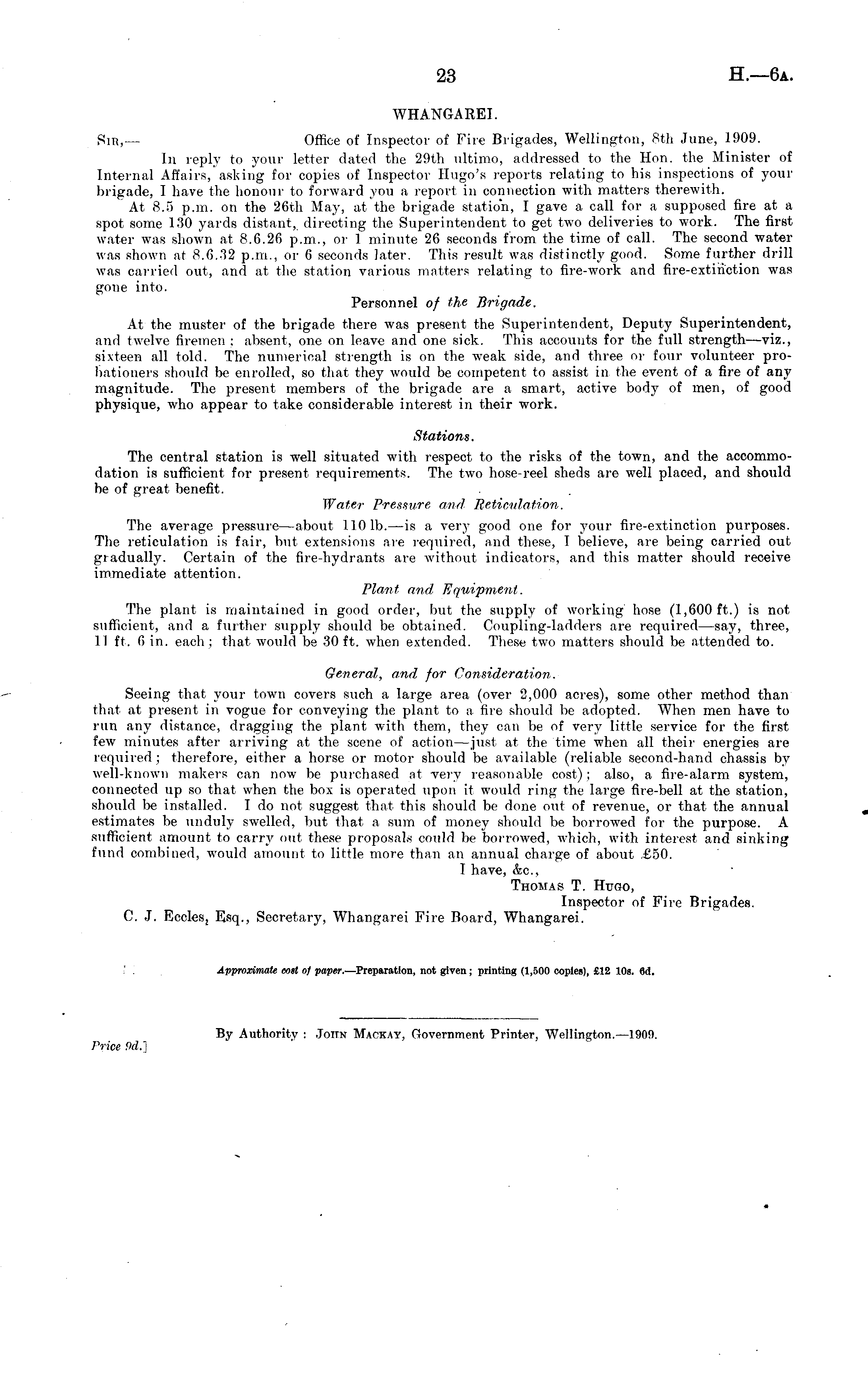 WHANGAREI. Sib,— Office of Inspector of Fire Brigades, Wellington, Bth June, 1909. In reply to your letter dated the 29th ultimo, addressed to the Hon. the Minister of Internal Affairs, asking for copies of Inspector Hugo's reports relating to his inspections of your brigade, I have the honour to forward you a report in connection with matters therewith. At 8.5 p.m. on the 26th May, at the brigade station, I gave a call for a supposed fire at a spot some 130 yards distant,, directing the Superintendent to get two deliveries to work. The first water was shown at 8.6.26 p.m., or 1 minute 26 seconds from the time of call. The second water was shown at 8.6..'52 p.m., or 6 seconds later. This result was distinctly good. Some further drill was carried out, and at the station various matters relating to fire-work and fire-extinction was gone into. Personnel of the Brigade. At the muster of the brigade there was present the Superintendent, Deputy Superintendent, and twelve firemen ; absent, one on leave and one sick. This accounts for the full strength-—viz., sixteen all told. The numerical strength is on the weak side, and three or four volunteer probationers should bo enrolled, so that they would be competent to assist in the event of a fire of any magnitude. The present members of the brigade are a smart, active body of men, of good physique, who appear to take considerable interest in their work. Stations. The central station is well situated with respect to the risks of the town, and the accommodation is sufficient for present requirements. The two hose-reel sheds are well placed, and should be of great benefit. Water Pressure and Reticulation. The average pressure—about 110 Ib.—is a very good one for your fire-extinction purposes. The reticulation is fair, but extensions are required, and these, I believe, are being carried out gradually. Certain of the fire-hydrants are without indicators, and this matter should receive immediate attention. Plant and Equipment. The plant is maintained in good order, but the supply of working hose (1,600 ft.) is not sufficient, and a further supply should be obtained. Coupling-ladders are required —say, three, II ft. 6 in. each ; that would be 30 ft. when extended. These two matters should be attended to. General, and for Consideration. Seeing that your town covers such a large area (over 2,000 acres), some other method than that at present in vogue for conveying the plant to a fire should lie adopted. When men have to run any distance, dragging the plant with them, they can be of very little service for the first few minutes after arriving at the scene of action —just at the time when all their energies are required ; therefore, either a horse or motor should be available (reliable second-hand chassis by well-known makers can now be purchased at very reasonable cost); also, a fire-alarm system, connected up so that when the box is operated upon it would ring the large fire-bell at the station, should be installed. Ido not suggest that this should be done out of revenue, or that the annual estimates be unduly swelled, but that a sum of money should be borrowed for the purpose. A sufficient amount to carry out these proposals could lie borrowed, which, with interest and sinking fund combined, would amount to little more than an annual charge of about .£5O. I have, &c, Thomas T. Hugo, Inspector of Fire Brigades. C. J. Eccles, Esq., Secretary, Whangarei Fire Board, Whangarei.