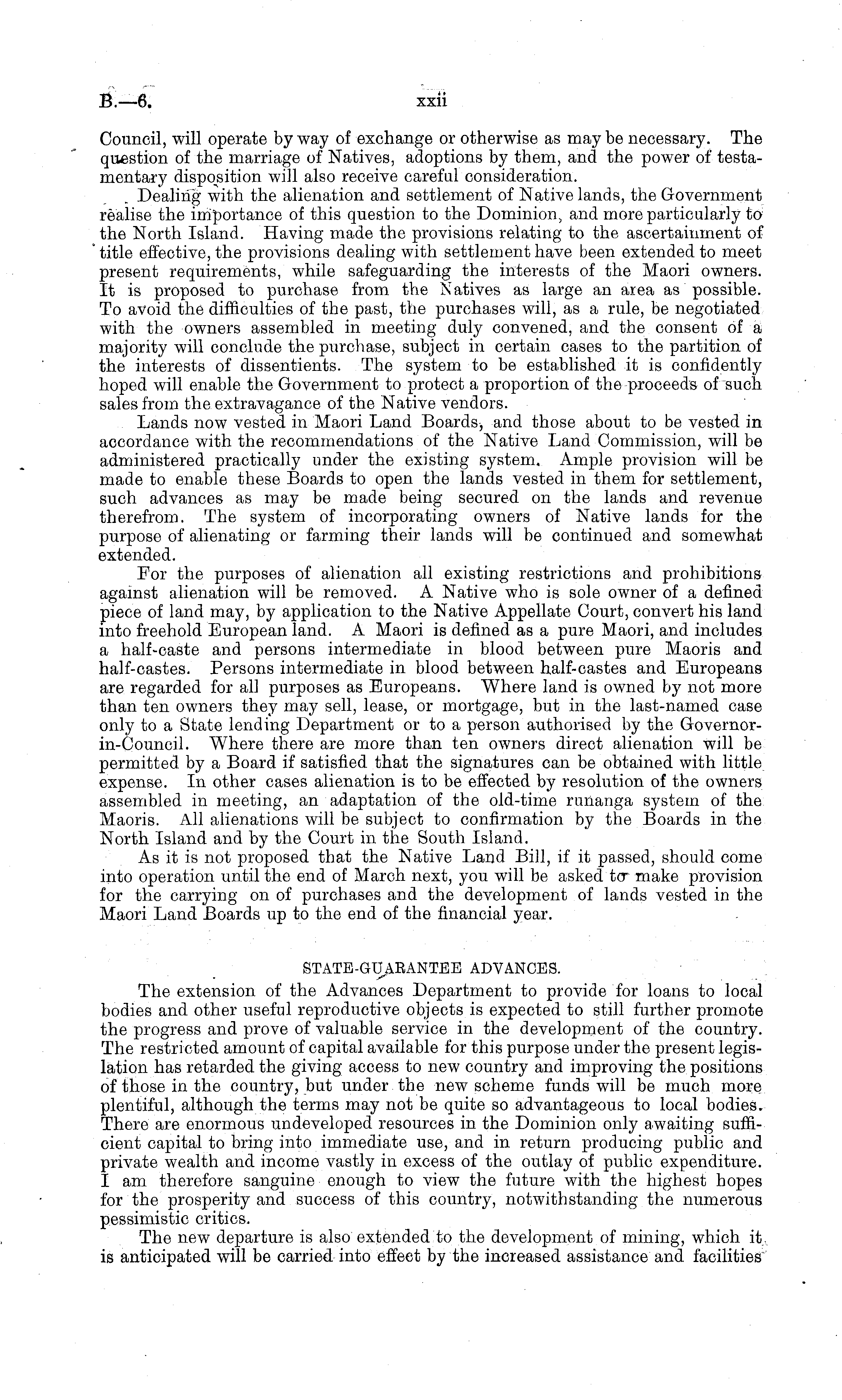 Council, will operate by way of exchange or otherwise as may be necessary. The question of the marriage of Natives, adoptions by them, and the power of testamentary disposition will also receive careful consideration. Dealing with the alienation and settlement of Native lands, the Government realise the importance of this question to the Dominion, and more particularly to the North Island. Having made the provisions relating to the ascertainment of title effective, the provisions dealing with settlement have been extended to meet present requirements, while safeguarding the interests of the Maori owners. It is proposed to purchase from the Natives as large an area as possible. To avoid the difficulties of the past, the purchases will, as a rule, be negotiated with the owners assembled in meeting duly convened, and the consent of a majority will conclude the purchase, subject in certain cases to the partition of the interests of dissentients. The system to be established it is confidently hoped will enable the Government to protect a proportion of the proceeds of such sales from the extravagance of the Native vendors. Lands now vested in Maori Land Boards, and those about to be vested in accordance with the recommendations of the Native Land Commission, will be administered practically under the existing system. Ample provision will be made to enable these Boards to open the lands vested in them for settlement, such advances as may be made being secured on the lands and revenue therefrom. The system of incorporating owners of Native lands for the purpose of alienating or farming their lands will be continued and somewhat extended. For the purposes of alienation all existing restrictions and prohibitions against alienation will be removed. A Native who is sole owner of a defined piece of land may, by application to the Native Appellate Court, convert his land into freehold European land. A Maori is defined as a pure Maori, and includes a half-caste and persons intermediate in blood between pure Maoris and half-castes. Persons intermediate in blood between half-castes and Europeans are regarded for all purposes as Europeans. Where land is owned by not more than ten owners they may sell, lease, or mortgage, but in the last-named case only to a State lending Department or to a person authorised by the Governor-in-Council. Where there are more than ten owners direct alienation will be permitted by a Board if satisfied that the signatures can be obtained with little expense. In other cases alienation is to be effected by resolution of the owners assembled in meeting, an adaptation of the old-time ruiianga system of the Maoris. All alienations will be subject to confirmation by the Boards in the North Island and by the Court in the South Island. As it is not proposed that the Native Land Bill, if it passed, should come into operation until the end of March next, you will be asked lv make provision for the carrying on of purchases and the development of lands vested in the Maori Land Boards up to the end of the financial year. STATE-GUARANTEE ADVANCES. The extension of the Advances Department to provide for loans to local bodies and other useful reproductive objects is expected to still further promote the progress and prove of valuable service in the development of the country. The restricted amount of capital available for this purpose under the present legislation has retarded the giving access to new country and improving the positions of those in the country, but under the new scheme funds will be much more plentiful, although the terms may not be quite so advantageous to local bodies. There are enormous undeveloped resources in the Dominion only awaiting sufficient capital to bring into immediate use, and in return producing public and private wealth and income vastly in excess of the outlay of public expenditure. I am therefore sanguine enough to view the future with the highest hopes for the prosperity and success of this country, notwithstanding the numerous pessimistic critics. The new departure is also extended to the development of mining, which it. is anticipated will be carried into effect by the increased assistance and facilities