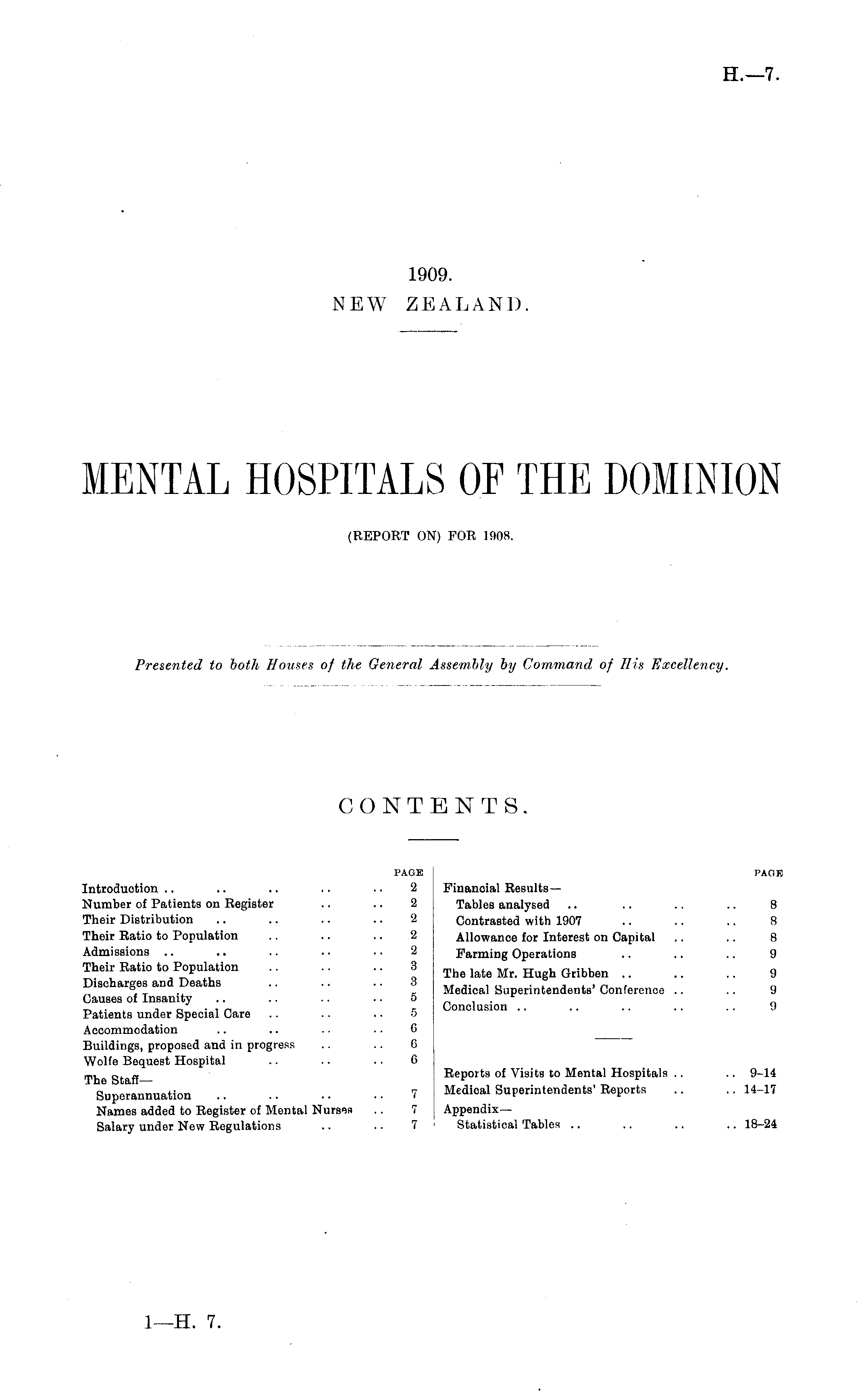 CONTENTS. PAGE PAOE Introduction .. .. .. .. .. 2 Pinanoial ResultsNumber of Patients on Register .. .. 2 Tables analysed .. .. .. .. 8 Their Distribution .. .. .. .. 2 Contrasted with 1907 .. .. .. 8 Their Ratio to Population .. .. .. 2 Allowance for Interest on Capital .. .. 8 Admissions .. .. .. .. .. 2 Farming Operations .. .. .. 9 Their Ratio to Population 3 The late Mr . Hu gh Gribben 9 Discharges and Deaths .. .. .. o _~ .. ~, . . ~ , „ , „ _, _ ~ _- Medical Superintendents Conference .. .. 9 Causes of Insanity .. .. .. ••»__,.* n „,. . _ ~ - ,- Conclusion .. .. .. .. .. 9 Patients under Special Care .. .. .. 5 Accommodation .. .. .. .. 6 Buildings, proposed and in progress .. .. 6 Wolfe Bequest Hospital .. .. .. 6 _.. „ „ Reports of Visits to Mental Hospitals .. .. 9-14 S-perannuation 7 Medical Superintendents'Reports .. .. 14-17 Names added to Register of Mental Nursos .. 7 Appendix— Salary under New Regulations .. .. 7 Statistical Tables .. .. .. .. 18-24