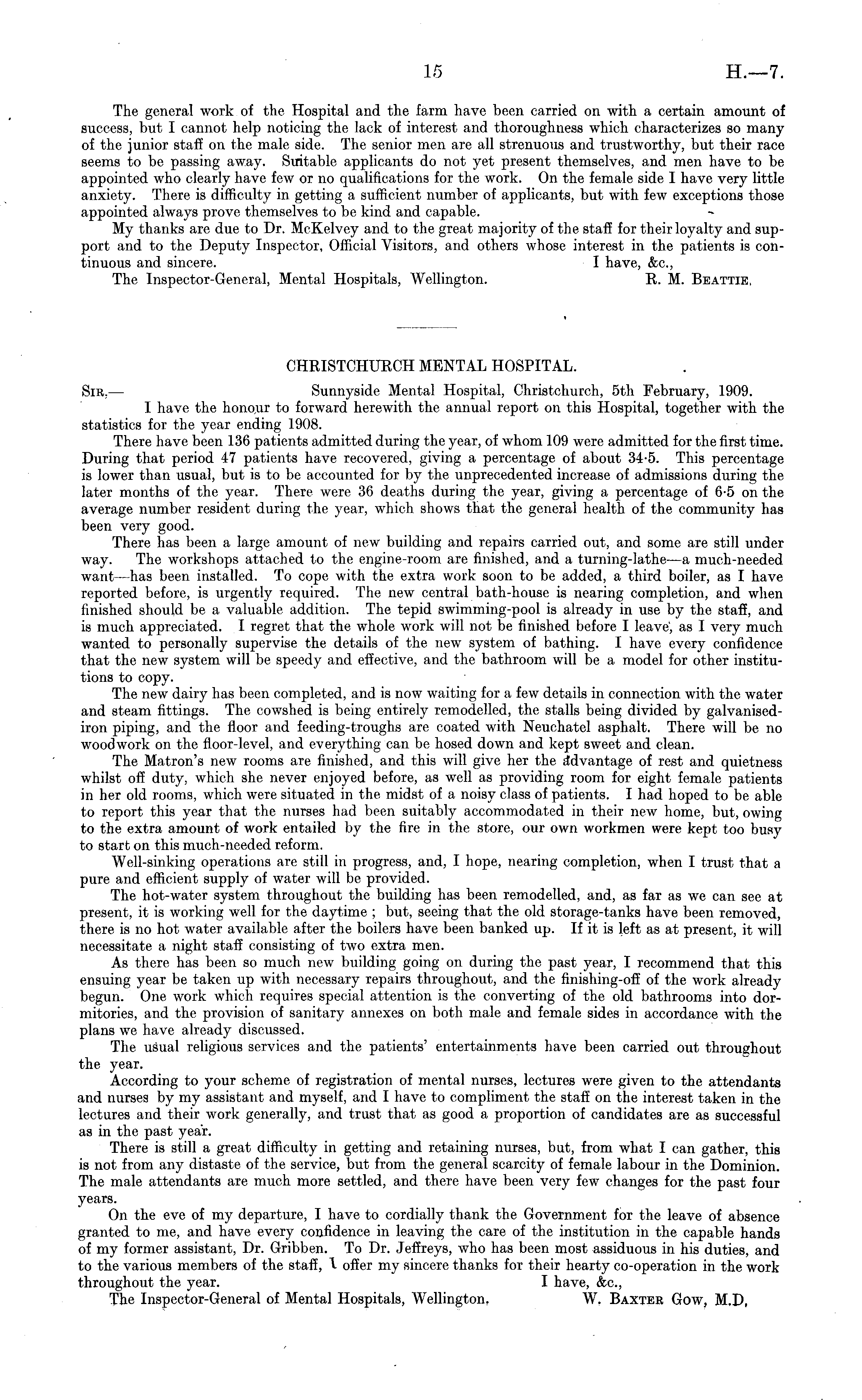 The general work of the Hospital and the farm have been carried on with a certain amount of success, but I cannot help noticing the lack of interest and thoroughness which characterizes so many of the junior staff on the male side. The senior men are all strenuous and trustworthy, but their race seems to be passing away. Suitable applicants do not yet present themselves, and men have to be appointed who clearly have few or no qualifications for the work. On the female side I have very little anxiety. There is difficulty in getting a sufficient number of applicants, but with few exceptions those appointed always prove themselves to be kind and capable. My thanks are due to Dr. McKelvey and to the great majority of the staff for their loyalty and support and to the Deputy Inspector, Official Visitors, and others whose interest in the patients is continuous and sincere. I have, &c, The Inspector-General, Mental Hospitals, Wellington. R. M. Beattie, » CHRISTCHUECH MENTAL HOSPITAL. Sir, — Sunnyside Mental Hospital, Christchurch, sth February, 1909. I have the hono.ur to forward herewith the annual report on this Hospital, together with the statistics for the year ending 1908. There have been 136 patients admitted during the year, of whom 109 were admitted for the first time. During that period 47 patients have recovered, giving a percentage of about 34-5. This percentage is lower than usual, but is to be accounted for by the unprecedented increase of admissions during the later months of the year. There were 36 deaths during the year, giving a percentage of 6-5 on the average number resident during the year, which shows that the general health of the community has been very good. There has been a large amount of new building and repairs carried out, and some are still under way. The workshops attached to the engine-room are finished, and a turning-lathe—a much-needed want —has been installed. To cope with the extra work soon to be added, a third boiler, as I have reported before, is urgently required. The new central bath-house is nearing completion, and when finished should be a valuable addition. The tepid swimming-pool is already in use by the staff, and is much appreciated. I regret that the whole work will not be finished before I leave, as I very much wanted to personally supervise the details of the new system of bathing. I have every confidence that the new system will be speedy and effective, and the bathroom will be a model for other institutions to copy. The new dairy has been completed, and is now waiting for a few details in connection with the water and steam fittings. The cowshed is being entirely remodelled, the stalls being divided by galvanisediron piping, and the floor and feeding-troughs are coated with Neuchatel asphalt. There will be no woodwork on the floor-level, and everything can be hosed down and kept sweet and clean. The Matron's new rooms are finished, and this will give her the advantage of rest and quietness whilst off duty, which she never enjoyed before, as well as providing room for eight female patients in her old rooms, which were situated in the midst of a noisy class of patients. I had hoped to be able to report this year that the nurses had been suitably accommodated in their new home, but, owing to the extra amount of work entailed by the fire in the store, our own workmen were kept too busy to start on this much-needed reform. Well-sinking operations are still in progress, and, I hope, nearing completion, when I trust that a pure and efficient supply of water will be provided. The hot-water system throughout the building has been remodelled, and, as far as we can see at present, it is working well for the daytime ; but, seeing that the old storage-tanks have been removed, there is no hot water available after the boilers have been banked up. If it is left as at present, it will necessitate a night staff consisting of two extra men. As there has been so much new building going on during the past year, I recommend that this ensuing year be taken up with necessary repairs throughout, and the finishing-off of the work already begun. One work which requires special attention is the converting of the old bathrooms into dormitories, and the provision of sanitary annexes on both male and female sides in accordance with the plans we have already discussed. The usual religious services and the patients' entertainments have been carried out throughout the year. According to your scheme of registration of mental nurses, lectures were given to the attendants and nurses by my assistant and myself, and I have to compliment the staff on the interest taken in the lectures and their work generally, and trust that as good a proportion of candidates are as successful as in the past year. There is still a great difficulty in getting and retaining nurses, but, from what I can gather, this is not from any distaste of the service, but from the general scarcity of female labour in the Dominion. The male attendants are much more settled, and there have been very few changes for the past four years. On the eve of my departure, I have to cordially thank the Government for the leave of absence granted to me, and have every confidence in leaving the care of the institution in the capable hands of my former assistant, Dr. Gribben. To Dr. Jeffreys, who has been most assiduous in his duties, and to the various members of the staff, 1 offer my sincere thanks for their hearty co-operation in the work throughout the year. I have, &c, The Inspector-General of Mental Hospitals, Wellington, W. Baxter Gow, M.D,