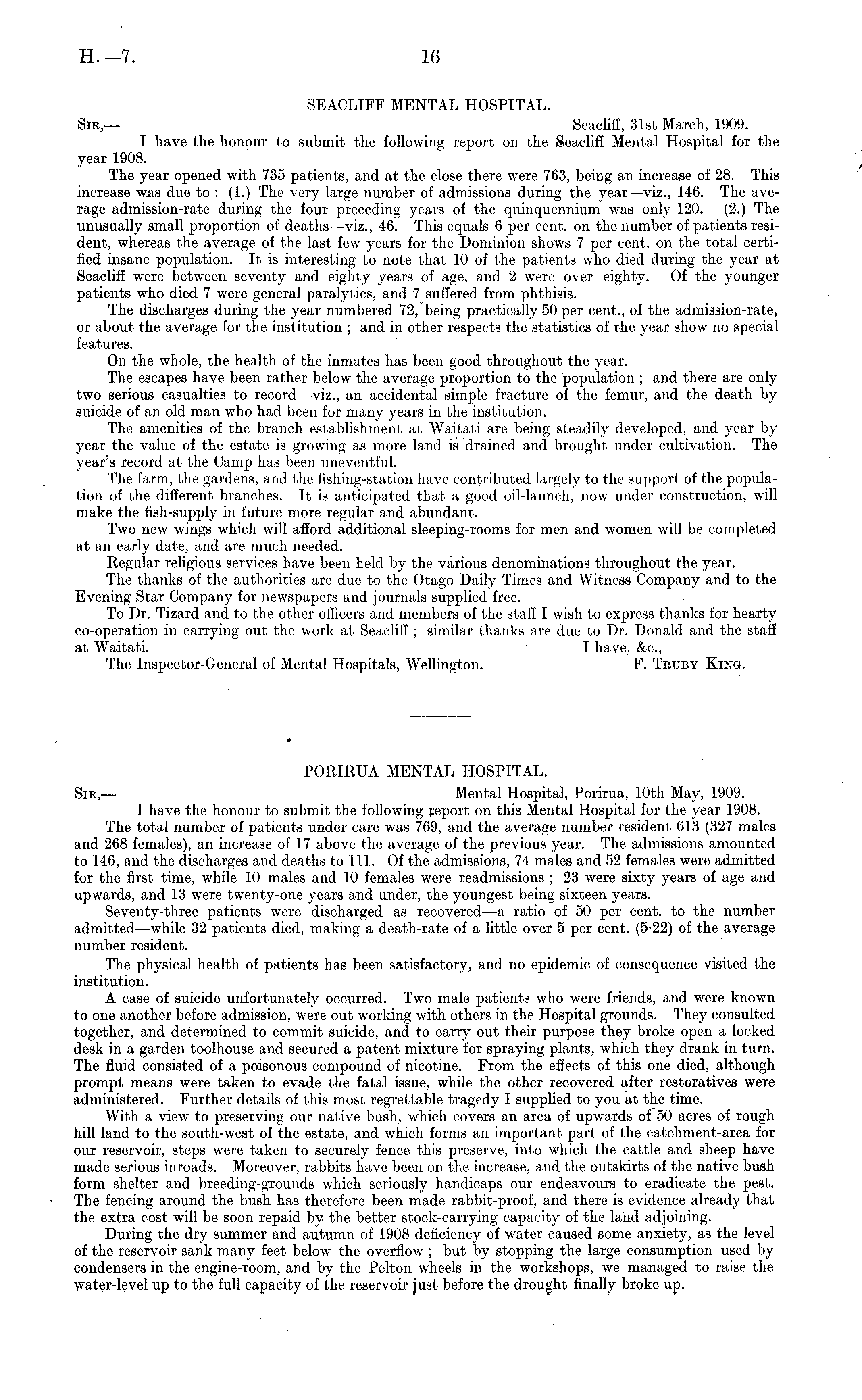 SEACLIFF MENTAL HOSPITAL. Sir,— Seacliff, 31st March, 1909. I have the honour to submit the following report on the Seacliff Mental Hospital for the year 1908. The year opened with 735 patients, and at the close there were 763, being an increase of 28. This increase was due to : (1.) The very large number of admissions during the year —viz., 146. The average admission-rate during the four preceding years of the quinquennium was only 120. (2.) The unusually small proportion of deaths —viz., 46. This equals 6 per cent, on the number of patients resident, whereas the average of the last few years for the Dominion shows 7 per cent, on the total certified insane population. It is interesting to note that 10 of the patients who died during the year at SeaclifE were between seventy and eighty years of age, and 2 were over eighty. Of the younger patients who died 7 were general paralytics, and 7 suffered from phthisis. The discharges during the year numbered 72, being practically 50 per cent., of the admission-rate, or about the average for the institution ; and in other respects the statistics of the year show no special features. On the whole, the health of the inmates has been good throughout the year. The escapes have been rather below the average proportion to the population ; and there are only two serious casualties to record —viz., an accidental simple fracture of the femur, and the death by suicide, of an old man who had been for many years in the institution. The amenities of the branch establishment at Waitati are being steadily developed, and year by year the value of the estate is growing as more land is drained and brought under cultivation. The year's record at the Camp has been uneventful. The farm, the gardens, and the fishing-station have contributed largely to the support of the population of the different branches. It is anticipated that a good oil-launch, now under construction, will make the fish-supply in future more regular and abundant. Two new wings which will afford additional sleeping-rooms for men and women will be completed at an early date, and are much needed. Regular religious services have been held by the various denominations throughout the year. The thanks of the authorities are due to the Otago Daily Times and Witness Company and to the Evening Star Company for newspapers and journals supplied free. To Dr. Tizard and to the other officers and members of the staff I wish to express thanks for hearty co-operation in carrying out the work at SeaclifE; similar thanks are due to Dr. Donald and the staff at Waitati. I have, &c, The Inspector-General of Mental Hospitals, Wellington. F. Teuby King. PORIRUA MENTAL HOSPITAL. Sir,— Mental Hospital, Porirua, 10th May, 1909. I have the honour to submit the following report on this Mental Hospital for the year 1908. The total number of patients under care was 769, and the average number resident 613 (327 males and 268 females), an increase of 17 above the average of the previous year. The admissions amounted to 146, and the discharges and deaths to 111. Of the admissions, 74 males and 52 females were admitted for the first time, while 10 males and 10 females were readmissions ; 23 were sixty years of age and upwards, and 13 were twenty-one years and under, the youngest being sixteen years. Seventy-three patients were discharged as recovered —a ratio of 50 per cent, to the number admitted —while 32 patients died, making a death-rate of a little over 5 per cent. (5-22) of the average number resident. The physical health of patients has been satisfactory, and no epidemic of consequence visited the institution. A case of suicide unfortunately occurred. Two male patients who were friends, and were known to one another before admission, were out working with others in the Hospital grounds. They consulted together, and determined to commit suicide, and to carry out their purpose they broke open a locked desk in a garden toolhouse and secured a patent mixture for spraying plants, which they drank in turn. The fluid consisted of a poisonous compound of nicotine. From the effects of this one died, although prompt means were taken to evade the fatal issue, while the other recovered after restoratives were administered. Further details of this most regrettable tragedy I supplied to you at the time. With a view to preserving our native bush, which covers an area of upwards of 50 acres of rough hill land to the south-west of the estate, and which forms an important part of the catchment-area for our reservoir, steps were taken to securely fence this preserve, into which the cattle and sheep have made serious inroads. Moreover, rabbits have been on the increase, and the outskirts of the native bush form shelter and breeding-grounds which seriously handicaps our endeavours to eradicate the pest. The fencing around the bush has therefore been made rabbit-proof, and there is evidence already that the extra cost will be soon repaid by the better stock-carrying capacity of the land adjoining. During the dry summer and autumn of 1908 deficiency of water caused some anxiety, as the level of the reservoir sank many feet below the overflow ; but by stopping the large consumption used by condensers in the engine-room, and by the Pelton wheels in the workshops, we managed to raise the water-level up to the full capacity of the reservoir just before the drought finally broke up.