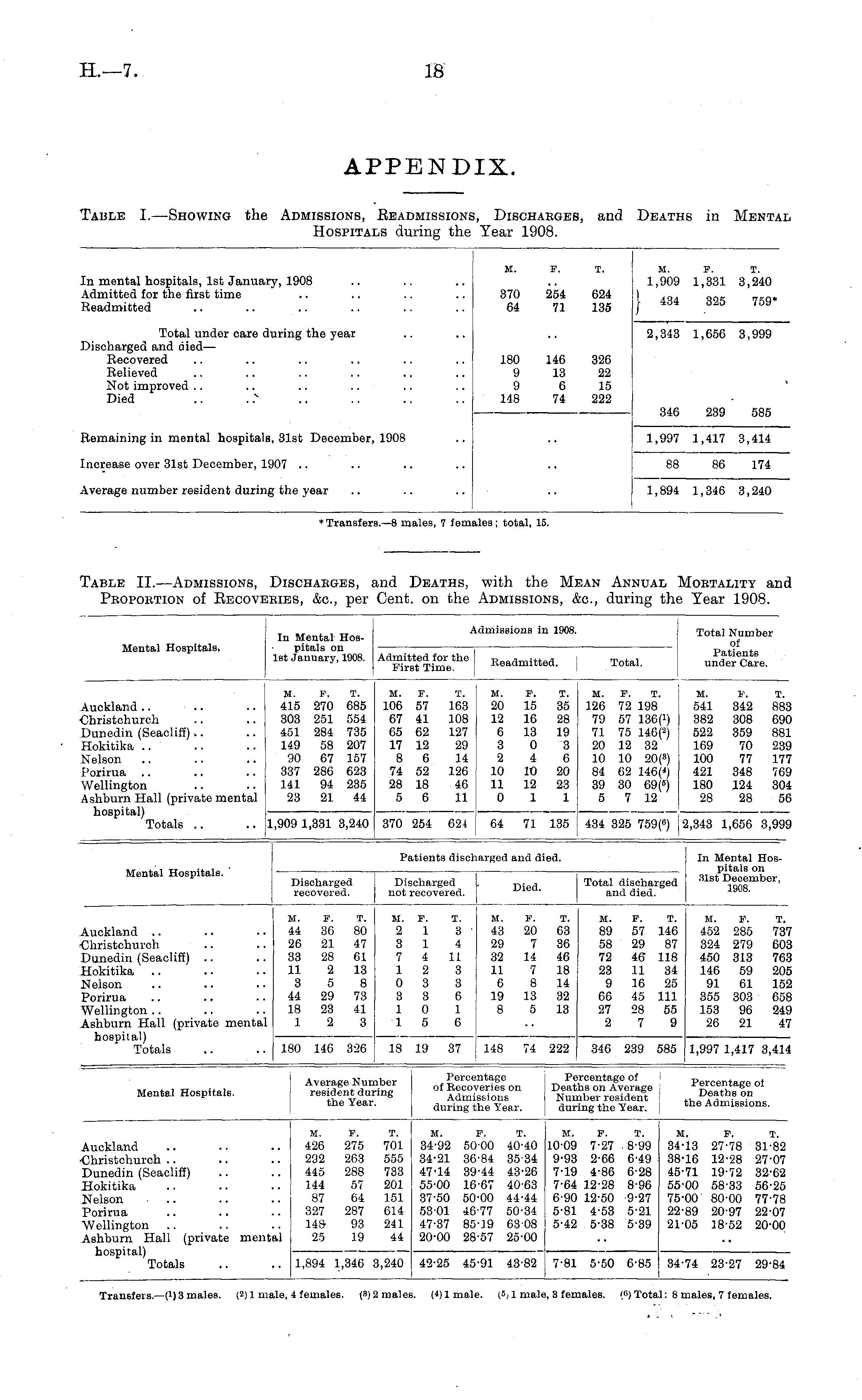 Mental Hospitals. In Mental Hospitals on 1st January, 1908. Admitted for the First Time. Admissions in 1908. Emissions in 190 Readmitted. 08. Total Number Patients under Care. Total. Auckland Christchurch Dunedin (Seacliff) Hokitika Nelson Porirua Wellington Ashburn Hall (private mental hospital) Totals 415 270 685 303 251 554 451 284 735 149 58 207 90 67 157 337 286 623 141 94 235 23 21 44 M. F. 106 57 67 41 65 62 17 12 8 6 74 52 28 18 5 6 T. M. 163 20 108 : 12 127 6 29 3 14 2 126 10 46 11 11 0 F. 15 16 13 0 4 10 12 1 T. 35 28 19 3 6 20 23 1 M. F. T. 126 72 198 79 57 136(!) 71 75 146( 2 ) 20 12 32 10 10 20( s ) 84 62 146 ( 4 ) 39 30 69( 5 ) 5 7 12 M. 541 382 522 169 100 421 180 28 F. 342 308 359 70 77 348 124 28 T. 883 690 881 239 177 769 304 56 1,909 1,331 3,240 370 254 624 64 71 135 434 325 759( 8 ) 2,343 1,656 3,999 Mental Hospitals. Discharged recovered. Discharged not recovered. Patients discharged and died. In Mental Hospitals on 31st December, 1908. Died. Total discharged and died. Auckland Christchurch Dunedin (Seacliff) Hokitika Nelson Porirua Wellington Ashburn Hall (private mental hospital) Totals M. 44 26 33 11 3 44 18 1 F. 36 21 28 2 5 29 23 2 T. 80 47 61 13 8 73 41 3 M. F. 2 1 3 1 7 4 1 2 0 3 3 3 1 0 1 5 T. 3 ' 4 11 3 3 6 1 6 M. 43 29 32 11 6 19 8 F. 20 7 14 7 8 13 5 T. 63 36 46 18 14 32 13 II, 89 58 72 23 9 66 27 2 F. T. 57 146 29 87 46 118 11 34 16 25 45 111 28 55 7 9 M. F. 452 285 324 279 450 313 146 59 91 61 355 303 153 96 26 21 T. 737 603 763 205 152 658 249 47 180 146 326 18 19 37 148 74 222 346 239 585 1,997 1,417 3,414 Mental Hospitals. Average Num resident dur: the Year. lber ■ing Percentage of Recoveries on Admissions during the Year. P. Deal Nui du: *rcentage of hs on Average nber resident ing the Year. Percentage of Deaths on the Admissions. Auckland ■Christchurch Dunedin (Seaoliff) Hokitika Nelson Porirua Wellington Ashburn Hall (private mental hospital) Totals M. 426 292 445 144 87 327 14a 25 F. 275 263 288 57 64 287 93 19 T. 701 555 733 201 151 614 241 44 M. F. T. 34-92 50-00 40-40 34-21 36-84 3534 47-14 39-44 43-26 55-00 16-67 4063 37-50 50-00 44-44 53-01 46-77 50-34 47-37 85-19 6308 20-00 28-57 25-00 M. F. T. 10-09 7-27 8-99 9-93 2-66 6-49 7-19 4-86 6-28 7-64 12-28 8-96 6-90 12-50 9-27 5-81 4-53 5-21 5-42 5-38 5-39 M. F. I. 34-13 27-78 31-82 38-16 12-28 27-07 45-71 19-72 32-62 55-00 58-33 56-25 75-00 80-00 77-78 22-89 20-97 22-07 21-05 18-52 20-00 1,894 1,346 3,240 42-25 45-91 43-82 7-81 5-50 6-85 34-74 23-27 29-84 Transfers.—(i) 3 males. ( 2 ) 1 male, 4 females. (3)2malei (4)1 male. (f>, 1 mali ), 3 females. ! e ) Total: 8 males, 7 females.