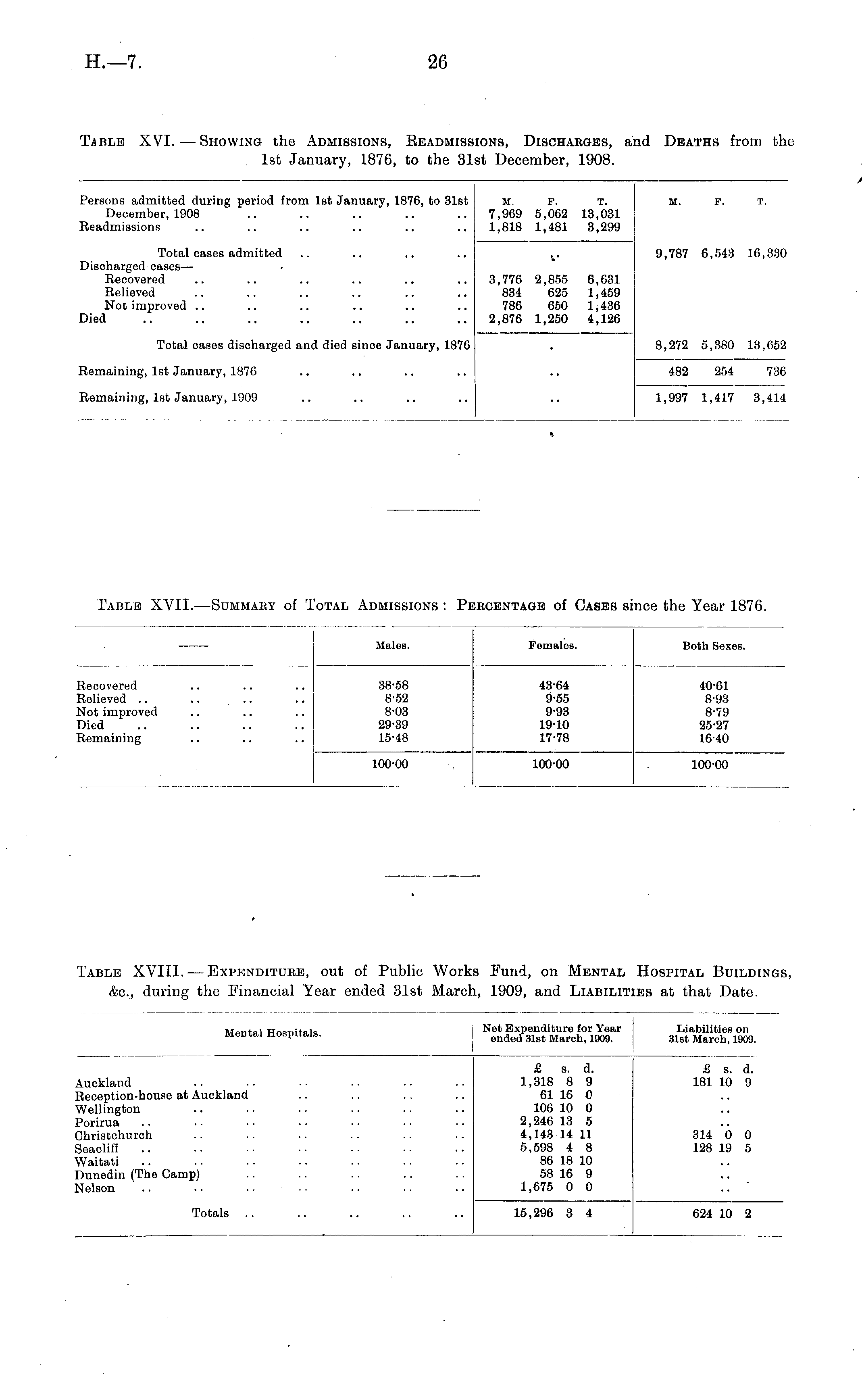 Table XVI.—Showing the Admissions, Readmissions, Discharges, and Deaths from the 1st January, 1876, to the 31st December, 1908.