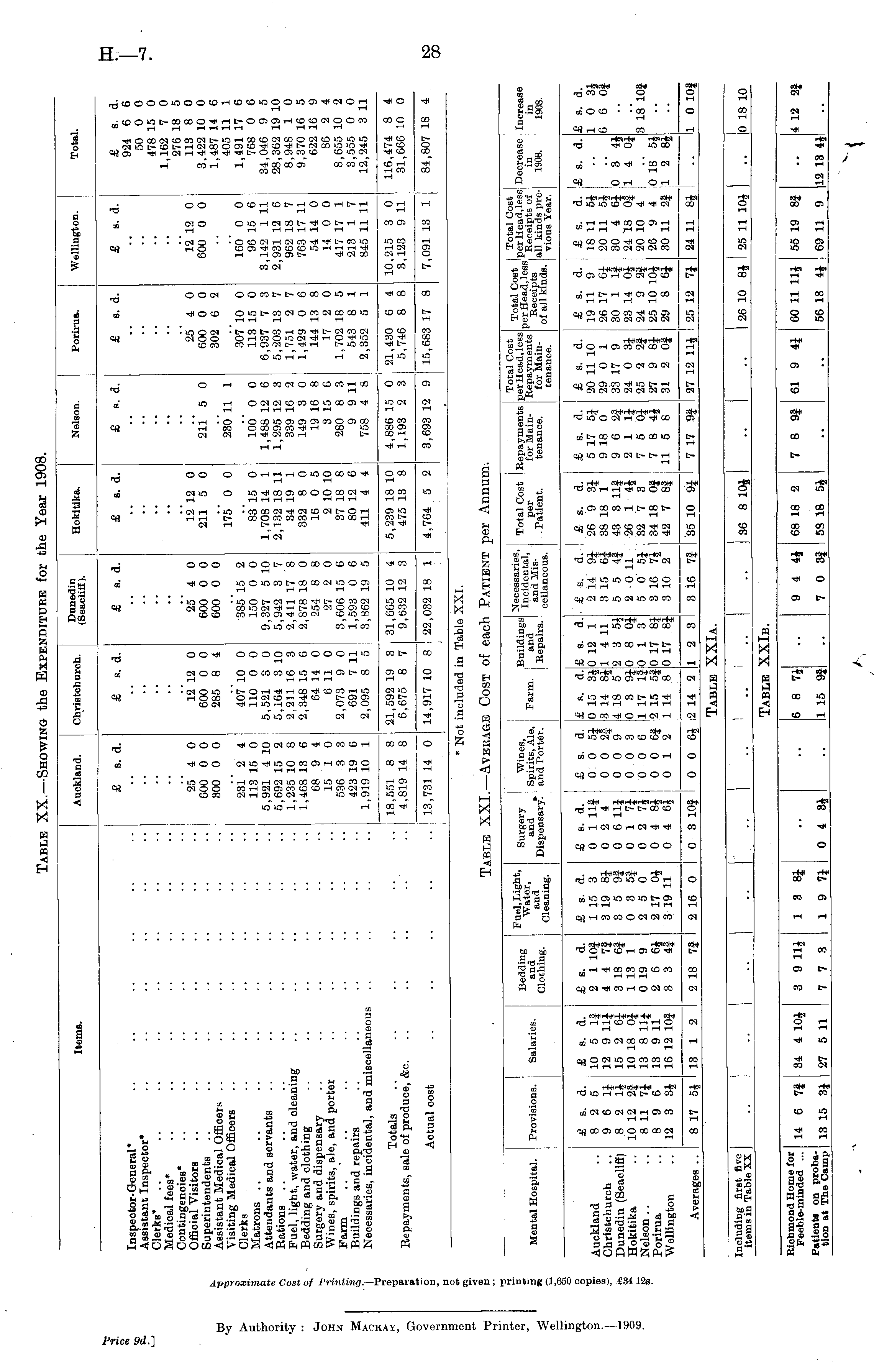 Items. Auckland. Chrietchurch. Dunedin (Seaclifl). Hokitika. Nelson. Porirua. Wellington. Total. £ s. d. £ s. d. £ s. d. £ s. d. £ (.. d. £ s. d. £ s. d. £ s. d. 924 6 6 50 0 0 478 15 0 1,162 7 0 276 18 5 113 8 0 3,422 10 0 1,487 14 6 405 11 1 1,491 17 6 768 0 6 34,046 9 5 28,362 19 10 8,948 1 0 9,370 16 5 622 16 9 86 2 4 8,655 10 2 3,555 0 0 12,245 3 11 116,474 8 4 31,666 10 0 Inspector-General* Assistant Inspector' Clerks' .. Medical fees* Contingencies* Official Visitors Superintendents Assistant Medical Officers Visiting Medical Officers Clerks Matrons Attendants and servants Rations Fuel, light, water, and cleaning Bedding and clothing Surgery and dispensary Wines, spirits, ale, and porter Farm .. ' Buildings and repairs Necessaries, incidental, and miscellaneous 25 4 0 600 0 0 300 0 0 231 2 4 113 15 0 5,921 4 10 5,692 15 2 1,235 10 8 1,468 13 6 68 9 4 15 1 0 536 3 3 423 19 6 1,919 10 1 12 12 0 600 0 0 285 8 4 407 10 0 110 0 0 5,521 3 0 5,164 3 10 2,211 16 3 2,348 15 6 64 14 0 6 11 0 2,073 9 0 691 7 11 2,095 8 5 25 4 0 600 0 0 600 0 0 385 15 2 150 0 0 9,327 5 10 5,942 3 7 2,411 17 8 2,878 18 0 254 8 8 27 2 0 3,606 15 6 1,593 0 6 3,862 19 5 12 12 0 211 5 0 175' 0 0 83 15 0 1,708 14 1 2,132 18 11 34 19 1 332 8 0 16 0 5 2 10 10 37 18 8 80 12 6 411 4 4 211 5 0 230 11 1 100 0 0 1,488 12 6 1,295 12 3 339 16 2 149 3 0 19 16 8 3 15 6 280 8 3 9 9 11 758 4 8 25 4 0 600 0 0 302 6 2 307 10 0 113 15 0 6,937 7 3 5,203 13 7 1,751 2 7 1,429 0 6 144 13 8 17 2 0 1,702 18 5 543 8 1 2,352 5 1 12 12 0 600 0 0 160 0 0 96 15 6 3,142 1 11 2,931 12 6 962 18 7 763 17 11 54 14 0 14 0 0 417 17 1 213 1 7 845 11 11 Totals Repayments, sale of produce, &c. 18,551 8 8 4,819 14 8 21,592 19 3 6,675 8 7 31,665 10 4 9,632 12 3 5,239 18 10 475 13 8 4,886 15 0 1,193 2 3 21,430 6 4 5,746 8 8 10,215 3 0 3,123 9 11 Actual cost 13,731 14 0 14,917 10 8 22,032 18 1 4,764 5 2 3,693 12 9 15,683 17 8 7,091 13 1 84,807 18 4 * N( it included in Table XXI.