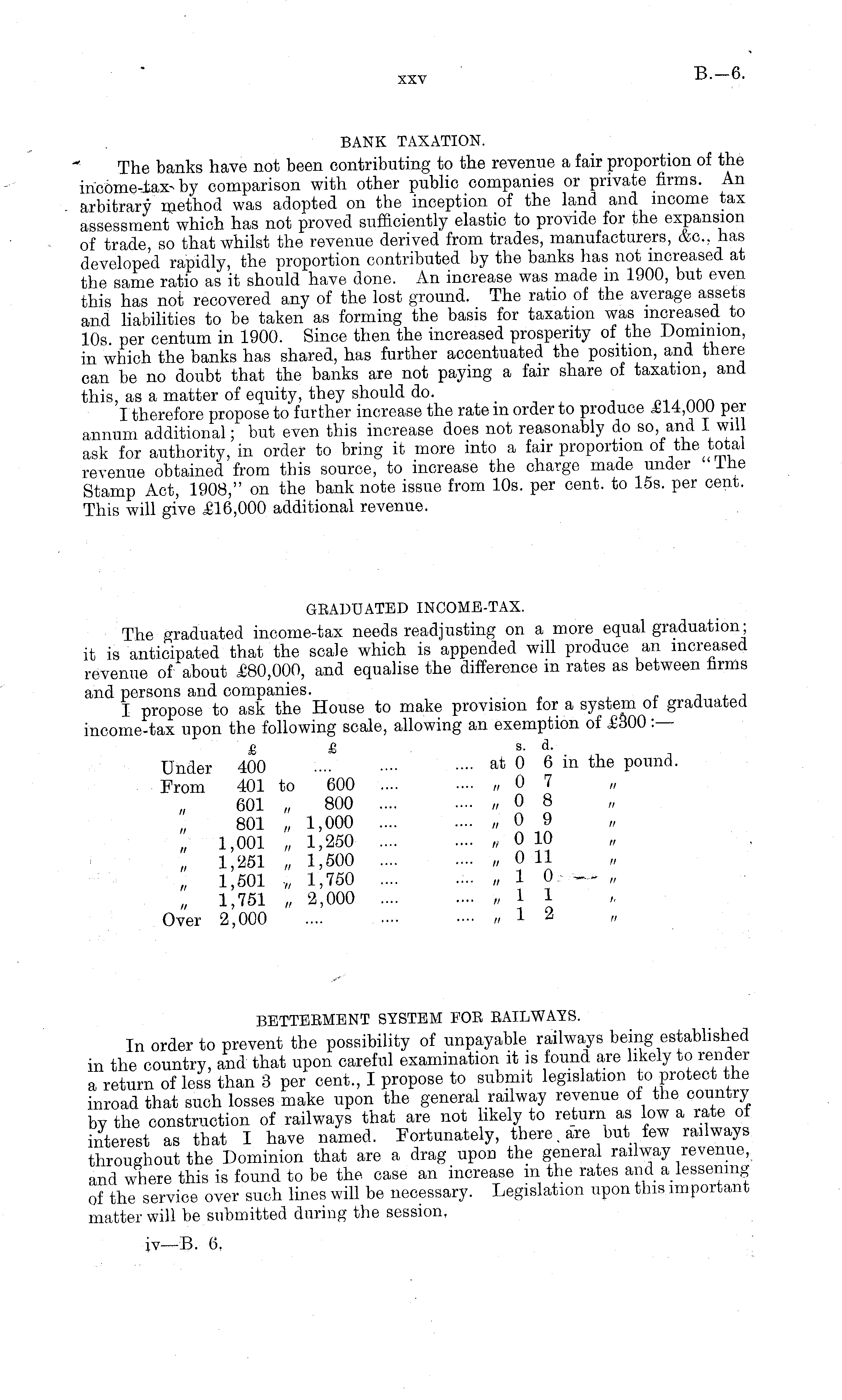 BANK TAXATION. The banks have not been contributing to the revenue a fair proportion of the income-tax-by comparison with other public companies or private firms. An arbitrary method was adopted on the inception of the land and income tax assessment which has not proved sufficiently elastic to provide for the expansion of trade so that whilst the revenue derived from trades, manufacturers, &c. has developed rapidly, the nroportion contributed by the banks has not increased at the same ratio as it should have done. An increase was made in 1900, but even this has not recovered any of the lost ground. The ratio of the average assets and liabilities to be taken as forming the basis for taxation was increased to 10s per centum in 1900. Since then the increased prosperity of the Dominion, in which the banks has shared, has further accentuated the position, and there can be no doubt that the banks are not paying a fair share of taxation, and this, as a matter of equity, they should do. _ _ I therefore propose to further increase the rate in order to produce £14,000 per annum additional; but even this increase does not reasonably do so and I will ask for authority, in order to bring it more into a fair proportion of the total revenue obtained from this source, to increase the charge made under Ine Stamp Act, 1908," on the bank note issue from 10s. per cent, to 15s. per cent. This will give £16,000 additional revenue. GRADUATED INCOME-TAX. The graduated income-tax needs readjusting on a more equal graduation; it is anticipated that the scale which is appended will produce an increased revenue of about £80,000, and equalise the difference in rates as between farms and persons and companies. . . „ , i. j I propose to ask the House to make provision for a system of graduated income-tax upon the following scale, allowing an exemption of £300 :— £ £ s - d - . 1 Under 400 .... •••• •••■ at ° 6 m tne P ound - From 401 to 600 .... .... „ 0 7 „ 601 „ 800 „ 0 8 801 „ 1,000 „ 0 9 „ 1,001 „ 1,250 „ 010 „ 1,251 „ 1,500 „ 011 „ 1,501 „ 1,750 „ 1 0 „ 1,751 „ 2,000 „ 1 1 Over 2,000 •••■ » 1 2 BETTERMENT SYSTEM FOR RAILWAYS. In order to prevent the possibility of unpayable railways being established in the country, and that upon careful examination it is found are likely to render a return of less than 3 per cent., I propose to submit legislation to protect the inroad that such losses make upon the general railway revenue of the country by the construction of railways that are not likely to return as low a rate of interest as that I have named. Fortunately, there are but few railways throughout the Dominion that are a drag upon the general railway revenue, and where this is found to be the case an increase m the rates and a lessening of the service over such lines will be necessary. Legislation upon this important matter will be submitted during the session.