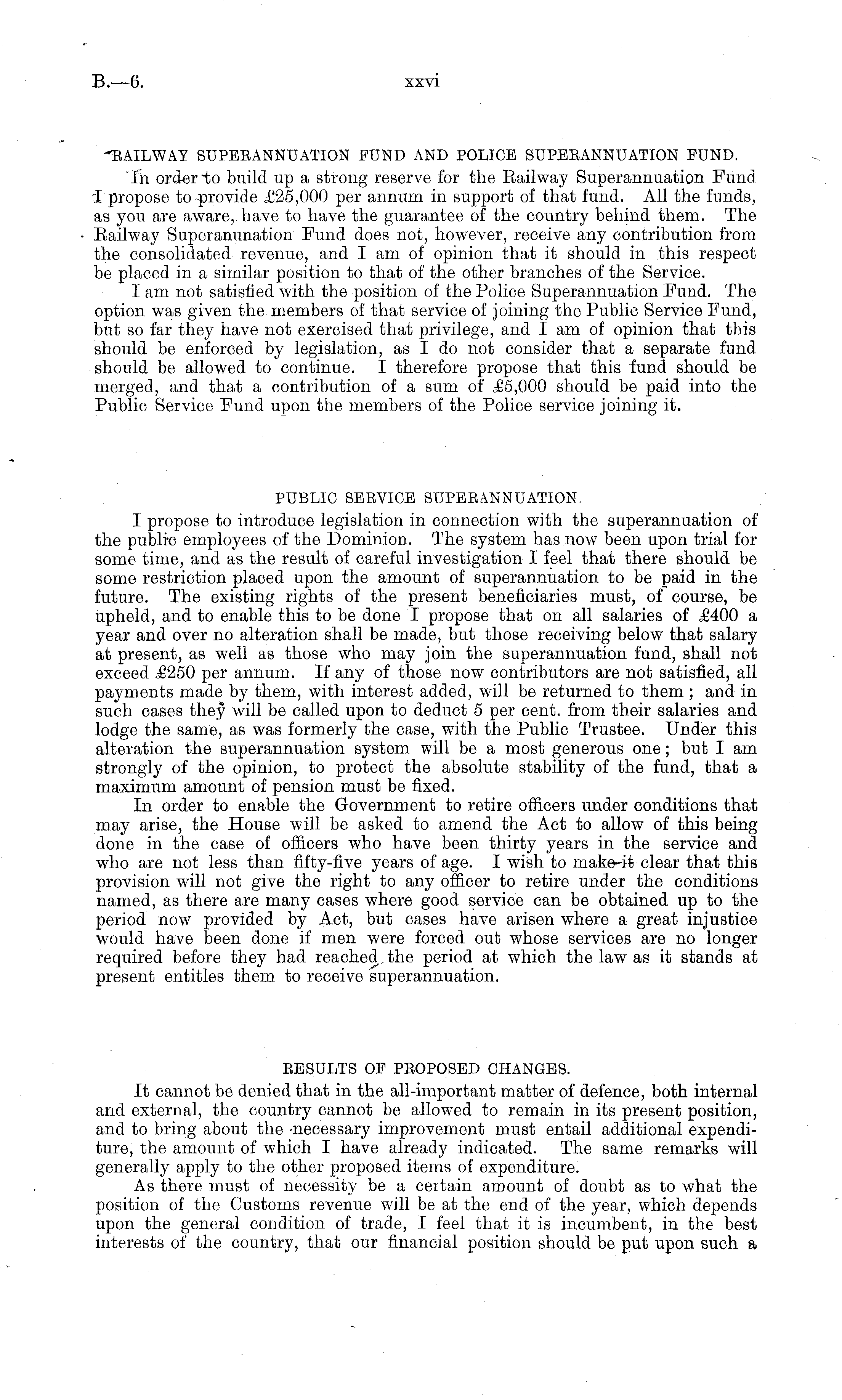-RAILWAY SUPERANNUATION FUND AND POLICE SUPERANNUATION FUND. In order to build up a strong reserve for the Railway Superannuation Fund I propose to provide £25,000 per annum in support of that fund. All the funds, as you are aware, have to have the guarantee of the country behind them. The Railway Superanunation Fund does not, however, receive any contribution from the consolidated revenue, and I am of opinion that it should in this respect be placed in a similar position to that of the other branches of the Service. lam not satisfied with the position of the Police Superannuation Fund. The option was given the members of that service of joining the Public Service Fund, but so far they have not exercised that privilege, and I am of opinion that this should be enforced by legislation, as I do not consider that a separate fund should be allowed to continue. I therefore propose that this fund should be merged, and that a contribution of a sum of £5,000 should be paid into the Public Service Fund upon the members of the Police service joining it. PUBLIC SERVICE SUPERANNUATION. I propose to introduce legislation in connection with the superannuation of the public employees of the Dominion. The system has now been upon trial for some time, and as the result of careful investigation I feel that there should be some restriction placed upon the amount of superannuation to be paid in the future. The existing rights of the present beneficiaries must, of course, be upheld, and to enable this to be done I propose that on all salaries of £400 a year and over no alteration shall be made, but those receiving below that salary at present, as well as those who may join the superannuation fund, shall not exceed £250 per annum. If any of those now contributors are not satisfied, all payments made by them, with interest added, will be returned to them ; and in such cases they will be called upon to deduct 5 per cent, from their salaries and lodge the same, as was formerly the case, with the Public Trustee. Under this alteration the superannuation system will be a most generous one; but lam strongly of the opinion, to protect the absolute stability of the fund, that a maximum amount of pension must be fixed. In order to enable the Government to retire officers under conditions that may arise, the House will be asked to amend the Act to allow of this being done in the case of officers who have been thirty years in the service and who are not less than fifty-five years of age. I wish to make it clear that this provision will not give the right to any officer to retire under the conditions named, as there are many cases where good service can be obtained up to the period now provided by Act, but cases have arisen where a great injustice would have been done if men were forced out whose services are no longer required before they had reached the period at which the law as it stands at present entitles them to receive superannuation. RESULTS OF PROPOSED CHANGES. It cannot be denied that in the all-important matter of defence, both internal and external, the country cannot be allowed to remain in its present position, and to bring about the necessary improvement must entail additional expenditure, the amount of which I have already indicated. The same remarks will generally apply to the other proposed items of expenditure. As there must of necessity be a certain amount of doubt as to what the position of the Customs revenue will be at the end of the year, which depends upon the general condition of trade, I feel that it is incumbent, in the best interests of the country, that our financial position should be put upon such a