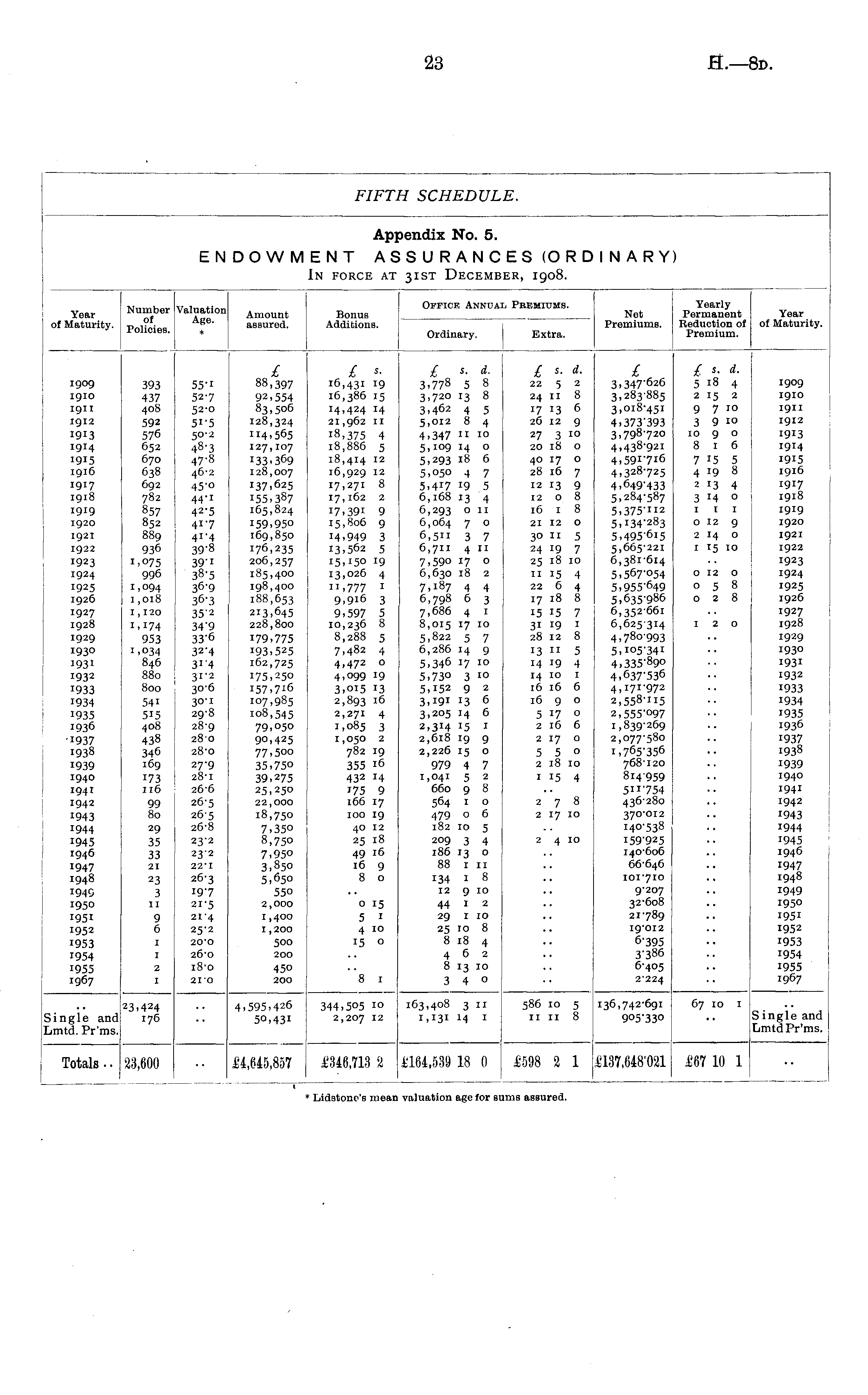 Office Annual Premiums. Yearly Permanent Reduction of Premium. Year of Maturity. Number of Policies. Valuation Age. Amount assured. Bonus Additions. Net Premiums. Year of Maturity. Ordinary. Extra. I909 19IO igil 1912 1913 1914 1915 1916 1917 1918 1919 I920 1921 1922 1923 1924 1925 1926 1927 1928 I929 1930 1931 1932 1933 1934 1935 1936 1937 1938 1939 1940 194I 1942 1943 1944 1945 1946 1947 1948 1949 1950 1951 1952 1953 1954 1955 1967 393 437 408 592 576 652 670 638 692 782 857 852 889 936 1,075 996 1,094 1,018 1,120 i,i74 953 1,034 846 880 800 54i 515 408 438 346 169 173 116 55-i 52-7 52-0 5i-5 50-2 48-3 47-8 46-2 45-0 44-1 42-5 41-7 41-4 39-8 39'i 38-5 36-9 36-3 35-2 34'9 33'6 32-4 314 31-2 30-6 30-1 29-8 28-9 280 28-0 27-9 28-1 26-6 26-5 265 26-8 23-2 23-2 22-1 26-3 I9'7 21-5 21-4 25-2 20-0 26-0 18-0 2IO £ 88,397 92,554 83,506 128,324 114,565 127,107 133,369 128,007 137,625 155,387 165,824 159,950 169,850 176,235 206,257 185,400 198,400 188,653 213,645 228,800 179,775 193,525 162,725 175,250 I57,7i6 107,985 108,545 79,O50 90,425 77,500 35,75o 39,275 25,250 22,000 18,750 7,350 8,750 7,950 3,850 5,650 550 2,000 £ s - 16,431 19 16,386 15 14,424 !4 21,962 II i8,375 4 18,886 5 18,414 12 16,929 12 17,271 8 17,162 2 17,391 9 15,806 9 M.949 3 13.562 5 15.150 19 13, 026 4 11,777 1 9.9i6 3 9,597 5 10,236 8 8,288 5 7,482 4 4.472 o 4,099 19 3.015 13 2,893 16 2,271 4 1,085 3 1,050 2 782 19 355 16 432 14 175 9 166 17 100 19 40 12 25 18 49 16 16 9 8 o £ s. d. 3,778 5 8 3,720 13 8 3,462 4 5 5,012 8 4 4,347 11 10 5,109 14 o 5,293 18 6 5,050 4 7 5,4 r 7 19 5 6,168 13 4 6,293 o 11 6,064 7 o 6,5" 3 7 6,711 4 11 7,59o 17 o 6,630 18 2 7,187 4 4 6,798 6 3 7,686 4 1 8,015 17 10 5,822 5 7 6,286 14 9 5,346 17 10 5,730 3 10 5,152 9 2 3,191 13 6 3,205 14 6 2,314 15 1 2,618 19 9 2,226 15 o 979 4 7 1,041 5 2 660 9 8 564 1 o 479 o 6 182 10 5 209 3 4 186 13 o 88 1 11 134 1 8 12 9 10 44 1 2 29 1 10 25 10 8 8 18 4 462 8 13 10 3 4 0 £ s. d. 22 5 2 24 11 8 17 13 6 26 12 9 27 3 10 20 18 o 40 17 o 28 16 7 12 13 9 1208 16 1 8 21 12 o 30 11 5 24 19 7 25 18 10 11 15 4 22 6 4 17 18 8 15 15 7 31 19 1 28 12 8 13 11 5 14 J 9 4 14 10 1 16 16 6 16 9 o 5 17 o 2 16 6 2 17 o 5 5 0 2 18 IO I 15 4 £ 3,347-626 3,283-885 3,018-451 4,373-393 3,798-720 4,438-921 4,591-716 4,328-725 4.649-433 5.284-587 5.375-H2 5.134-283 5,495-6i5 5,665-221 6,381-614 5,567-054 5,955-649 5,635-986 6,352-661 6,625314 4,78o-993 5,105-341 4,335-89o 4,637-536 4,171-972 2,558-115 2,555-o97 1,839-269 2,077-580 1,765-356 768-120 814959 5ii-754 436-280 370-012 140-538 159-925 140-606 66-646 101-710 9-207 32-608 21-789 19-012 6-395 3-386 6-405 2-224 £ s. d. 5 18 4 2 15 2 9 7 10 3 9 10 10 9 o 8 1 6 7 15 5 4 19 8 2 13 4 3 14 o 111 0 12 9 2 14 o 1 15 IO O 12 O 0 5 8 0 2 8 I20 1909 I9IO I9II 1912 1913 1914 1915 1916 1917 1918 1919 1920 1921 1922 1923 1924 1925 I926 1927 1928 1929 1930 1931 1932 1933 1934 1935 1936 1937 1938 1939 1940 1941 1942 1943 1944 1945 1946 1947 I948 1949 1950 1951 1952 1953 1954 1955 I967 99 80 29 35 33 21 278 2 17 IO 2 4 IO 23 3 11 9 6 I 1 1,400 1,200 500 200 450 200 o 15 5 1 4 10 15 o 2 "'8 1 I Single and Lmtd. Pr'ms. 23,424 I76 4,595,426 50,43! 344.505 10 2,207 12 163,408 3 11 1,131 14 1 586 10 5 11 11 8 136,742-691 905'330 67 IO I Single and Lmtd Pr'ms. Totals • • 23,600 £4,645,857 £346,713 2 £164.539 18 0 £598 2 1 £137,648'021 £67 10 1 T * Lidstone's rneai valuation age for sums assured.