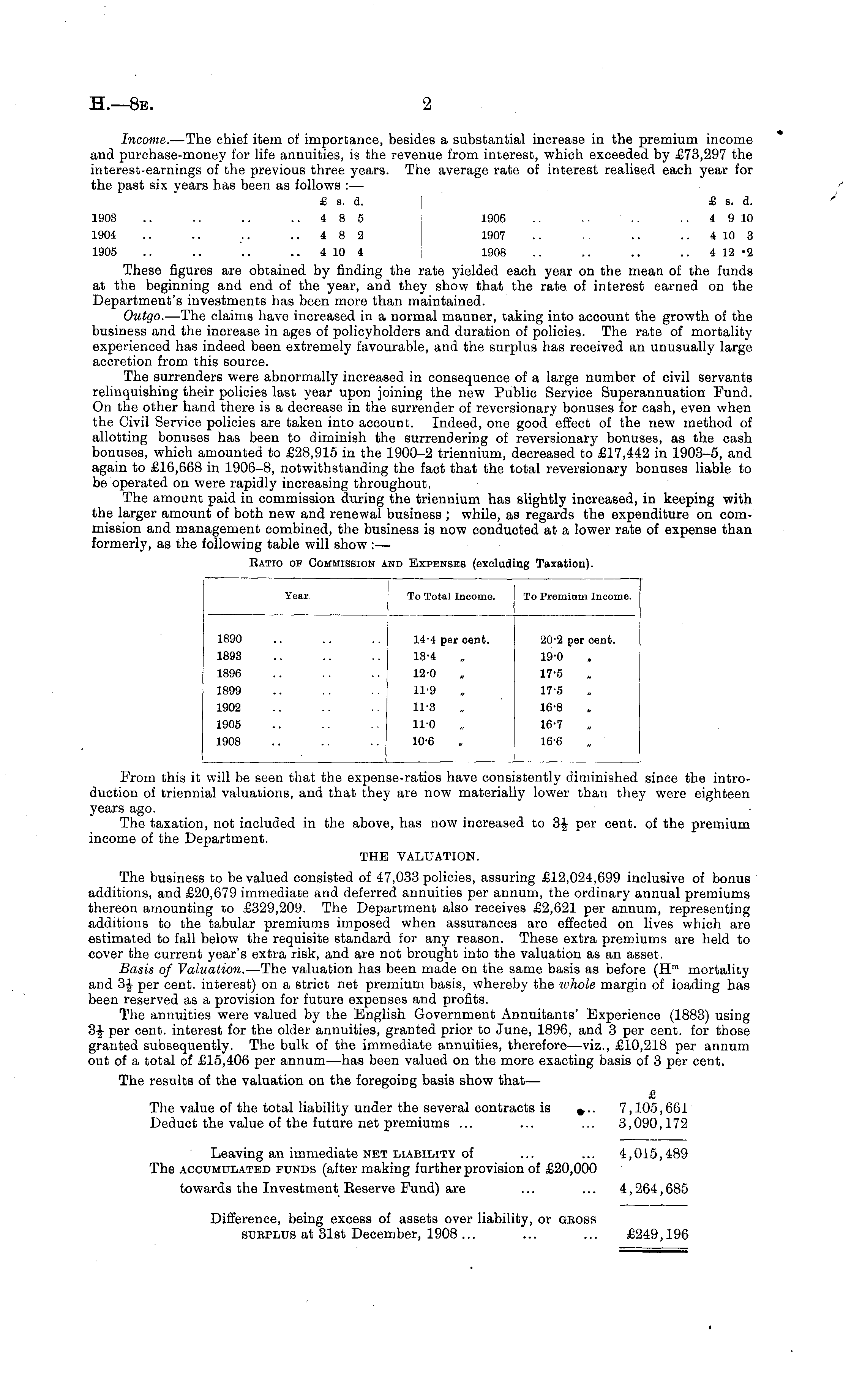 Income. —The chief item of importance, besides a substantial increase in the premium income and purchase-money for life annuities, is the revenue from interest, which exceeded by £73,297 the interest-earnings of the previous three years. The average rate of interest realised each year for the past six years has been as follows :— £ a. A. £ a. d. 1903 .. .. .. ..485 1906 .. .. .. 4 9 10 1904 .. .. .. ..482 1907 .. .. .. .. 4 10 3 1905 .. .. .. 4 10 4 1908 .. .. .. .. 4 12 -2 These figures are obtained by finding the rate yielded each year on the mean of the funds at the beginning and end of the year, and they show that the rate of interest earned on the Department's investments has been more than maintained. Outgo. —The claims have increased in a normal manner, taking into account the growth of the business and the increase in ages of policyholders and duration of policies. The rate of mortalityexperienced has indeed been extremely favourable, and the surplus has received an unusually large accretion from this source. The surrenders were abnormally increased in consequence of a large number of civil servants relinquishing their policies last year upon joining the new Public Service Superannuation Fund. On the other hand there is a decrease in the surrender of reversionary bonuses for cash, even when the Civil Service policies are taken into account. Indeed, one good effect of the new method of allotting bonuses has been to diminish the surrendering of reversionary bonuses, as the cash bonuses, which amounted to £28,915 in the 1900-2 triennium, decreased to £17,442 in 1903-5, and again to £16,668 in 1906-8, notwithstanding the fact that the total reversionary bonuses liable to be operated on were rapidly increasing throughout. The amount paid in commission during the triennium has slightly increased, in keeping with the larger amount of both new and renewal business ; while, as regards the expenditure on commission and management combined, the business is now conducted at a lower rate of expense than formerly, as the following table will show :—
