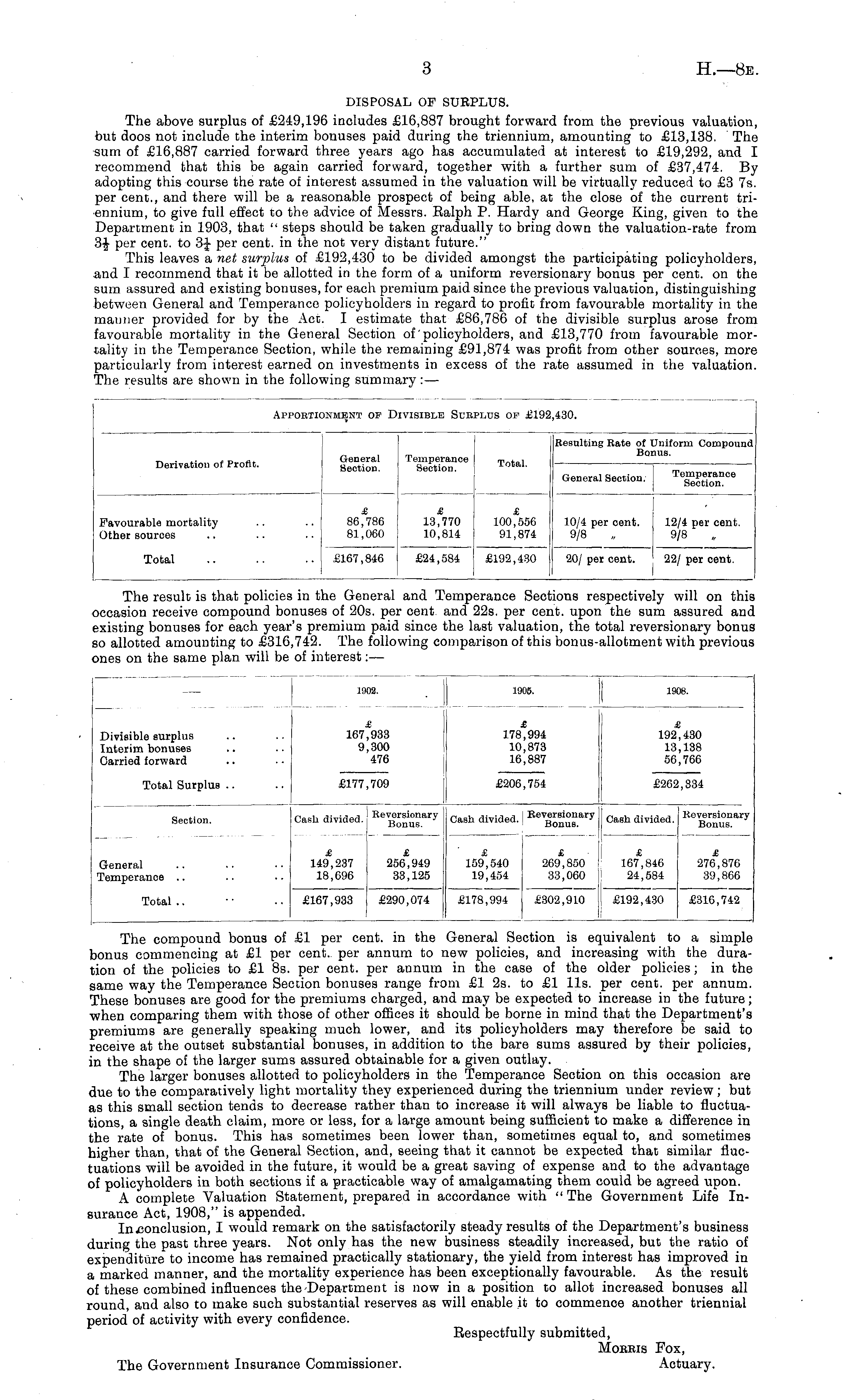 The compound bonus of £1 per cent, in the General Section is equivalent to a simple bonus commencing at £1 per cent, per annum to new policies, and increasing with the duration of the policies to £1 Bs. per cent, per annum in the case of the older policies; in the same way the Temperance Section bonuses range from £1 2s. to £1 11s. per cent, per annum. These bonuses are good for the premiums charged, and may be expected to increase in the future; when comparing them with those of other offices it should be borne in mind that the Department's premiums are generally speaking much lower, and its policyholders may therefore be said to receive at the outset substantial bonuses, in addition to the bare sums assured by their policies, in the shape of the larger sums assured obtainable for a given outlay. The larger bonuses allotted to policyholders in the Temperance Section on this occasion are due to the comparatively light mortality they experienced during the triennium under review; but as this small section tends to decrease rather than to increase it will always be liable to fluctuations, a single death claim, more or less, for a large amount being sufficient to make a difference in the rate of bonus. This has sometimes been lower than, sometimes equal to, and sometimes higher than, that of the General Section, and, seeing that it cannot be expected that similar fluctuations will be avoided in the future, it would be a great saving of expense and to the advantage of policyholders in both sections if a practicable way of amalgamating them could be agreed upon. A complete Valuation Statement, prepared in accordance with " The Government Life Insurance Act, 1908," is appended. Injconclusion, I would remark on the satisfactorily steady results of the Department's business during the past three years. Not only has the new business steadily increased, but the ratio of expenditure to income has remained practically stationary, the yield from interest has improved in a marked manner, and the mortality experience has been exceptionally favourable. As the result of these combined influences the Department is now in a position to allot increased bonuses all round, and also to make such substantial reserves as will enable it to commence another triennial period of activity with every confidence. Respectfully submitted, Moeris Fox, The Government Insurance Commissioner. Actuary.