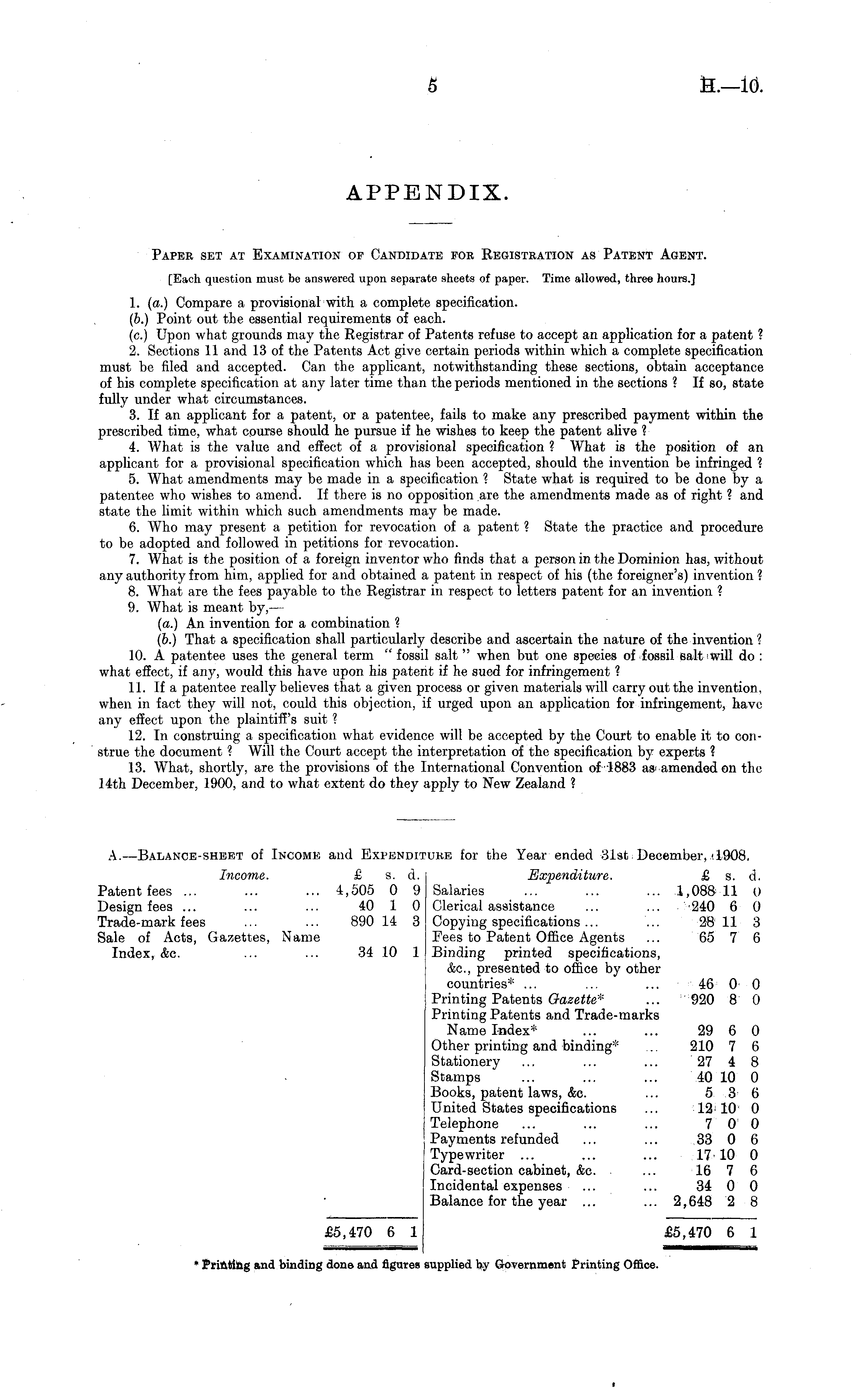 Paper set at Examination of Candidate for Registration as Patent Agent. [Each question must be answered upon separate sheets of paper. Time allowed, three hours.] 1. (a.) Compare a provisional with a complete specification. (6.) Point out the essential requirements of each. (c.) Upon what grounds may the Registrar of Patents refuse to accept an application for a patent ? 2. Sections 11 and 13 of the Patents Act give certain periods within which a complete specification must be filed and accepted. Can the applicant, notwithstanding these sections, obtain acceptance of his complete specification at any later time than the periods mentioned in the sections ? If so, state fully under what circumstances. 3. If an applicant for a patent, or a patentee, fails to make any prescribed payment within the prescribed time, what course should he pursue if he wishes to keep the patent alive ? 4. What is the value and effect of a provisional specification ? What is the position of an applicant for a provisional specification which has been accepted, should the invention be infringed ? 5. What amendments may be made in a specification ? State what is required to be done by a patentee who wishes to amend. If there is no opposition are the amendments made as of right ? and state the limit within which such amendments may be made. 6. Who may present a petition for revocation of a patent ? State the practice and procedure to be adopted and followed in petitions for revocation. 7. What is the position of a foreign inventor who finds that a person in the Dominion has, without any authority from him, applied for and obtained a patent in respect of his (the foreigner's) invention ? 8. What are the fees payable to the Registrar in respect to letters patent for an invention ? 9. What is meant by, — (a.) An invention for a combination ? (6.) That a specification shall particularly describe and ascertain the nature of the invention ? 10. A patentee uses the general term " fossil salt " when but one species of fossil salt will do : what effect, if any, would this have upon his patent if he sued for infringement ? 11. If a patentee really believes that a given process or given materials will carry out the invention, when in fact they will not, could this objection, if urged upon an application for infringement, have any effect upon the plaintiff's suit ? 12. In construing a specification what evidence will be accepted by the Court to enable it to construe the document ? Will the Court accept the interpretation of the specification by experts ? 13. What, shortly, are the provisions of the International Convention of 1883 as amended on the 14th December, 1900, and to what extent do they apply to New Zealand ? A.—Balance-sheet of Income and Expenditure for the Year ended 31st December, 1908. Income. £ s. d. Expenditure. £ s. d. Patent fees ... ... ... 4,505 0 9 Salaries ... ... ... 1,088 11 O Design fees ... ... ... 40 1 0 Clerical assistance ... ... '240 6 0 Trade-mark fees ... ... 890 14 3 Copying specifications ... ... 28 11 3 Sale of Acts, Gazettes, Name Pees to Patent Office Agents ... 65 7 6 Index, &c. ... ... 34 10 1 Binding printed specifications, &c, presented to office by other countries* ... ... ... 46 0 0 Printing Patents Gazette* ... 920 8 0 Printing Patents and Trade-marks Name Index* ... ... 29 6 0 Other printing and binding* ... 210 7 6 Stationery ... ... ... 27 4 8 Stamps " ... ... ... 40 10 0 Books, patent laws, &c. ... 5 3 6 United States specifications ... 12 10 0 Telephone ... ... ... 7 0 0 Payments refunded ... ... 33 0 6 Typewriter ... ... ... 17 10 0 Card-section cabinet, &c 16 7 6 Incidental expenses ... ... 34 0 0 Balance for the year ... ... 2,648 2 8 £5,470 6 1 £5,470 6 1 • Printing and binding done and figures supplied by Government Printing Office.