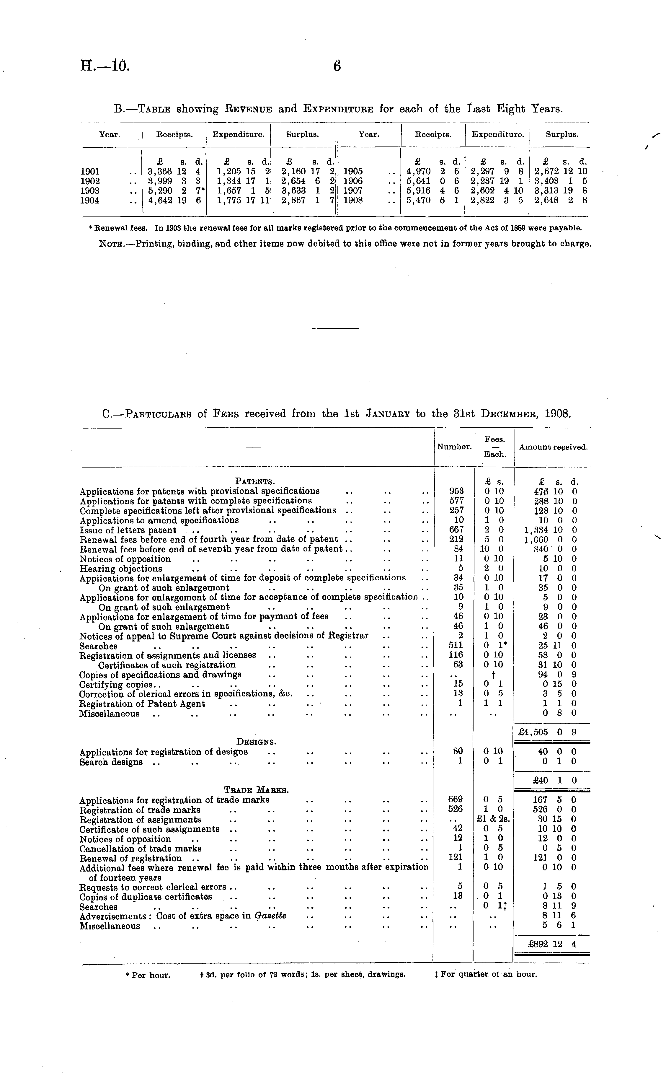 Year. Receipts. Expenditure. Surplus. Year. Receipts. Expenditure. I Surplus. 1901 1902 1903 1904 £ s. d. 3,366 12 4 3,999 3 3 5,290 2 7* 4,642 19 6 £ s. d. £ s. d. 1,205 15 2 2,160 17 2 1,344 17 1 2,654 6 2 1,657 1 5 3,633 1 2 1,775 17 11 2,867 1 7 1905 1906 1907 1908 £ s. d. 4,970 2 6 5,641 0 6 5,916 4 6 5,470 6 1 £ s. d. £ s. d. 2,297 9 8 2,672 12 10 2,237 19 1 3,403 1 5 2,602 4 10 3,313 19 8 2,822 3 5 2,648 2 8 * Renewal feei i. In 1903 the r< :newal fees for all marks register! id prior to the a >mmencement oi f the Act of 1889 were payable. Note.—Pi rinting, bindin; g, and other items now debitei 1 to this office were not in for •mer years brought to charge