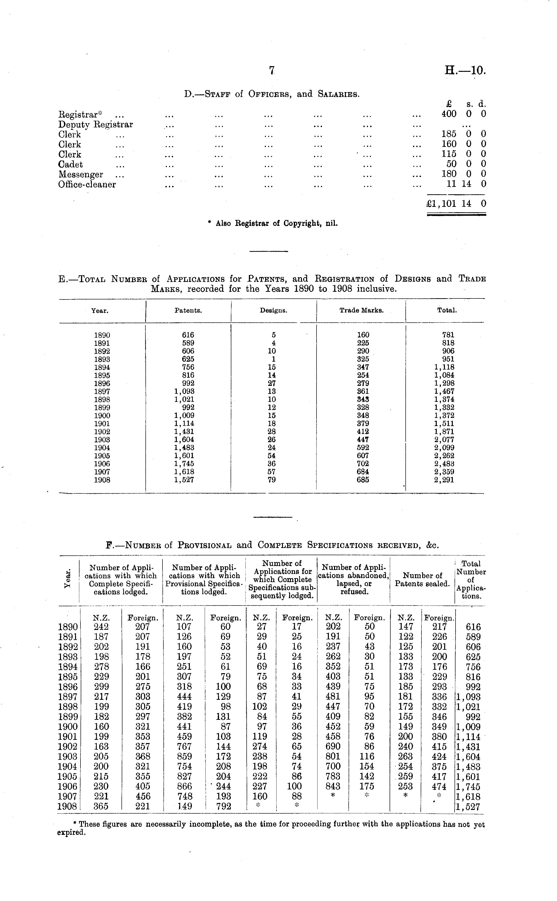 D. —Staff of Officers, and Salaries. £ s. d. Begietrar* ... ... ... ... ... ... ... 400 0 0 Deputy Begistrar Clerk ... ... ... ... ... ... ... 185 0 0 Clerk ... ... ... ... ... ... ... 160 0 0 Clerk ... ... ... ... ... ■ ... ... 115 0 0 Cadet ... ... ... ... ... ... ... 50 0 0 Messenger ... ... ... ... ... ... ... 180 0 0 Office-cleaner ... ... ... ... ... ... 11 14 0 £1,101 14 0 * Also Begistrar of Copyright, nil.