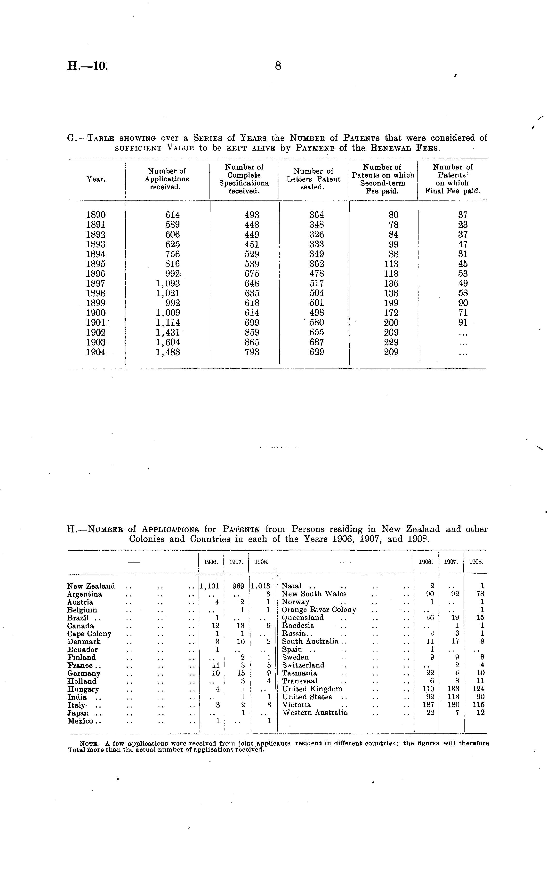 H.—Number of Applications for Patents from Persons residing in New Zealand and other Colonies and Countries in each of the Years 1906, 1907, and 1908.