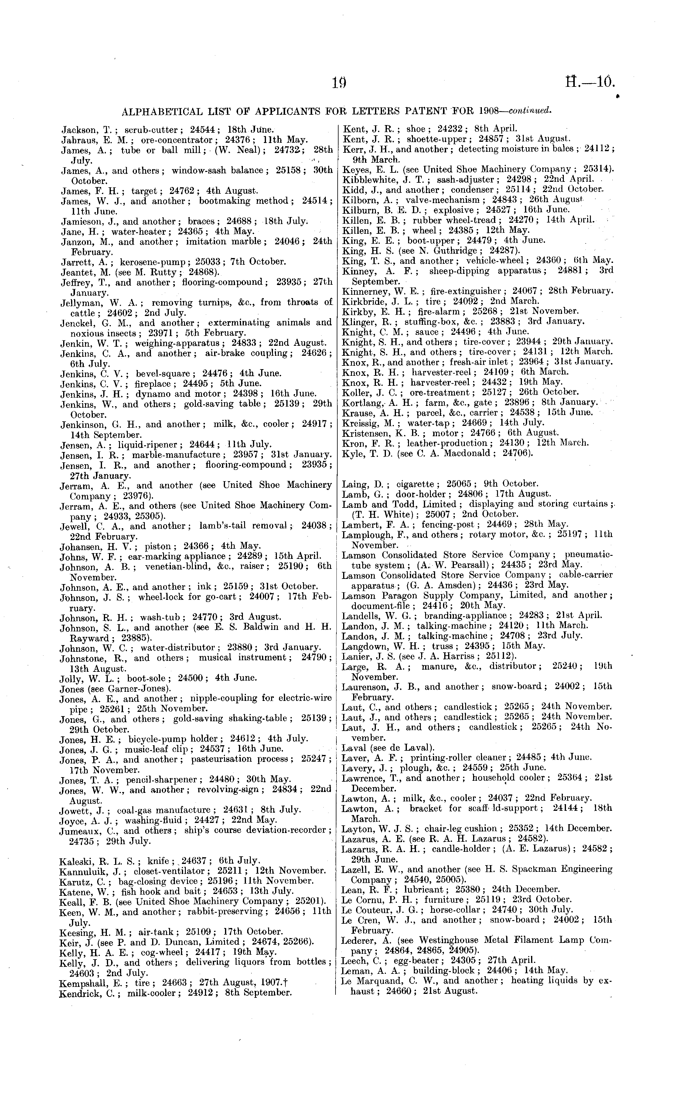 ALPHABETICAL LIST OP APPLICANTS FOR LETTERS PATENT FOR 1908— continued.