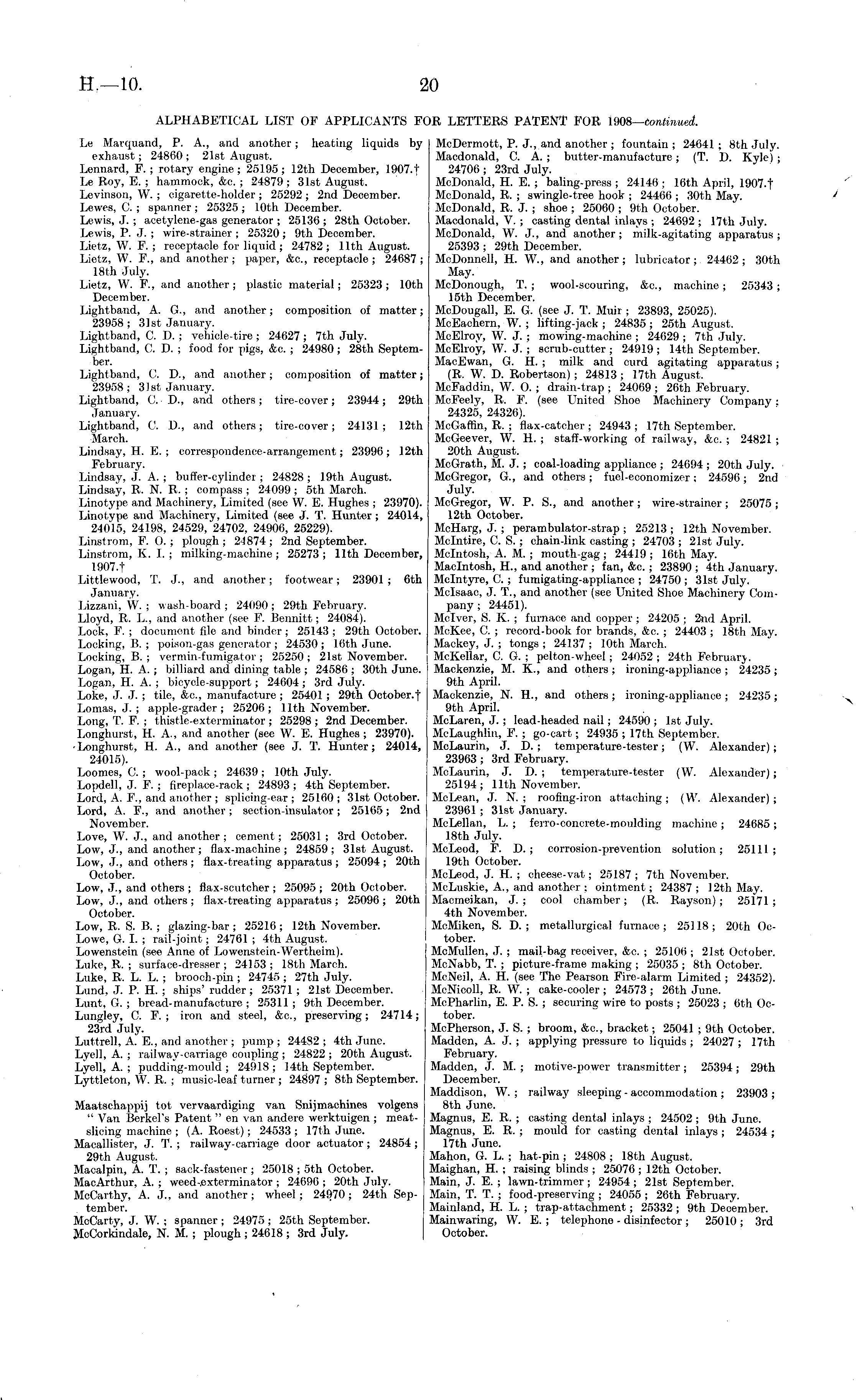McDermott, P. J. , and another ; fountain; 24641; Bth July. Macdonald, C. A. ; butter-manufacture; (T. D. Kvle) ; 24706 ; 23rd July. McDonald, H. E. ; baling-press ; 24146 ; 16th April, 1907-t McDonald, R. ; swingle-tree hook ; 24466 ; 30th May. McDonald, R. J. ; shoe ; 25060 ; 9th October. Macdonald, V. ; casting dental inlays ; 24692 ; 17th July. McDonald, W. J., and another; milk-agitating apparatus; 25393 ; 29th December. McDonnell, H. W., and another; lubricator; 24462; 30th May. McDonough, T. ; wool-scouring, &c, machine ; 25343; 15th December. McDougall, E. G. (see J. T. Muir ; 23893, 25025). McEachern, W. ; lifting-jack ; 24835 ; 25th August. McElroy, W. J. ; mowing-machine ; 24629 ; 7th July. McElroy, W. J. ; scrub-cutter ; 24919 ; 14th September. MacEwan, G. H. ; milk and curd agitating apparatus; (R. W. D. Robertson); 24813; 17th August, McFaddin, W. O. ; drain-trap ; 24069 ; 26th February. McFeely, R. F. (see United Shoe Machinery Company; 24325, 24326). McGaffin, R. ; flax-catcher ; 24943 ; 17th September. McGeever, W. H. ; staff-working of railway, &c. ; 24821 ; 20th August. McGrath, M. J. ; coal-loading appliance ; 24694 ; 20th July. McGregor, G., and others; fuel-economizer; 24596; 2nd July. McGregor, W. P. S., and another ; wire-strainer ; 25075 ; 12th October. McHarg, J. ; perambulator-strap ; 25213 ; 12th November. Mclntire, C. S. ; chain-link casting ; 24703 ; 21st July. Mclntosh, A. M. ; mouth-gag ; 24419 ; 16th May. Macintosh, H., and another ; fan, &c. ; 23890 ; 4th January. Mclntyre, C. ; fumigating-appliance ; 24750 ; 31st July. Mclsaac, J. T., and another (see United Shoe Machinery Company ; 24451). Mclver, S. K. ; furnace and copper ; 24205 ; 2nd April. MoKee, C. ; record-book for brands, &c. ; 24403 ; 18th May. Mackey, J. ; tongs ; 24137 ; 10th March. McKellar, C. G. ; pelton-wheel; 24052; 24th February. Mackenzie, M. X., and others ; ironing-appliance ; 24235; 9th April. Mackenzie, N. H., and others; ironing-appliance; 24235; 9th April. McLaren, J. ; lead-headed nail; 24590 ; Ist July. McLaughlin, F. ; go-cart; 24935 ; 17th September. McLaurin, J. D. ; temperature-tester; (W. Alexander); 23963 ; 3rd February. McLaurin, J. D. ; temperature-tester (W. Alexander); 25194; 11th November. McLean, J. N. ; roofing-iron attaching; (W. Alexander); 23961 ; 31st January. McLellan, L. ; ferro-concrete-moiilding machine ; 24685 ; 18th July. McLeod, F. D. ; corrosion-prevention solution; 25111; 19th October. McLeod, J. H. ; cheese-vat; 25187 ; 7th November. McLuskie, A., and another ; ointment ; 24387 ; 12th May. Macmeikan, J.; cool chamber; (R. Rayson) ; 25171; 4th November. McMiken, S. D. ; metallurgical furnace; 25118; 20th October. McMullen, J. ; mail-bag receiver, &c. ; 2510(5; 21st October. McNabb, T. ; picture-frame making ; 25035 ; Bth October. McNeil, A. H. (see The Pearson Fire-alarm Limited ; 24352). McNicoll, R. W. ; cake-cooler ; 24573 ; 26th June. McPharlin, E. P. S. ; securing wire to posts ; 25023 ; 6th October. McPherson, J. S. ; broom, &c, bracket; 25041 ; 9th October. Madden, A. J. ; applying pressure to liquids ; 24027 ; 17th February. Madden, J. M. ; motive-power transmitter ; 25394 ; 29th December. Maddison, VV. ; railway sleeping - accommodation ; 23903 ; Bth June. Magnus, E. R. ; casting dental inlays ; 24502 ; 9th June. Magnus, E. R. ; mould for casting dental inlays ; 24534 ; 17th June. Mahon, G. L. ; hat-pin ; 24808 ; 18th August. Maighan, H. ; raising blinds ; 25076 ; 12th October. Main, J. E. ; lawn-trimmer ; 24954 ; 21st September. Main, T. T. ; food-preserving ; 24055 ; 26th February. Mainland, H. L. ; trap-attachment; 25332 ; 9th December. Main waring, W. E. ; telephone - disinfector ; 25010 ; 3rd October.