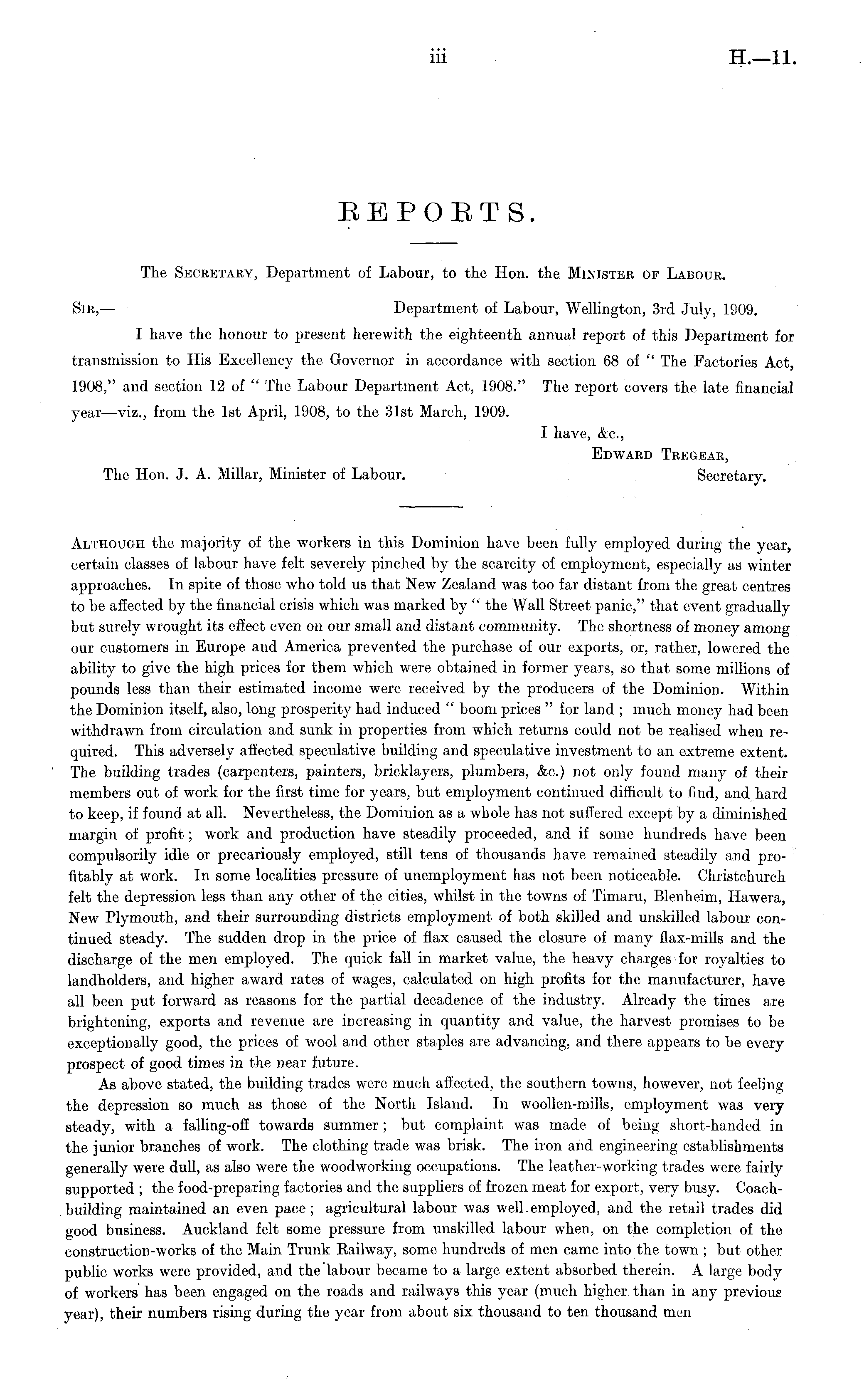 The Secretary, Department of Labour, to the Hon. the Minister of Labour. Sir, — Department of Labour, Wellington, 3rd July, 1909. I have the honour to present herewith the eighteenth annual report of this Department for transmission to His Excellency the Governor in accordance with section 68 of " The Factories Act, 1908," and section 12 of " The Labour Department Act, 1908." The report covers the late financial year—viz., from the Ist April, 1908, to the 31st March, 1909. I have, &c, Edward Tregear, The Hon. J. A. Millar, Minister of Labour. Secretary.