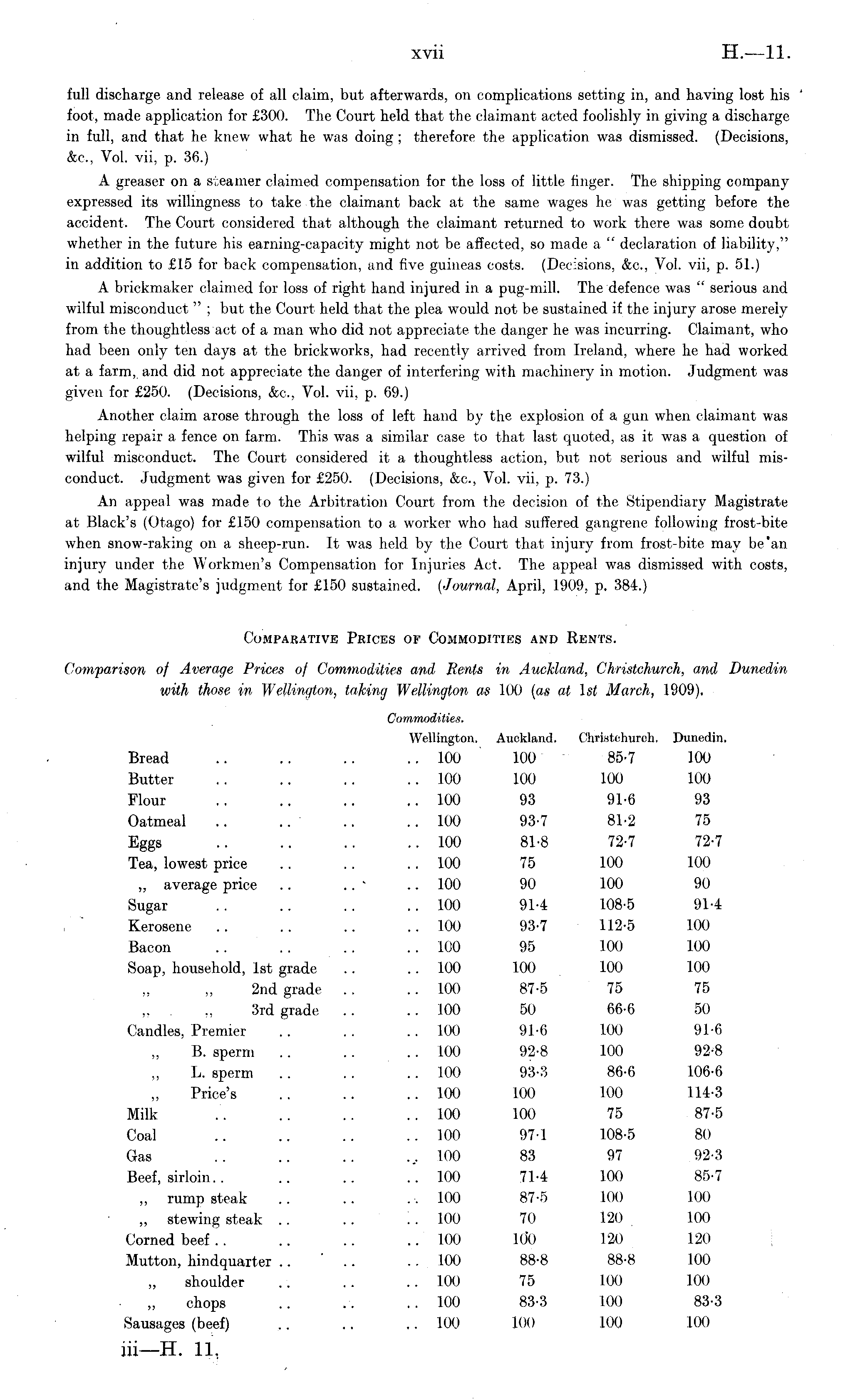 full discharge and release of all claim, but afterwards, on complications setting in, and having lost his foot, made application for £300. The Court held that the claimant acted foolishly in giving a discharge in full, and that he knew what he was doing ; therefore the application was dismissed. (Decisions, &c, Vol. vii, p. 36.) A greaser on a steamer claimed compensation for the loss of little finger. The shipping company expressed its willingness to take the claimant back at the same wages he was getting before the accident. The Court considered that although the claimant returned to work there was some doubt whether in the future his earning-capacity might not be affected, so made a " declaration of liability." in addition to £15 for back compensation, and five guineas costs. (Decisions, &c, Vol. vii, p. 51.) A brickmaker claimed for loss of right hand injured in a pug-mill. The defence was " serious and wilful misconduct " ; but the Court held that the plea would not be sustained if the injury arose merely from the thoughtless act of a man who did not appreciate the danger he was incurring. Claimant, who had been only ten days at the brickworks, had recently arrived from Ireland, where he had worked at a farm, and did not appreciate the danger of interfering with machinery in motion. Judgment was given for £250. (Decisions, &c, Vol. vii, p. 69.) Another claim arose through the loss of left hand by the explosion of a gun when claimant was helping repair a fence on farm. This was a similar case to that last quoted, as it was a question of wilful misconduct. The Court considered it a thoughtless action, but not serious and wilful misconduct. Judgment was given for £250. (Decisions. &c, Vol. vii. p. 73.) An appeal was made to the Arbitration Court from the decision of the Stipendiary Magistrate at Black's (Otago) for £150 compensation to a worker who had suffered gangrene following frost-bite when snow-raking on a sheep-run. It was held by the Court that injury from frost-bite may bean injury under the Workmen's Compensation for Injuries Act. The appeal was dismissed with costs, and the Magistrate's judgment for £150 sustained. (Journal, April, 1909, p. 384.) Comparative Pricks of Commodities and Rents. Comparison of Average /'rices of Commodities and Rents in Auckland. Christchurch, and Dunedin with those in Wellington, taking Wellington as 100 (as at Ist March, 1909), Commodities. Wellington. Auckland. Christohuroh. Dunedin. Bread .. .. .. ..100 100 857 100 Butter .. .. .. ..100 100 100 100 Flour .. .. .. .. 100 93 91-6 93 Oatmeal .. .. .. .. 100 93-7 81-2 75 Eggs .. .. .. .. 100 81-8 72-7 72-7 Tea, lowest price .. .. .. 100 75 100 100 „ average price .. .. ' .. 100 90 100 90 Sugar .. .. .. .. 100 914 108-5 914 Kerosene .. .. .. ..100 93-7 112-5 100 Bacon .. .. .. ..100 95 100 100 Soap, household, Ist grade . ... 100 100 100 100 2nd grade .. .. 100 87-5 75 75 3rd grade . . .. 100 50 66-6 50 Candles, Premier .. .. .. 100 91-6 LOO 91-6 B. sperm . . .. . . 100 <>2-8 100 92-8 L. sperm .. .. .. 100 93-3 86-6 106-6 Price's .. 100 100 100 114-3 Milk .. .. .. ..100 100 75 87-5 Coal .. .. .. .. 100 97-1 108-5 80 Gas .. .. .. ... 100 83 97 92-3 Beef, sirloin.. .. .. .. 100 714 LOO 85-7 „ rump steak .. .. ~ 100 87-5 100 UK) „ stewing steak .. .. ..100 70 L2O 100 Corned beef.. .. .. .. LOO L(5O 120 120 Mutton, hindquarter .. ' . . . . KM) 88-8 88-8 100 shoulder .. .. .. 100 75 KM) 100 • „ chops .. .. .. 100 83-3 100 83-3 Sausages (beef) .. .. .. 100 100 100 100