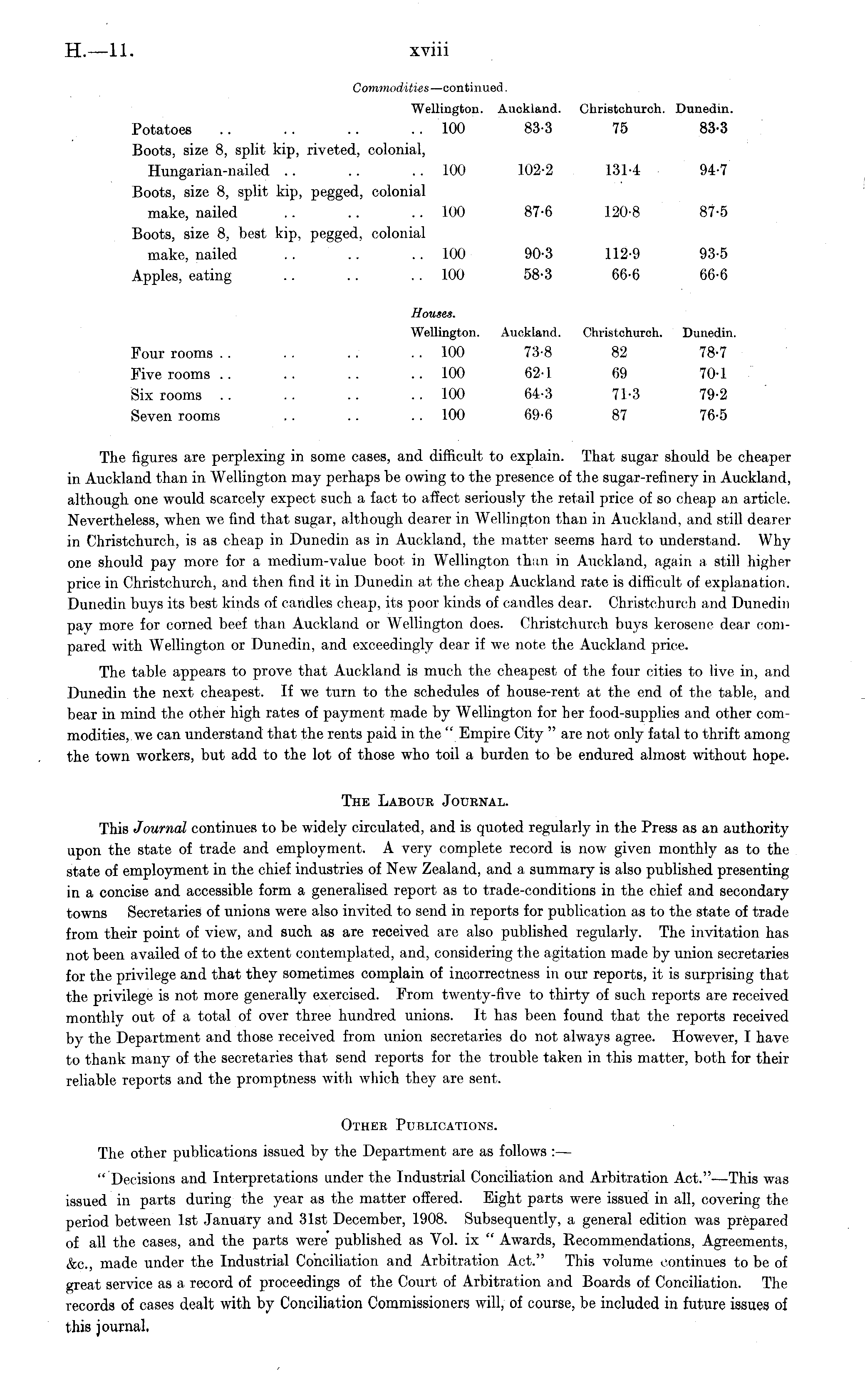 Commodities —continued. Wellington. Auckland. Christchurch. Dunedin. Potatoes .. .. .. ..100 83-3 75 83-3 Boots, size 8, split kip, riveted, colonial, Hungarian-nailed .. .. . . 100 102-2 1314 94-7 Boots, size 8, split kip, pegged, colonial make, nailed .. .. .. 100 87-6 120-8 87-5 Boots, size 8, best kip, pegged, colonial make, nailed . . .. .. 100 90-3 112-9 93-5 Apples, eating .. .. . . 100 58-3 66-6 66-6 Houses. Wellington. Auckland. Christchurch. Dunedin. Four rooms . . .. .. .. 100 73-8 82 78-7 Five rooms.. .. .. ..100 62-1 69 70-1 Six rooms .. .. .. ..100 64-3 71-3 79-2 Seven rooms . . .. . . 100 69-6 87 76-5 The figures are perplexing in some cases, and difficult to explain. That sugar should be cheaper in Auckland than in Wellington may perhaps be owing to the presence of the sugar-refinery in Auckland, although one would scarcely expect such a fact to affect seriously the retail price of so cheap an article. Nevertheless, when we find that sugar, although dearer in Wellington than in Auckland, and still dearer in Christchurch, is as cheap in Dunedin as in Auckland, the matter seems hard to understand. Why one should pay more for a medium-value boot in Wellington thtin in Auckland, again a still higher price in Christchurch, and then find it in Dunedin at the cheap Auckland rate is difficult of explanation. Dunedin buys its best kinds of candles cheap, its poor kinds of candles dear. Christchurch and Dunedin pay more for corned beef than Auckland or Wellington does. Christenuteh buys kerosene dear compared with Wellington or Dunedin, and exceedingly dear if we note the Auckland price. The table appears to prove that Auckland is much the cheapest of the four cities to live in, and Dunedin the next cheapest. If we turn to the schedules of house-rent at the end of the table, and bear in mind the other high rates of payment made by Wellington for her food-supplies and other commodities, we can understand that the rents paid in the " Empire City " are not only fatal to thrift among the town workers, but add to the lot of those who toil a burden to be endured almost without hope. The Labour Journal. This Journal continues to be widely circulated, and is quoted regularly in the Press as an authority upon the state of trade and employment. A very complete record is now given monthly as to the state of employment in the chief industries of New Zealand, and a summary is also published presenting in a concise and accessible form a generalised report as to trade-conditions in the chief and secondary towns Secretaries of unions were also invited to send in reports for publication as to the state of trade from their point of view, and such as are received are also published regularly. The invitation has not been availed of to the extent contemplated, and, considering the agitation made by union secretaries for the privilege and that they sometimes complain of incorrectness in our reports, it is surprising that the privilege is not more generally exercised. From twenty-five to thirty of such reports are received monthly out of a total of over three hundred unions. It has been found that the reports received by the Department and those received from union secretaries do not always agree. However, I have to thank many of the secretaries that send reports for the trouble taken in this matter, both for their reliable reports and the promptness with which they are sent. Other Publications. The other publications issued by the Department are as follows : — "Decisions and Interpretations under the Industrial Conciliation and Arbitration Act."—This was issued in parts during the year as the matter offered. Eight parts were issued in all, covering the period between Ist January and 31st December, 1908. Subsequently, a general edition was prepared of all the cases, and the parts were published as Vol. ix " Awards, Recommendations, Agreements, &c, made under the Industrial Conciliation and Arbitration Act." This volume continues to be of great service as a record of proceedings of the Court of Arbitration and Boards of Conciliation. The records of cases dealt with by Conciliation Commissioners will, of course, be included in future issues of this journal.