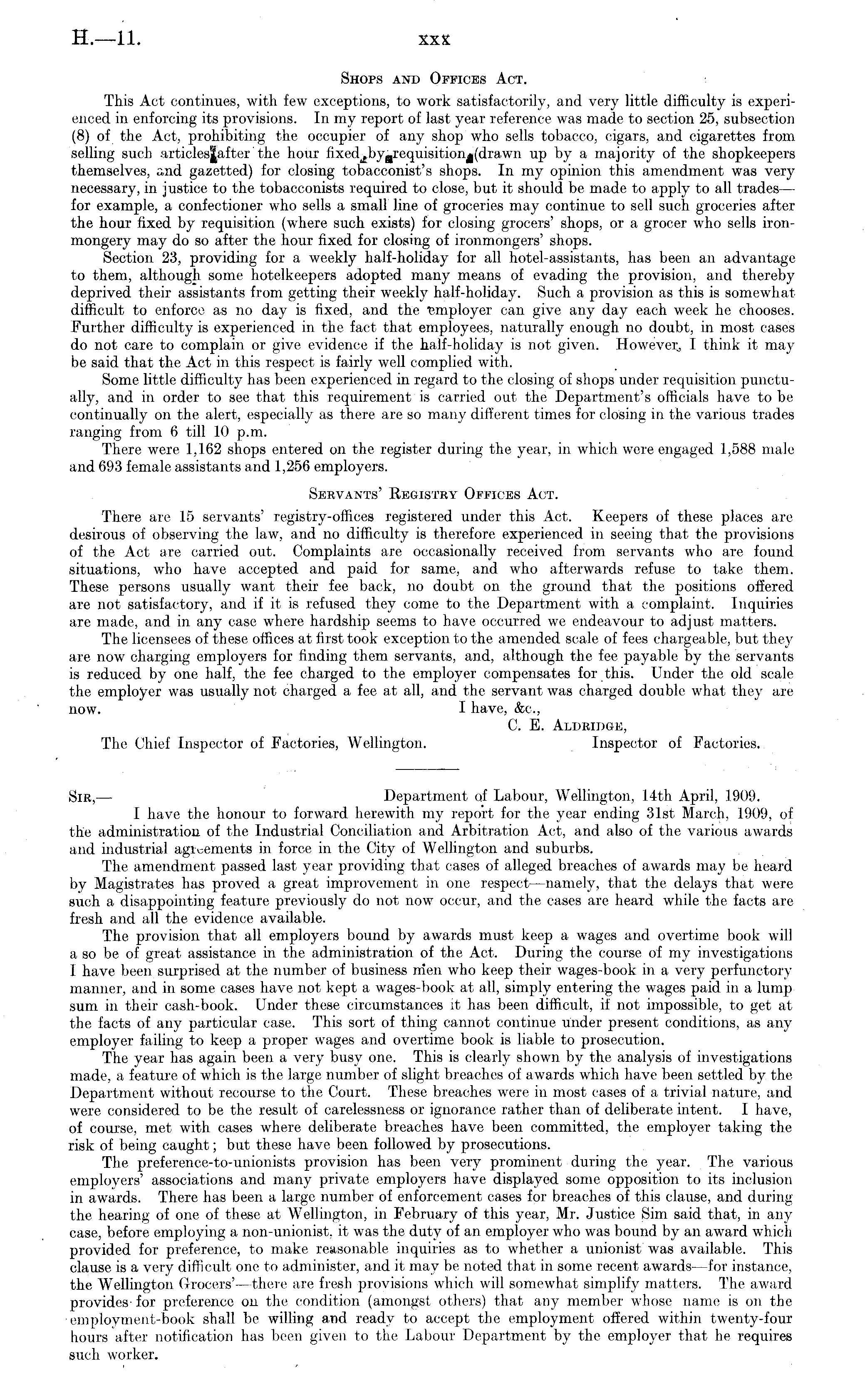 Shops and Offices Act. This Act continues, with few exceptions, to work satisfactorily, and very little difficulty is experienced in enforcing its provisions. In my report of last year reference was made to section 25, subsection (8) of the Act, prohibiting the occupier of any shop who sells tobacco, cigars, and cigarettes from selling such articles|after the hour fixed jf by a requisitioiij(drawn up by a majority of the shopkeepers themselves, a,nd gazetted) for closing tobacconist's shops. In my opinion this amendment was very necessary, in justice to the tobacconists required to close, but it should be made to apply to all trades— for example, a confectioner who sells a small line of groceries may continue to sell such groceries after the hour fixed by requisition (where such exists) for closing grocers' shops, or a grocer who sells ironmongery may do so after the hour fixed for closing of ironmongers' shops. Section 23, providing for a weekly half-holiday for all hotel-assistants, has been an advantage to them, although some hotelkeepers adopted many means of evading the provision, and thereby deprived their assistants from getting their weekly half-holiday. Such a provision as this is somewhat difficult to enforce as no day is fixed, and the 'employer can give any day each week he chooses. Further difficulty is experienced in the fact that employees, naturally enough no doubt, in most cases do not care to complain or give evidence if the half-holiday is not given. However, I think it may be said that the Act in this respect is fairly well complied with. Some little difficulty has been experienced in regard to the closing of shops under requisition punctually, and in order to see that this requirement is carried out the Department's officials have to be continually on the alert, especially as there are so many different times for closing in the various trades ranging from 6 till 10 p.m. There were 1,162 shops entered on the register during the year, in which wore engaged 1,588 male and 693 female assistants and 1,256 employers. Servants' Registry Offices Act. There are 15 servants' registry-offices registered under this Act. Keepers of these places arc desirous of observing the law, and no difficulty is therefore experienced in seeing that the provisions of the Act are carried out. Complaints are occasionally received from servants who are found situations, who have accepted and paid for same, and who afterwards refuse to take them. These persons usually want their fee back, no doubt on the ground that the positions offered are not satisfactory, and if it is refused they come to the Department with a complaint. Inquiries are made, and in any case where hardship seems to have occurred we endeavour to adjust matters. The licensees of these offices at first took exception to the amended scale of fees chargeable, but they are now charging employers for finding them servants, and, although the fee payable by the servants is reduced by one half, the fee charged to the employer compensates for this. Under the old scale the employer was usually not charged a fee at all, and the servant was charged double what they are now. I have, &c, C. B. Aldridue, The Chief Inspector of Factories, Wellington. Inspector of Factories.