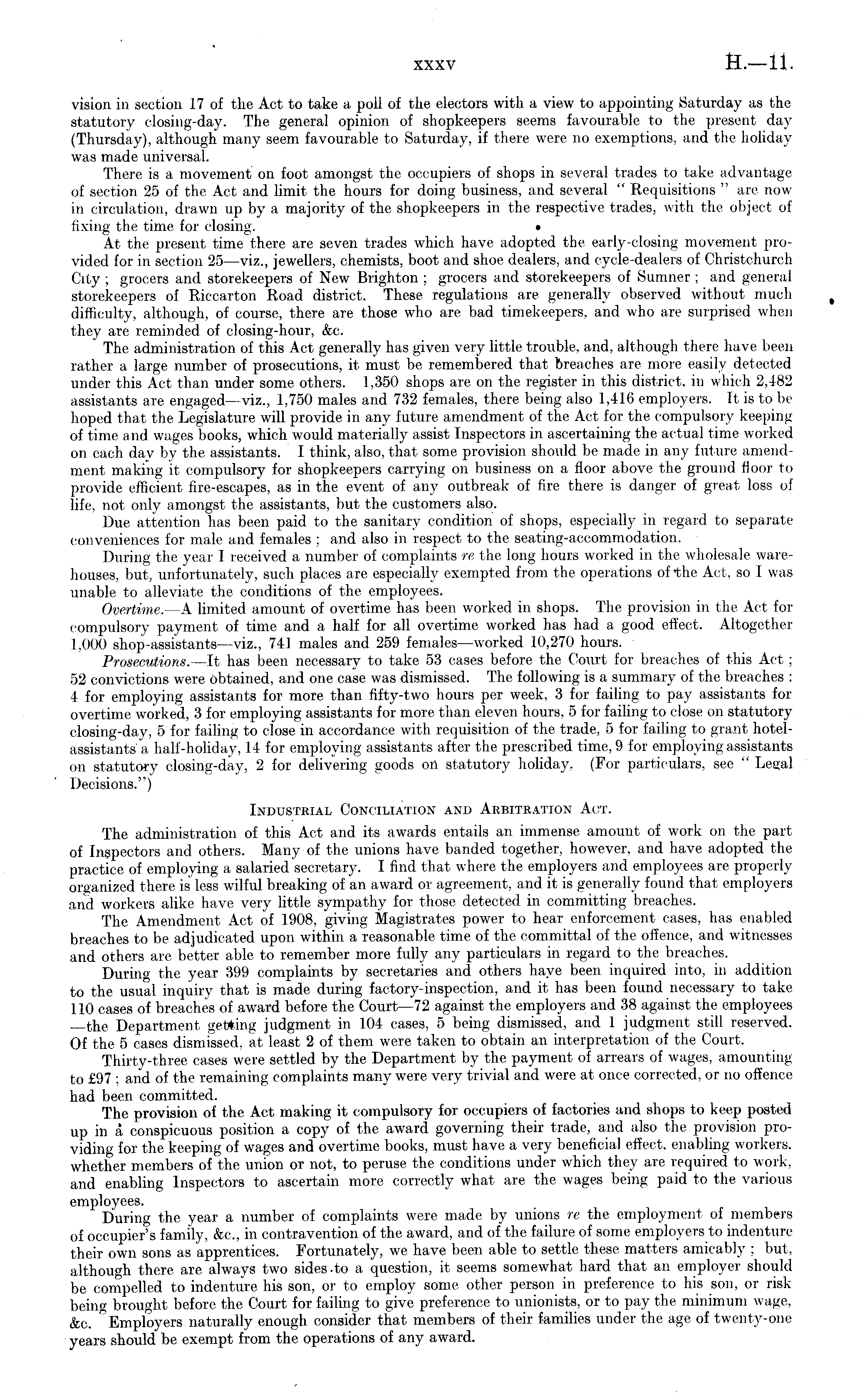 vision in section 17 of the Act to take a poll of the electors with a view to appointing Saturday as the statutory closing-day. The general opinion of shopkeepers seems favourable to the present day (Thursday), although many seem favourable to Saturday, if there were no exemptions, and the holiday was made universal. There is a movement on foot amongst the occupiers of shops in several trades to take advantage of section 25 of the Act and limit the hours for doing business, and several " Requisitions " are now in circulation, drawn up by a majority of the shopkeepers in the respective trades, with the object of fixing the time for closing. • At the present time there are seven trades which have adopted the early-closing movement provided for in section 25—viz., jewellers, chemists, boot and shoe dealers, and cycle-dealers of Christchurcli City ; grocers and storekeepers of New Brighton : grocers and storekeepers of Sumner ; and general storekeepers of Riccarton Road district. These regulations are generally observed without much # difficulty, although, of course, there are those who are bad timekeepers, and who are surprised when they are reminded of closing-hour, &c. The administration of this Act generally has given very little trouble, and, although there have been rather a large number of prosecutions, it must be remembered that breaches are more easily detected under this Act than under some others. 1,350 shops are on the register in this district, in which 2,4-82 assistants are engaged —viz., 1,750 males and 732 females, there being also 1,416 employers. It is to be hoped that the Legislature will provide in any future amendment of the Act for the compulsory keeping of time and wages books, which would materially assist Inspectors in ascertaining the actual time worked mi each day by the assistants. I think, also, that some provision should be made in any future amendment making it compulsory for shopkeepers carrying on business on a floor above the ground floor to provide efficient fire-escapes, as in the event of any outbreak of fire there is danger of great loss of life, not only amongst the assistants, but the customers also. Due attention has been paid to the sanitary condition of shops, especially in regard to separate conveniences for male and females ; and also in respect to the seating-accommodation. During the year 1 received a number of complaints re the long hours worked in the wholesale warehouses, but, unfortunately, such places are especially exempted from the operations of the Act. so 1 was unable to alleviate the conditions of the employees. Overtime,. —A limited amount of overtime has been worked in shops. The provision in the Act lor compulsory payment of time and a half for all overtime worked has had a good effect. Altogether I.(HK) shop-assistants —viz., 741 males and 259 females —worked 10,270 hours. Prosecutions. —lt has been necessary to take 53 cases before the Court for breaches of this Act ; 52 convictions were obtained, and one case was dismissed. The following is a summary of the breaches : 4 for employing assistants for more than fifty-two hours per week, 3 for failing to pay assistants for overtime worked, 3 for employing assistants for more than eleven hours, 5 for failing to close on statutory closing-day, 5 for failing to close in accordance with requisition of the trade, 5 for failing to grant hotelassistants' a half-holiday, 14 for employing assistants after the prescribed time, 9 for employing assistants on statutory closing-day, 2 for delivering goods on statutory holiday. (For particulars, see " Legal Decisions.'*) Industrial Conciliation and Arbitration Act. The administration of this Act and its awards entails an immense amount of work on the part of Inspectors and others. Many of the unions have banded together, however, and have adopted the practice of employing a salaried secretary. I find that where the employers and employees are properly organized I here is"less wilful breaking of an award or agreement, and it is generally found that employers and workers alike have very little sympathy for those detected in committing breaches. The Amendment Act of 1908, giving Magistrates power to hear enforcement cases, has enabled breaches to be adjudicated upon within a reasonable time of the committal of the offence, and witnesses and others are better able to remember more fully any particulars in regard to the breaches. During the year 399 complaints by secretaries and others have been inquired into, in addition to the usual inquiry that is made during factory-inspection, and it has been found necessary to take 110 cases of breaches of award before the Court—72 against the employers and 38 against the employees the Department getting judgment in 104 cases, 5 being dismissed, and 1 judgment still reserved. Of the 5 cases dismissed, at least 2 of them were taken to obtain an interpretation of the Court. Thirty-three cases were settled by the Department by the payment of arrears of wages, amounting to £97 : a lid of the remaining complaints many were very trivial and were at once corrected, or no offence had been committed. The provision of the Act making it compulsory for occupiers of factories and shops to keep posted up in a conspicuous position a copy of the award governing their trade, and also the provision providing for the keeping of wages and overtime books, must have a very beneficial effect, enabling workers, whether members of the union or not, to peruse the conditions under which they are required to work, and enabling Inspectors to ascertain more correctly what are the wages being paid to the various employees. During the year a number of complaints were made by unions re the employment of members of occupier's family, &c, in contravention of the award, and of the failure of some employers to indenture their own sons as apprentices. Fortunately, we have been able to settle these matters amicably ; but, although ther