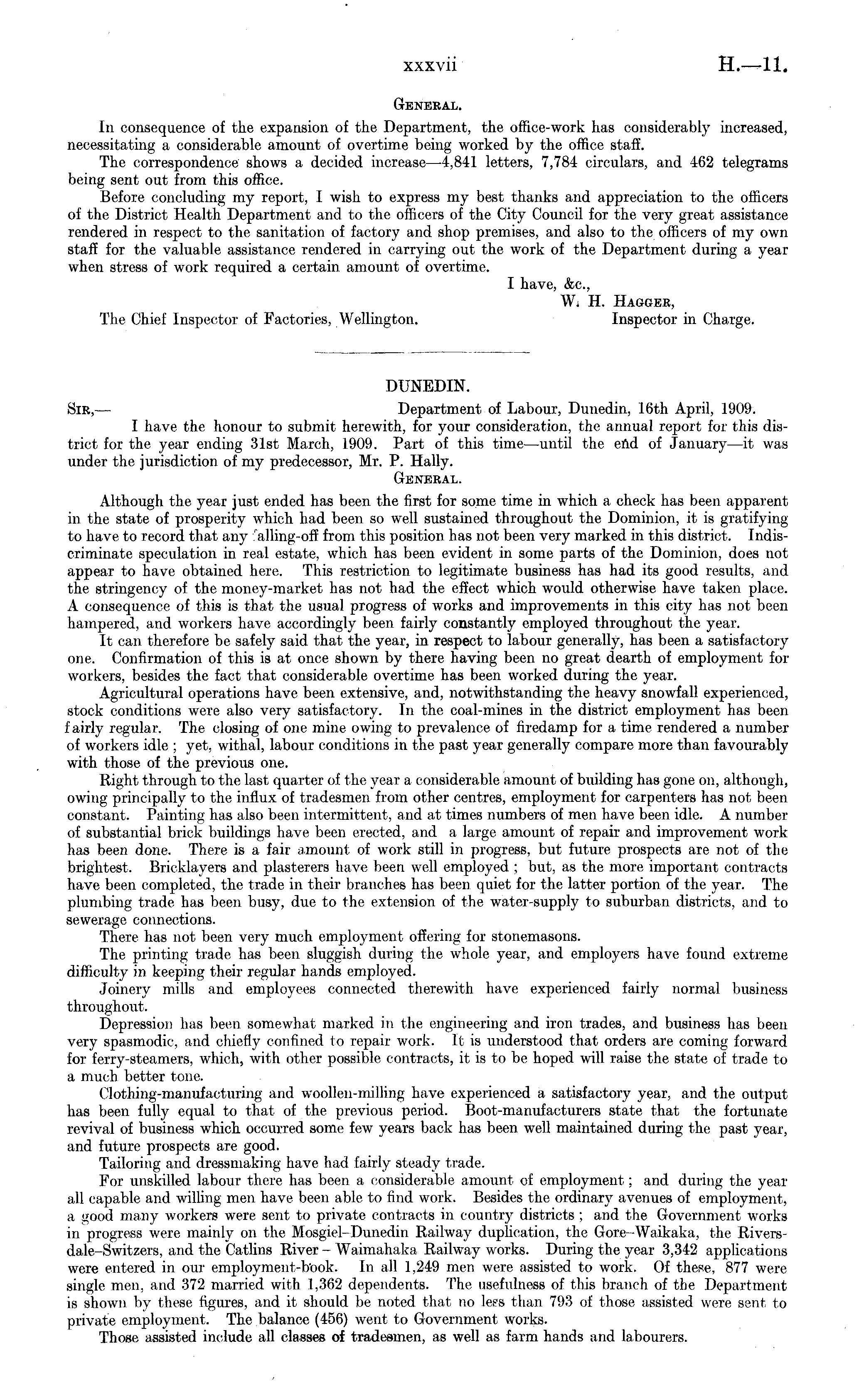 DUNEDIN. Sir, — Department of Labour, Dunedin, 16th April, 1909. I have the honour to submit herewith, for your consideration, the annual report for this district for the year ending 31st March, 1909. Part of this time—until the end of January—it was under the jurisdiction of my predecessor, Mr. P. Hally. General. Although the year just ended has been the first for some time in which a check has been apparent in the state of prosperity which had been so well sustained throughout the Dominion, it is gratifying to have to record that any falling-off from this position has not been very marked in this district. Indiscriminate speculation in real estate, which has been evident in some parts of the Dominion, does not appear to have obtained here. This restriction to legitimate business has had its good results, and the stringency of the money-market has not had the effect which would otherwise have taken place. A consequence of this is that the usual progress of works and improvements in this city has not been hampered, and workers have accordingly been fairly constantly employed throughout the year. It can therefore be safely said that the year, in respect to labour generally, has been a satisfactory one. Confirmation of this is at once shown by there having been no great dearth of employment for workers, besides the fact that considerable overtime has been worked during the year. Agricultural operations have been extensive, and, notwithstanding the heavy snowfall experienced, stock conditions were also very satisfactory. In the coal-mines in the district employment has been f airly regular. The closing of one mine owing to prevalence of firedamp for a time rendered a number of workers idle ; yet, withal, labour conditions in the past year generally compare more than favourably with those of the previous one. Right through to the last quarter of the year a considerable amount of building has gone on, although, owing principally to the influx of tradesmen from other centres, employment for carpenters has not been constant. Painting has also been intermittent, and at times numbers of men have been idle. A number of substantial brick buildings have been erected, and a large amount of repair and improvement work has been done. There is a fair amount of work still in progress, but future prospects are not of the brightest. Bricklayers and plasterers have been well employed ; but, as the more important contracts have been completed, the trade in their branches has been quiet for the latter portion of the year. The plumbing trade has been busy, due to the extension of the water-supply to suburban districts, and to sewerage connections. There has not been very much employment offering for stonemasons. The printing trade has been sluggish during the whole year, and employers have found extreme difficulty in keeping their regular hands employed. Joinery mills and employees connected therewith have experienced fairly normal business throughout. Depression has been somewhat marked in the engineering and iron trades, and business has been very spasmodic, and chiefly confined to repair work. It is understood that orders are coming forward for ferry-steamers, which, with other possible contracts, it is to be hoped will raise the state of trade to a much better tone. Clothing-manufacturing and woollen-milling have experienced a satisfactory year, and the output has been fully equal to that of the previous period. Boot-manufacturers state that the fortunate revival of business which occurred some few years back has been well maintained during the past year, and future prospects are good. Tailoring and dressmaking have had fairly steady trade. For unskilled labour there has been a considerable amount of employment; and during the year all capable and willing men have been able to find work. Besides the ordinary avenues of employment, a good many workers were sent to private contracts in country districts ; and the Government works in progress were mainly on the Mosgiel-Dunedin Railway duplication, the Gore-Waikaka, the Rivers-dale-Switzers, and the Catlins River - Waimahaka Railway works. During the year 3,342 applications were entered in our employment-book. In all 1.249 men were assisted to work. Of these, 877 were single men, and 372 married with 1,362 dependents. The usefulness of this branch of the Department is shown by these figures, and it should be noted that no lees than 793 of those assisted were sent to private employment. The balance (456) went to Government works. Those assisted include all classes of tradesmen, as well as farm hands and labourers.