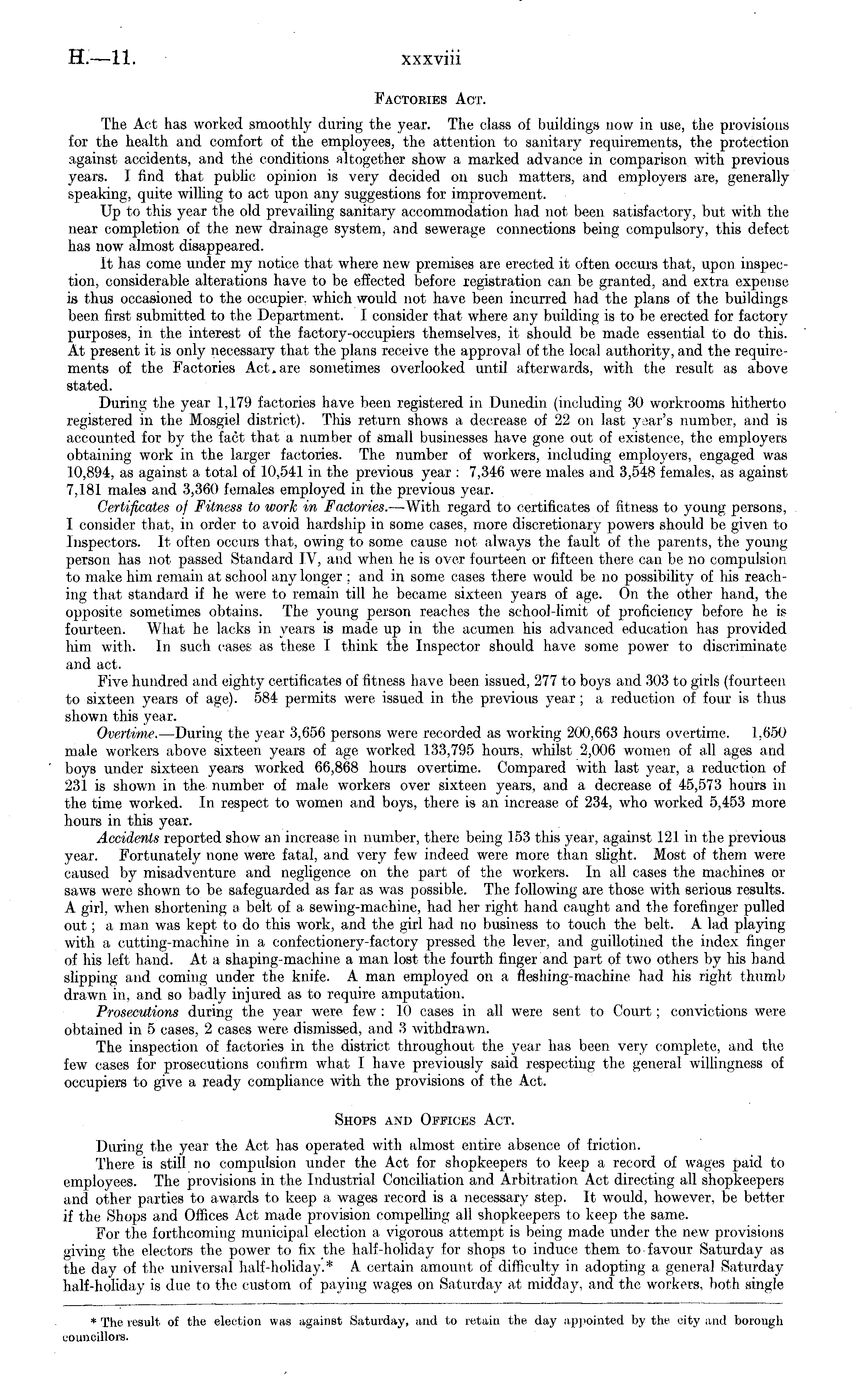 Factories Act. The Act has worked smoothly during the year. The class of buildings now in use, the provisions for the health and comfort of the employees, the attention to sanitary requirements, the protection against accidents, and the conditions altogether show a marked advance in comparison with previous years. I find that public opinion is very decided on such matters, and employers are, generally speaking, quite willing to act upon any suggestions for improvement. Up to this year the old prevailing sanitary accommodation liad not been satisfactory, but with the near completion of the new drainage system, and sewerage connections being compulsory, this defect has now almost disappeared. it has come under my notice that where new premises are erected it often occurs that, upon inspection, considerable alterations have to be effected before registration can be granted, and extra expense is thus occasioned to the occupier, which would not have been incurred had the plans of the buildings been first submitted to the Department. I consider that where any building is to be erected for factory purposes, in the interest of the factory-occupiers themselves, it should be made essential to do this. At present it is only necessary that the plans receive the approval of the local authority, and the requirements of the Factories Act.are sometimes overlooked until afterwards, with the result as above stated. During the year 1.L79 factories have been registered in Dunedin (including 30 workrooms hitherto registered in the Mosgiel district). This return shows a decrease of 22 on last year's number, and is accounted for by the fact that a number of small businesses have gone out of existence, the employers obtaining work in the larger factories. The number of workers, including employers, engaged was 10,894, as against a total of 10,541 in the previous year : 7,346 were males and 3,548 females, as against 7,181 males and 3,360 females employed in the previous year. Certificates of Fitness to work in Factories. —-With regard to certificates of fitness to young persons, I consider that, in order to avoid hardship in some cases, more discretionary powers should be given to Inspectors. It often occurs that, owing to some cause not always the fault of the parents, the young person has not passed Standard IV, and when he is over fourteen or fifteen there can be no compulsion to make him remain at school any longer ; and in some cases there would be no possibility of his reaching that standard if he were to remain till he became sixteen years of age. On the other hand, the opposite sometimes obtains. The young person reaches the school-limit of proficiency before he is fourteen. What he lacks in years is made up in the acumen his advanced education has provided him with. In such cases as these I think the Inspector should have some power to discriminate and act. Five hundred and eighty certificates of fitness have been issued, 277 to boys and 303 to girls (fourteen to sixteen years of age). 584 permits were issued in the previous year ; a reduction of four is thus shown this year. Overtime. —During the year 3,656 persons were recorded as working 200,663 hours overtime. 1,650 male workers above sixteen years of age worked 133,795 hours, whilst 2,006 women of all ages and boys under sixteen years worked 66,868 hours overtime. Compared with last year, a reduction of 231 is shown in the number of male workers over sixteen years, and a decrease of 45,573 hours in the time worked. In respect to women and boys, there is an increase of 234, who worked 5,453 more hours in this year. Accidents reported show an increase in number, there being 153 this year, against 121 in the previous year. Fortunately none were fatal, and very few indeed were more than slight. Most of them were caused by misadventure and negligence on the part of the workers. In all cases the machines or saws were shown to be safeguarded as far as was possible. The following are those with serious results. A girl, when shortening a belt of a sewing-machine, had her right hand caught and the forefinger pulled out; a man was kept to do this work, and the girl had no business to touch the belt. A lad playing with a cutting-machine in a confectionery-factory pressed the lever, and guillotined the index finger of his left hand. At a shaping-machine a man lost the fourth finger and part of two others by his hand slipping and coming under the knife. A man employed on a fleshing-machine had his right thumb drawn in, and so badly injured as to require amputation. Prosecutions during the year were few :10 cases in all were sent to Court; convictions were obtained in 5 cases, 2 cases were dismissed, and 3 withdrawn. The inspection of factories in the district throughout the year has been very complete, and the few cases for prosecutions confirm what I have previously said respecting the general willingness of occupiers to give a ready compliance with the provisions of the Act. Shops and Officks Act. During the year the Act has operated with almost entire absence of friction. There is still no compulsion under the Act for shopkeepers to keep a record of wages paid to employees. The provisions in the Industrial Conciliation and Arbitration Act directing all shopkeepers and other parties to awards to keep a wages record is a necessary step. It would, however, be better if the Shops and Offices Act made provision compelling all shopkeepers to keep the same. Fpr the forthcoming municipal election a vigorous attempt is being made under the new provisions giving the electors the power to fix the half-holiday for shops to induce them to favour Saturday as the day of the universal half-holiday.* A certain amount of difficulty in adopting a general Saturday half-holiday is due to the custom of paying wages on Saturday at midday, and the workers, both single