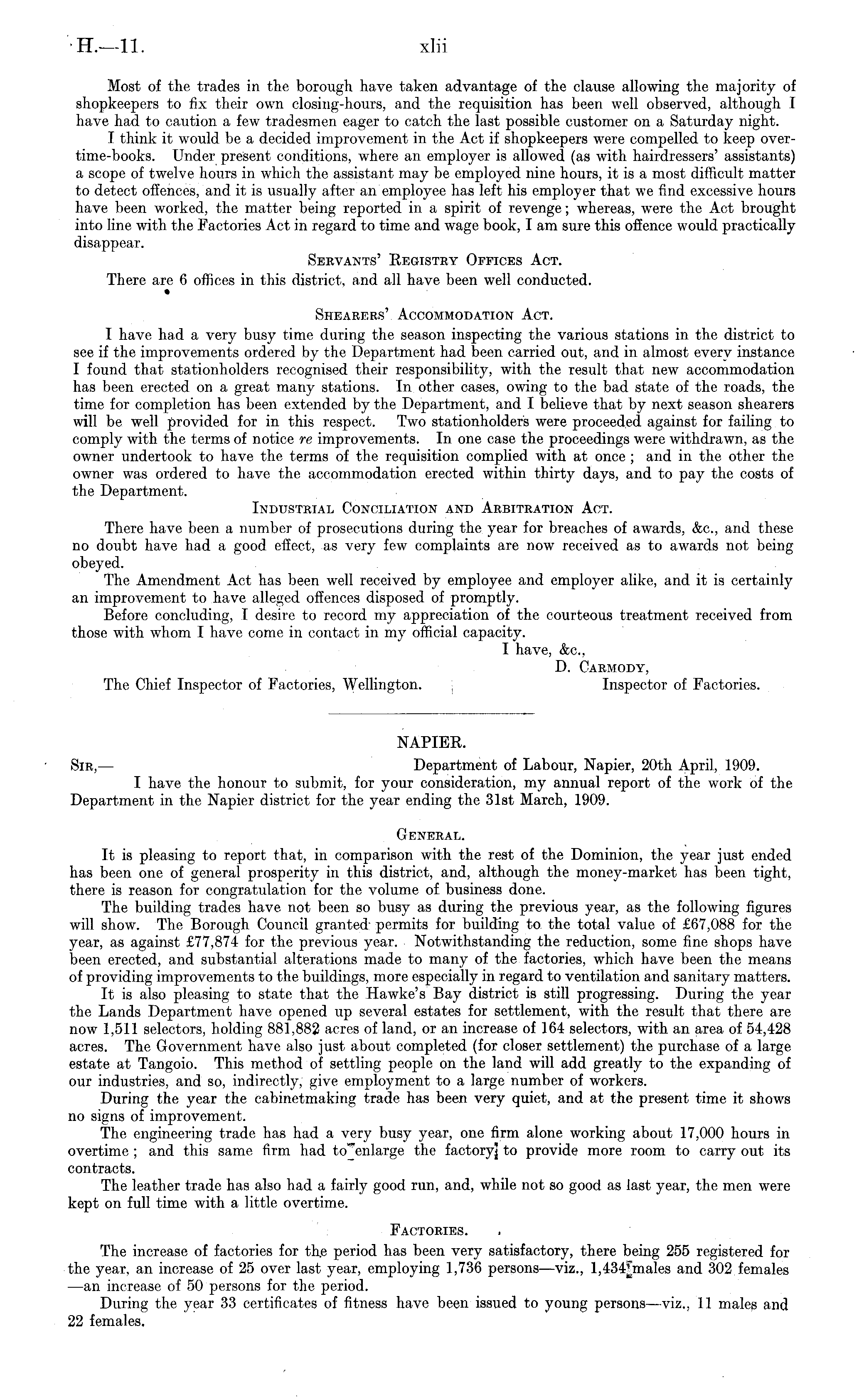 NAPIEE. Sir, — Department of Labour, Napier, 20th April, 1909. I have the honour to submit, for your consideration, my annual report of the work of the Department in the Napier district for the year ending the 31st March, 1909. General. It is pleasing to report that, in comparison with the rest of the Dominion, the year just ended has been one of general prosperity in this district, and, although the money-market has been tight, there is reason for congratulation for the volume of business done. The building trades have not been so busy as during the previous year, as the following figures will show. The Borough Council granted permits for building to the total value of £67,088 for the year, as against £77,874 for the previous year. Notwithstanding the reduction, some fine shops have been erected, and substantial alterations made to many of the factories, which have been the means of providing improvements to the buildings, more especially in regard to ventilation and sanitary matters. It is also pleasing to state that the Hawke's Bay district is still progressing. During the year the Lands Department have opened up several estates for settlement, with the result that there are now 1,511 selectors, holding 881,882 acres of land, or an increase of 164 selectors, with an area of 54,428 acres. The Government have also just about completed (for closer settlement) the purchase of a large estate at Tangoio. This method of settling people on the land will add greatly to the expanding of our industries, and so, indirectly, give employment to a large number of workers. During the year the cabinetmaking trade has been very quiet, and at the present time it shows no signs of improvement. The engineering trade has had a very busy year, one firm alone working about 17,000 hours in overtime ; and this same firm had the factory] to provide more room to carry out its contracts. The leather trade has also had a fairly good run, and, while not so good as last year, the men were kept on full time with a little overtime. Factories. , The increase of factories for th,e period has been very satisfactory, there being 255 registered for the year, an increase of 25 over last year, employing 1,736 persons—viz., and 302 females —an increase of 50 persons for the period. During the year 33 certificates of fitness have been issued to young persons —viz., 11 males and 22 females.