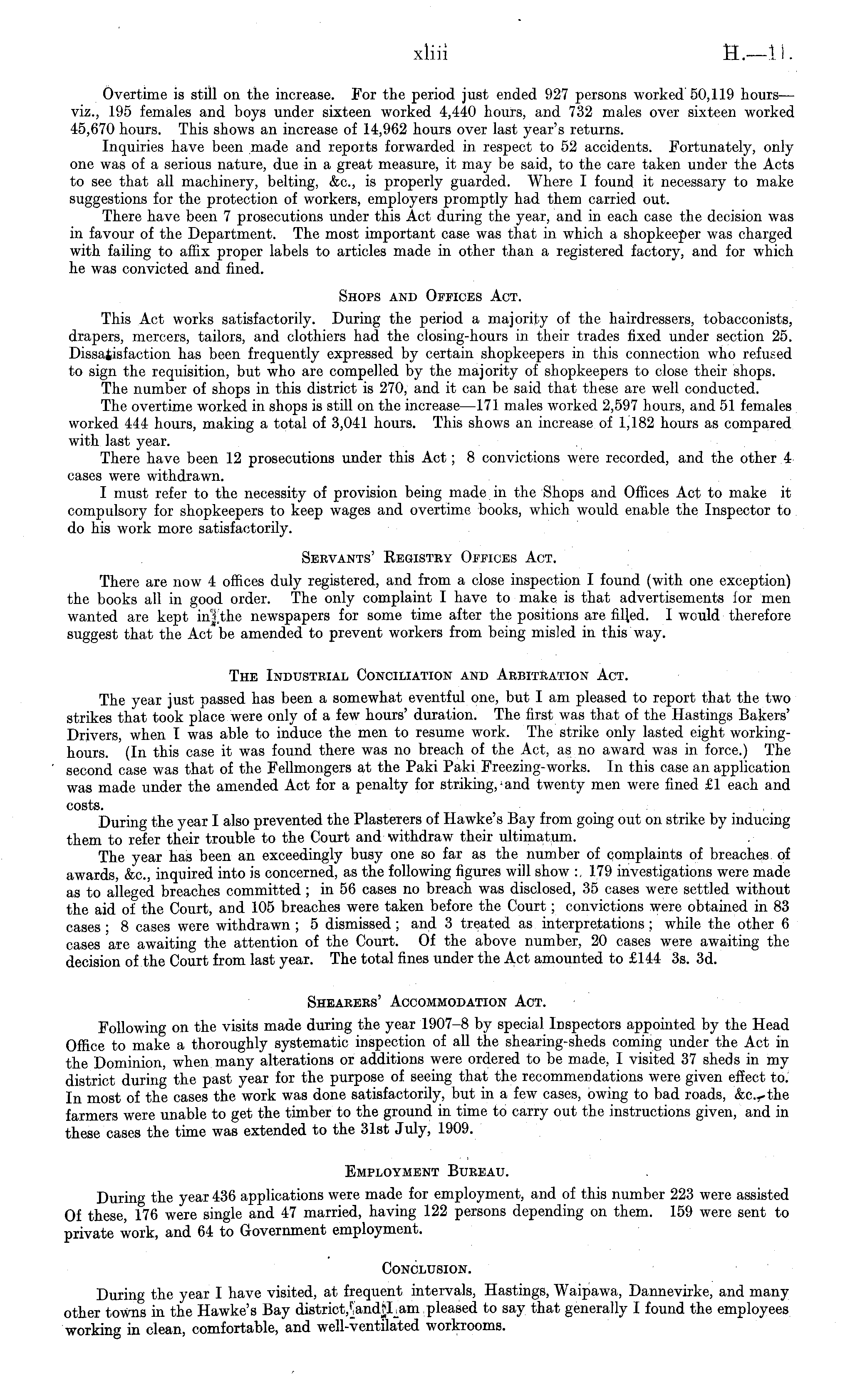 Overtime is still on the increase. For the period just ended 927 persons worked 50,119 hours— viz., 195 females and boys under sixteen worked 4,440 hours, and 732 males over sixteen worked 45,670 hours. This shows an increase of 14,962 hours over last year's returns. Inquiries have been made and reports forwarded in respect to 52 accidents. Fortunately, only one was of a serious nature, due in a great measure, it may be said, to the care taken under the Acts to see that all machinery, belting, &c, is properly guarded. Where I found it necessary to make suggestions for the protection of workers, employers promptly had them carried out. There have been 7 prosecutions under this Act during the year, and in each case the decision was in favour of the Department. The most important case was that in which a shopkeeper was charged with failing to affix proper labels to articles made in other than a registered factory, and for which he was convicted and fined. Shops and Offices Act. This Act works satisfactorily. During the period a majority of the hairdressers, tobacconists, drapers, mercers, tailors, and clothiers had the closing-hours in their trades fixed under section 25. Dissatisfaction has been frequently expressed by certain shopkeepers in this connection who refused to sign the requisition, but who are compelled by the majority of shopkeepers to close their shops. The number of shops in this district is 270, and it can be said that these are well conducted. The overtime worked in shops is still on the increase—l7l males worked 2,597 hours, and 51 females worked 444 hours, making a total of 3,041 hours. This shows an increase of 1,182 hours as compared with last year. There have been 12 prosecutions under this Act; 8 convictions were recorded, and the other 4 cases were withdrawn. I must refer to the necessity of provision being made in the Shops and Offices Act to make it compulsory for shopkeepers to keep wages and overtime books, which would enable the Inspector to do his work more satisfactorily. Servants' Kegistby Offices Act. There are now 4 offices duly registered, and from a close inspection I found (with one exception) the books all in good order. The only complaint I have to make is that advertisements for men wanted are kept inTthe newspapers for some time after the positions are filled. I would therefore suggest that the Act be amended to prevent workers from being misled in this way. The Industbial Conciliation and Arbitration Act. The year just passed has been a somewhat eventful one, but I am pleased to report that the two strikes that took place were only of a few hours' duration. The first was that of the Hastings Bakers' Drivers, when I was able to induce the men to resume work. The strike only lasted eight workinghours. (In this case it was found there was no breach of the Act, as no award was in force.) The second case was that of the Fellmongers at the Paki Paki Freezing-works. In this case an application was made under the amended Act for a penalty for striking, and twenty men were fined £1 each and costs. During the year I also prevented the Plasterers of Hawke's Bay from going out on strike by inducing them to refer their trouble to the Court and withdraw their ultimatum. The year has been an exceedingly busy one so far as the number of complaints of breaches, of awards, &c, inquired into is concerned, as the following figures will show :, 179 investigations were made as to alleged breaches committed ; in 56 cases no breach was disclosed, 35 cases were settled without the aid of the Court, and 105 breaches were taken before the Court; convictions were obtained in 83 cases ; 8 cases were withdrawn ; 5 dismissed ; and 3 treated as interpretations ; while the other 6 cases are awaiting the attention of the Court. Of the above number, 20 cases were awaiting the decision of the Court from last year. The total fines under the Act amounted to £144 3s. 3d. Shearers' Accommodation Act. Following on the visits made during the year 1907-8 by special Inspectors appointed by the Head Office to make a thoroughly systematic inspection of all the shearing-sheds coming under the Act in the Dominion, when many alterations or additions were ordered to be made, I visited 37 sheds in my district during the past year for the purpose of seeing that the recommendations were given effect to. In most of the cases the work was done satisfactorily, but in a few cases, owing to bad roads, &c.,-tlie farmers were unable to get the timber to the ground in time to carry out the instructions given, and in these cases the time was extended to the 31st July, 1909. Employment Bureau. During the year 436 applications were made for employment, and of this number 223 were assisted Of these, 176 were single and 47 married, having 122 persons depending on them. 159 were sent to private work, and 64 to Government employment. Conclusion. During the year I have visited, at frequent intervals, Hastings, Waipawa, Dannevirke, and many other towns in the Hawke's Bay district,^andjLam,pleased to say that generally I found the employees working in clean, comfortable, and well-ventilated workrooms.