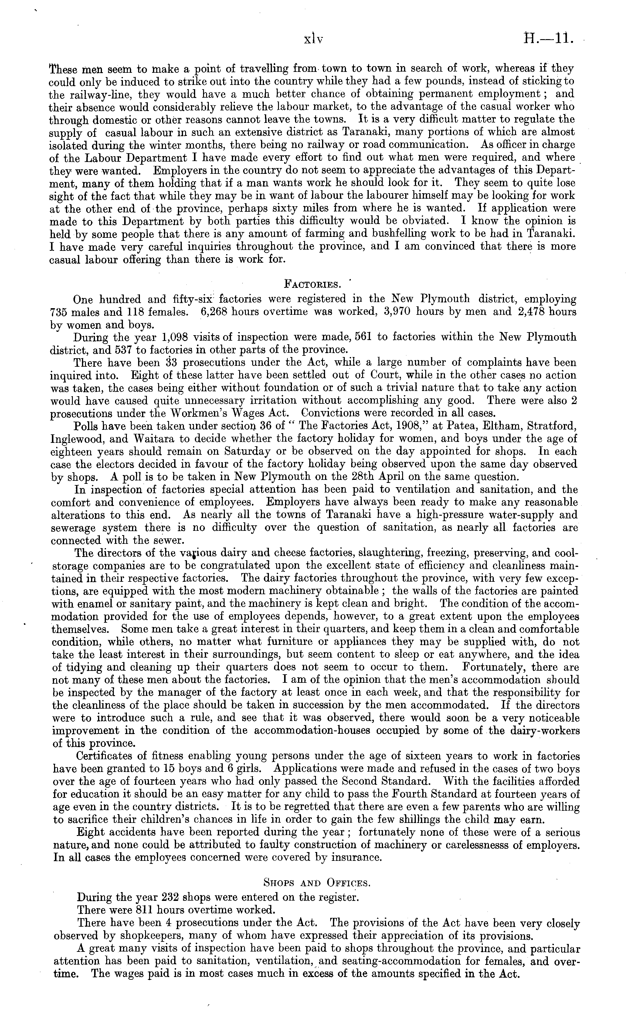 These men seem to make a point of travelling from town to town in search of work, whereas if they could only be induced to strike out into the country while they had a few pounds, instead of sticking to the railway-line, they would have a much better chance of obtaining permanent employment; and their absence would considerably relieve the labour market, to the advantage of the casual worker who through domestic or other reasons cannot leave the towns. It is a very difficult matter to regulate the supply of casual labour in such an extensive district as Taranaki, many portions of which are almost isolated during the winter months, there being no railway or road communication. As officer in charge of the Labour Department I have made every effort to find out what men were required, and where they were wanted. Employers in the country do not seem to appreciate the advantages of this Department, many of them holding that if a man wants work he should look for it. They seem to quite lose sight of the fact that while they may be in want of labour the labourer himself may be looking for work at the other end of the province, perhaps sixty miles from where he is wanted. If application were made to this Department by both parties this difficulty would be obviated. I know the opinion is held by some people that there is any amount of farming and bushfelling work to be had in Taranaki. I have made very careful inquiries throughout the province, and I am convinced that there is more casual labour offering than there is work for. Factories. One hundred and fifty-six factories were registered in the New Plymouth district, employing 735 males and 118 females. 6,268 hours overtime was worked, 3,970 hours by men and 2,478 hours by women and boys. During the year 1,098 visits of inspection were made, 561 to factories within the New Plymouth district, and 537 to factories in other parts of the province. There have been 33 prosecutions under the Act, while a large number of complaints have been inquired into. Eight of these latter have been settled out of Court, while in the other cases no action was taken, the cases being either without foundation or of such a trivial nature that to take any action would have caused quite unnecessary irritation without accomplishing any good. There were also 2 prosecutions under the Workmen's Wages Act. Convictions were recorded in all cases. Polls have been taken under section 36 of " The Factories Act, 1908," at Patea, Eltham, Stratford, Inglewood, and Waitara to decide whether the factory holiday for women, and boys under the age of eighteen years should remain on Saturday or be observed on the day appointed for shops. In each case the electors decided in favour of the factory holiday being observed upon the same day observed by shops. A poll is to be taken in New Plymouth on the 28th April on the same question. In inspection of factories special attention has been paid to ventilation and sanitation, and the comfort and convenience of employees. Employers have always been ready to make any reasonable alterations to this end. As nearly all the towns of Taranaki have a high-pressure water-supply and sewerage system there is no difficulty over the question of sanitation, as nearly all factories are connected with the sewer. The directors of the various dairy and cheese factories, slaughtering, freezing, preserving, and coolstorage companies are to be congratulated upon the excellent state of efficiency and cleanliness maintained in their respective factories. The dairy factories throughout the province, with very few exceptions, are equipped with the most modern machinery obtainable ; the walls of the factories are painted with enamel or sanitary paint, and the machinery is kept clean and bright. The condition of the accommodation provided for the use of employees depends, however, to a great extent upon the employees themselves. Some men take a great interest in their quarters, and keep them in a clean and comfortable condition, while others, no matter what furniture or appliances they may be supplied with, do not take the least interest in their surroundings, but seem content to sleep or eat anywhere, and the idea of tidying and cleaning up their quarters does not seem to occur to them. Fortunately, there are not many of these men about the factories. lam of the opinion that the men's accommodation should be inspected by the manager of the factory at least once in each week, and that the responsibility for the cleanliness of the place should be taken in succession by the men accommodated. If the directors were to introduce such a rule, and see that it was observed, there would soon be a very noticeable improvement in the condition of the accommodation-houses occupied by some of the dairy-workers of this province. Certificates of fitness enabling young persons under the age of sixteen years to work in factories have been granted to 15 boys and 6 girls. Applications were made and refused in the cases of two boys over the age of fourteen years who had only passed the Second Standard. With the facilities afforded for education it should be an easy matter for any child to pass the Fourth Standard at fourteen years of age even in the country districts. It is to be regretted that there are even a few parents who are willing to sacrifice their children's chances in life in order to gain the few shillings the child may earn. Eight accidents have been reported during the year ; fortunately none of these were of a serious nature, and none could be attributed to faulty construction of machinery or carelessnesss of employers. In all cases the employees concerned were covered by insurance. Shops and Offices. During the year 232 shops were entered on the register. There were 811 hours overtime worked. There have been 4 prosecutions under the Act. The provisions of the Act have been very closely observed by shopkeepers, many of whom have expressed their appreciation of its provisions. 