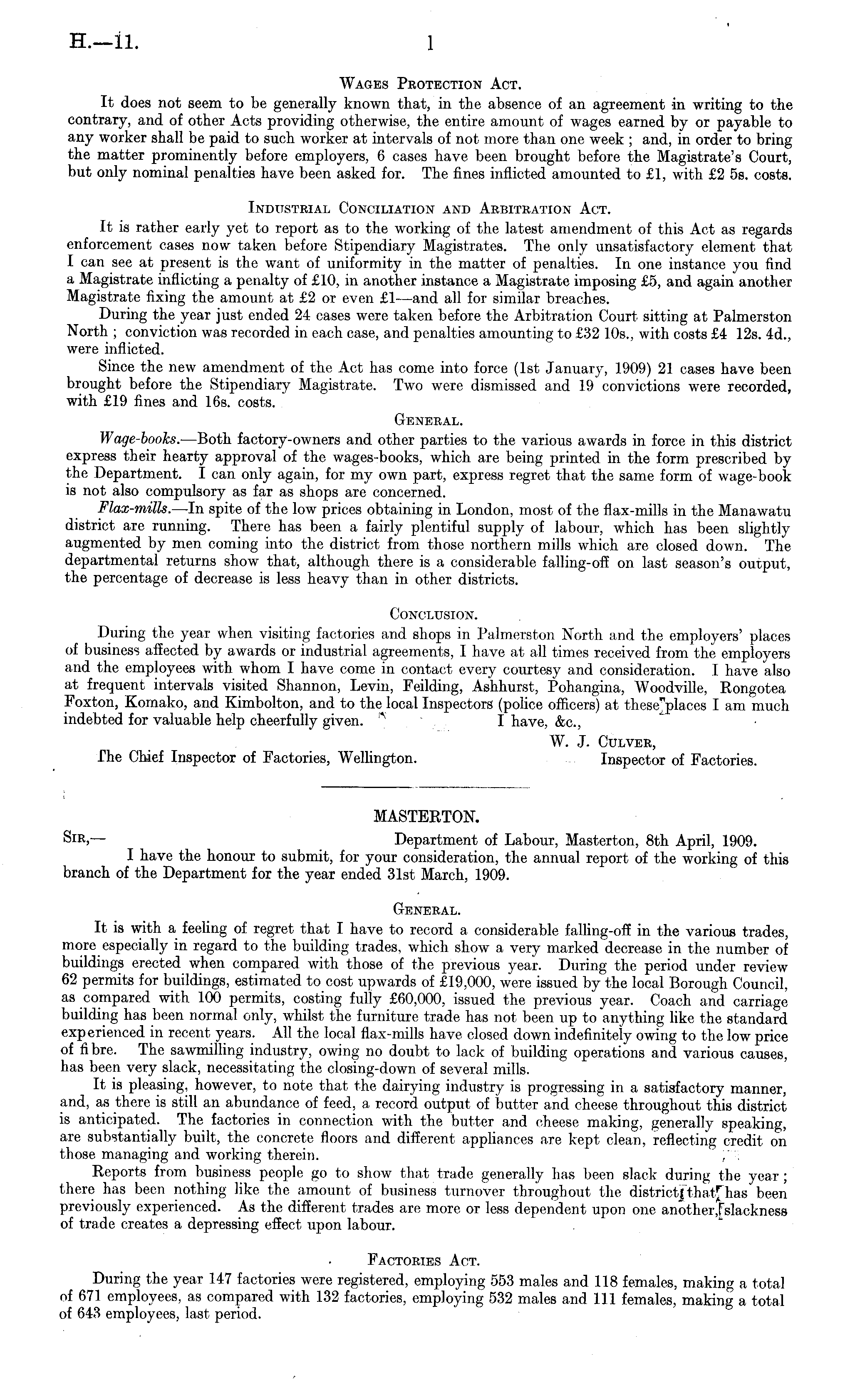 MASTERTON. Sir, — Department of Labour, Masterton, Bth April, 1909. I have the honour to submit, for your consideration, the annual report of the working of this branch of the Department for the year ended 31st March, 1909. General. It is with a feeling of regret that I have to record a considerable falling-off in the various trades, more especially in regard to the building trades, which show a very marked decrease in the number of buildings erected when compared with those of the previous year. During the period under review 62 permits for buildings, estimated to cost upwards of £19,000, were issued by the local Borough Council, as compared with 100 permits, costing fully £60,000, issued the previous year. Coach and carriage building has been normal only, whilst the furniture trade has not been up to anything like the standard experienced in recent years. All the local flax-mills have closed down indefinitely owing to the low price of fibre. The sawmilling industry, owing no doubt to lack of building operations and various causes, has been very slack, necessitating the closing-down of several mills. It is pleasing, however, to note that the dairying industry is progressing in a satisfactory manner, and, as there is still an abundance of feed, a record output of butter and cheese throughout this district is anticipated. The factories in connection with the butter and cheese making, generally speaking, are substantially built, the concrete floors and different appliances are kept clean, reflecting credit on those managing and working therein. Reports from business people go to show that trade generally has been slack during the year; there has been nothing like the amount of business turnover throughout the district;"thatj"has been previously experienced. As the different trades are more or less dependent upon one anotherjslacknese of trade creates a depressing effect upon labour. Factories Act. During the year 147 factories were registered, employing 553 males and 118 females, making a total of 671 employees, as compared with 132 factories, employing 532 males and 111 females, making a total of 643 employees, last period.
