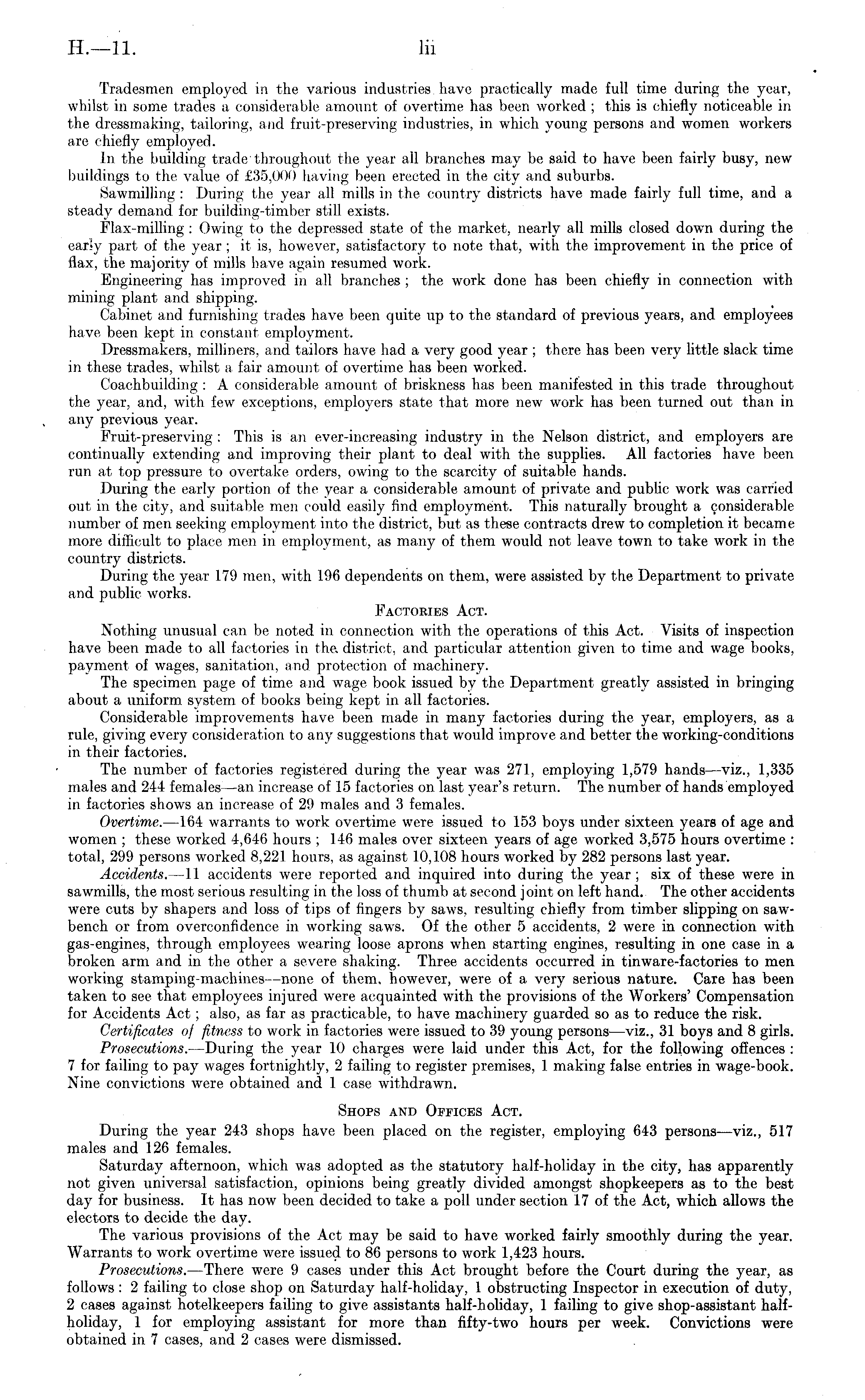 Tradesmen employed in the various industries have practically made full time during the year, whilst in some trades a considerable amount of overtime has been worked ; this is chiefly noticeable in the dressmaking, tailoring, and fruit-preserving industries, in which young persons and women workers are chiefly employed. in the building trade throughout the vcar all branches may be said to have been fairly busy, new buildings to the value of £35,000 having been erected in the city and suburbs. Sawmilling : During the year all mills in the country districts have made fairly full time, and a steady demand for building-timber still exists. Flax-milling : Owing to the depressed state of the market, nearly all mills closed down during the early part of the year ; it is, however, satisfactory to note that, with the improvement in the price of flax, the majority of mills have again resumed work. Engineering has improved in all branches ; the work done has been chiefly in connection with mining plant and shipping. Cabinet and furnishing trades have been quite up to the standard of previous years, and employees have been kept in constant employment. Dressmakers, milliners, and tailors have had a very good year ; there has been very little slack time in these trades, whilst a, fair amount of overtime has been worked. Coachbuilding : A considerable amount of briskness has been manifested in this trade throughout the year, and, with few exceptions, employers state that more new work has been turned out than in any previous year. Fruit-preserving : This is an ever-increasing industry in the Nelson district, and employers are continually extending and improving their plant to deal with the supplies. All factories have been run at top pressure to overtake orders, owing to the scarcity of suitable hands. During the early portion of the year a considerable amount of private and public work was carried out in the city, and suitable men could easily find employment. This naturally brought a considerable number of men seeking employment into the district, but as these contracts drew to completion it became more difficult to place men in employment, as many of them would not leave town to take work in the country districts. During the year 179 men, with 196 dependents on them, were assisted by the Department to private and public works. Factories Act. Nothing unusual can be noted in connection with the operations of this Act. Visits of inspection have been made to all factories in the. district, and particular attention given to time and wage books, payment of wages, sanitation, and protection of machinery. The specimen page of time and wage book issued by the Department greatly assisted in bringing about a uniform system of books being kept in all factories. Considerable improvements have been made in many factories during the year, employers, as a rule, giving every consideration to any suggestions that would improve and better the working-conditions in their factories. The number of factories registered during the year was 271, employing 1,579 hands—viz., 1,335 males and 244 females—an increase of 15 factories on last year's return. The number of hands employed in factories shows an increase of 29 males and 3 females. Overtime. —164 warrants to work overtime were issued to 153 boys under sixteen years of age and women ; these worked 4,646 hours ; 146 males over sixteen years of age worked 3,575 hours overtime : total, 299 persons worked 8,221 hours, as against 10,108 hours worked by 282 persons last year. Accidents. —ll accidents were reported and inquired into during the year; six of these were in sawmills, the most serious resulting in the loss of thumb at second joint on left hand. The other accidents were cuts by shapers and loss of tips of fingers by saws, resulting chiefly from timber slipping on sawbench or from overconfidence in working saws. Of the other 5 accidents, 2 were in connection with gas-engines, through employees wearing loose aprons when starting engines, resulting in one case in a broken arm and in the other a severe shaking. Three accidents occurred in tinware-factories to men working stamping-machines—none of them, however, were of a very serious nature. Care has been taken to see that employees injured were acquainted with the provisions of the Workers' Compensation for Accidents Act; also, as far as practicable, to have machinery guarded so as to reduce the risk. Certificates of fitness to work in factories were issued to 39 young persons—viz., 31 boys and 8 girls. Prosecutions. —During the year 10 charges were laid under this Act, for the following offences : 7 for failing to pay wages fortnightly, 2 failing to register premises, 1 making false entries in wage-book. Nine convictions were obtained and 1 case withdrawn. Shops and Offices Act. During the year 243 shops have been placed on the register, employing 643 persons—viz., 517 males and 126 females. Saturday afternoon, which was adopted as the statutory half-holiday in the city, has apparently not given universal satisfaction, opinions being greatly divided amongst shopkeepers as to the best day for business. It has now been decided to take a poll under section 17 of the Act, which allows the electors to decide the day. The various provisions of the Act may be said to have worked fairly smoothly during the year. Warrants to work overtime were issued to 86 persons to work 1,423 hours. Prosecutions. —There were 9 cases under this Act brought before the Court during the year, as follows : 2 failing to close shop on Saturday half-holiday, 1 obstructing Inspector in execution of duty, 2 cases against hotelkeepers failing to give assistants half-holiday, 1 failing to give shop-assistant halfholiday, 1 for employing assistant for more than fifty-two hours per week. Convictions were obtained in 7 cases, and 2 cases were dismissed.