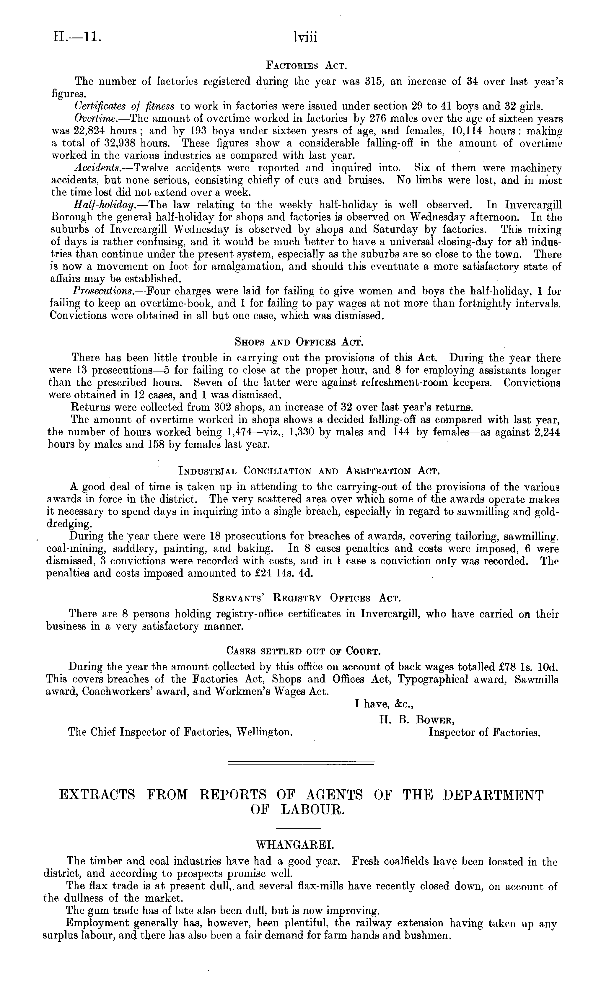 Factories Act. The number of factories registered during the year was 315, an increase of 34 over last year's figures. Certificates of fitness to work in factories were issued under section 29 to 41 boys and 32 girls. Overtime. —The amount of overtime worked in factories by 276 males over the age of sixteen years was 22,824 hours ; and by 193 boys under sixteen years of age, and females, 10,114 hours : making a total of 32,938 hours. These figures show a considerable falling-off in the amount of overtime worked in the various industries as compared with last year. Accidents. —Twelve accidents were reported and inquired into. Six of them were machinery accidents, but none serious, consisting chiefly of cuts and bruises. No limbs were lost, and in most the time lost did not extend over a week. Half-holiday. —The law relating to the weekly half-holiday is well observed. In Invcrcargill Borough the general half-holiday for shops and factories is observed on Wednesday afternoon. In the suburbs of Invercargill Wednesday is observed by shops and Saturday by factories. This mixing of days is rather confusing, and it would be much better to have a universal closing-day for all industries than continue under the present system, especially as the suburbs are so close to the town. There is now a movement on foot for amalgamation, and should this eventuate a more satisfactory state of affairs may be established. Prosecutions. —Four charges were laid for failing to give women and boys the half-holiday, 1 for failing to keep an overtime-book, and 1 for failing to pay wages at not more than fortnightly intervals. Convictions were obtained in all but one case, which was dismissed. Shops and Offices Act. There has been little trouble in carrying out the provisions of this Act. During the year there were 13 prosecutions—s for failing to close at the proper hour, and 8 for employing assistants longer than the prescribed hours. Seven of the latter were against refreshment-room keepers. Convictions were obtained in 12 cases, and 1 was dismissed. Eeturns were collected from 302 shops, an increase of 32 over last year's returns. The amount of overtime worked in shops shows a decided falling-off as compared with last year, the number of hours worked being 1,474 —viz., 1,330 by males and 144 by females—as against 2,244 hours by males and 158 by females last year. Industrial Conciliation and Arbitration Act. A good deal of time is taken up in attending to the carrying-out of the provisions of the various awards in force in the district. The very scattered area over which some of the awards operate makes it necessary to spend days in inquiring into a single breach, especially in regard to sawmilling and golddredging. During the year there were 18 prosecutions for breaches of awards, covering tailoring, sawmilling, coal-mining, saddlery, painting, and baking. In 8 cases penalties and costs were imposed, 6 were dismissed, 3 convictions were recorded with costs, and in 1 case a conviction only was recorded. The penalties and costs imposed amounted to £24 14s. 4d. Servants' Registry Offices Act. There are 8 persons holding registry-office certificates in Invercargill, who have carried on their business in a very satisfactory manner. Cases settled out of Court. During the year the amount collected by this office on account of back wages totalled £78 Is. 10d. This covers breaches of the Factories Act, Shops and Offices Act, Typographical award, Sawmills award, Coachworkers' award, and Workmen's Wages Act. I have, &c, H. B. Bower, The Chief Inspector of Factories, Wellington. Inspector of Factories.