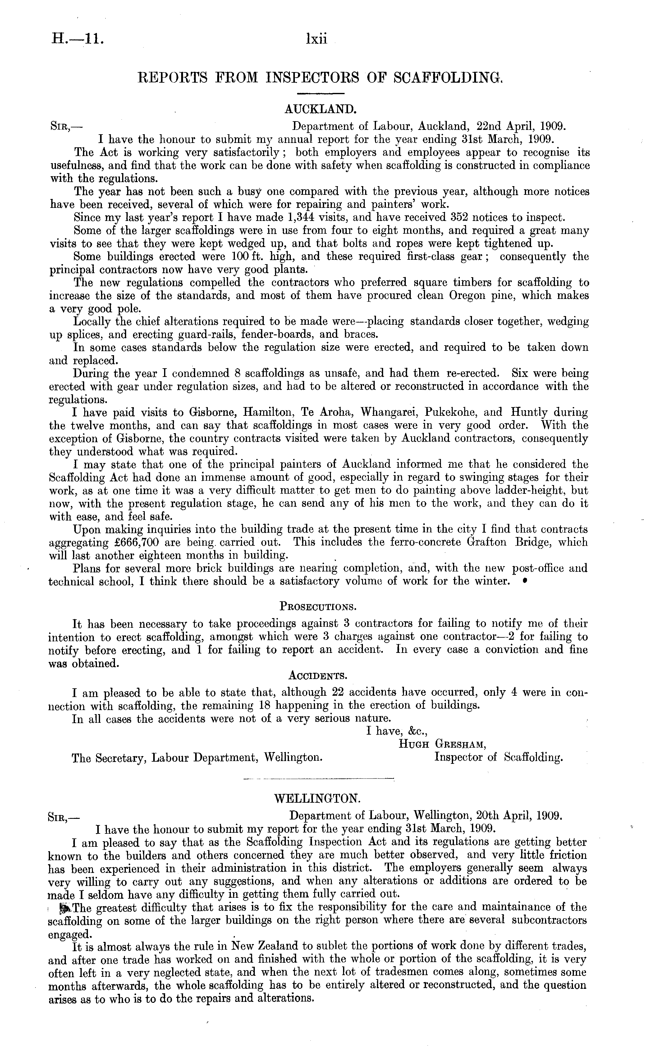 WELLINGTON. Sir,— Department of Labour, Wellington, 20th April, 1909. I have the honour to submit my report for the year ending 31st March, 1909. I am pleased to say that as the Scaffolding Inspection Act and its regulations are getting better known to the builders and others concerned they are much better observed, and very little friction has been experienced in their administration in this district. The employers generally seem always very willing to carry out any suggestions, and when any alterations or additions are ordered to be made I seldom have any difficulty in getting them fully carried out. IjkThe greatest difficulty that arises is to fix the responsibility for the care and maintainance of the scaffolding on some of the larger buildings on the right person where there are several subcontractors engaged. It is almost always the rule in New Zealand to sublet the portions of work done by different trades, and after one trade has worked on and finished with the whole or portion of the scaffolding, it is very often left in a very neglected state, and when the next lot of tradesmen comes along, sometimes some months afterwards, the whole scaffolding has to be entirely altered or reconstructed, and the question arises as to who is to do the repairs and alterations.