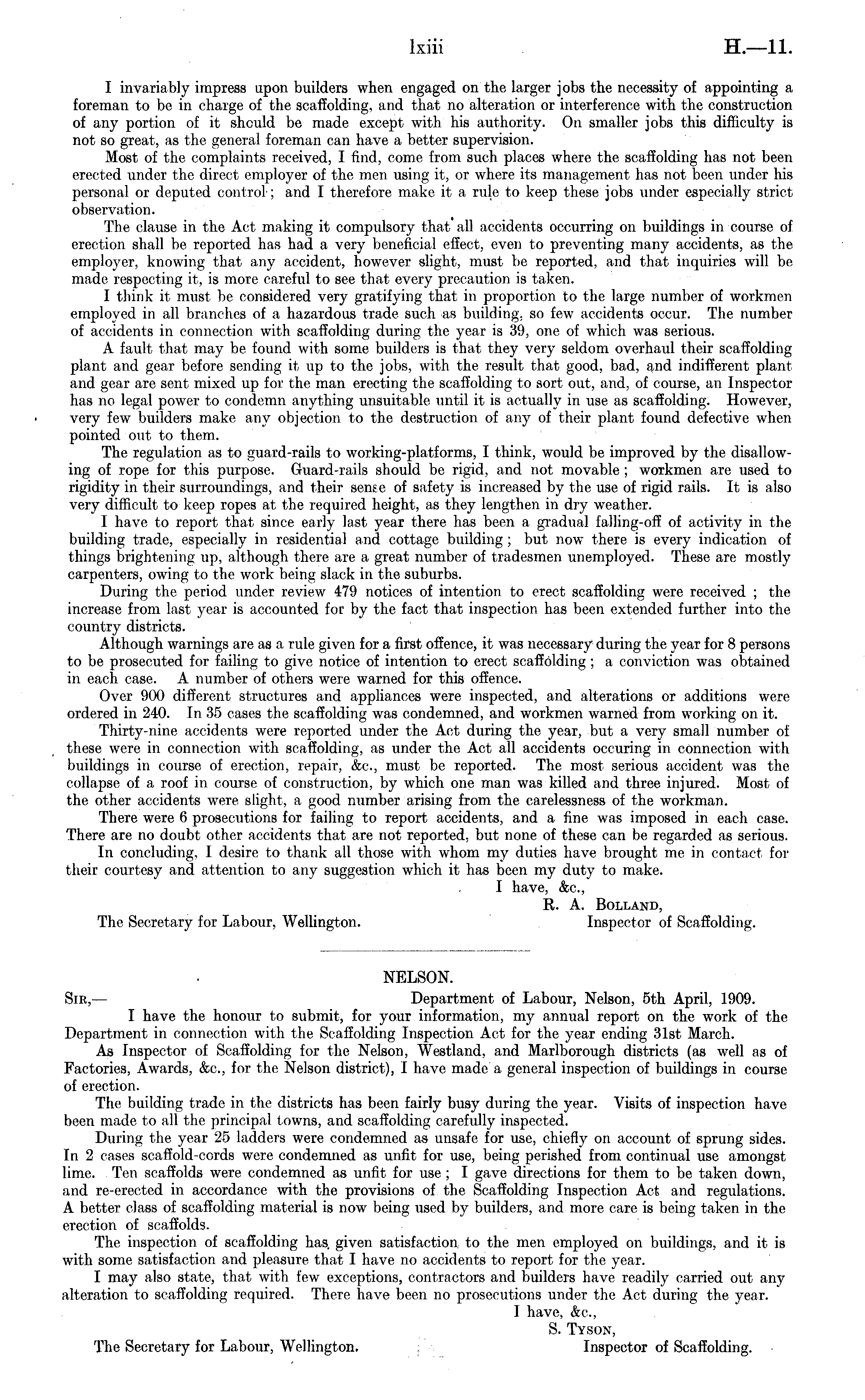 NELSON. Sir, — Department of Labour, Nelson, sth April, 1909. I have the honour to submit, for your information, my annual report on the work of the Department in connection with the Scaffolding Inspection Act for the year ending 31st March. As Inspector of Scaffolding for the Nelson, Westland, and Marlborough districts (as well as of Factories, Awards, &c, for the Nelson district), I have made a general inspection of buildings in course of erection. The building trade in the districts has been fairly busy during the year. Visits of inspection have been made to all the principal towns, and scaffolding carefully inspected. During the year 25 ladders were condemned as unsafe for use, chiefly on account of sprung sides. In 2 cases scaffold-cords were condemned as unfit for use, being perished from continual use amongst lime. Ten scaffolds were condemned as unfit for use ; I gave directions for them to be taken down, and re-erected in accordance with the provisions of the Scaffolding Inspection Act and regulations. A better class of scaffolding material is now being used by builders, and more care is being taken in the erection of scaffolds. The inspection of scaffolding has. given satisfaction to the men employed on buildings, and it is with some satisfaction and pleasure that I have no accidents to report for the year. I may also state, that with few exceptions, contractors and builders have readily carried out any alteration to scaffolding required. There have been no prosecutions under the Act during the year. I have, &c, S. Tyson, The Secretary for Labour, Wellington. Inspector of Scaffolding.